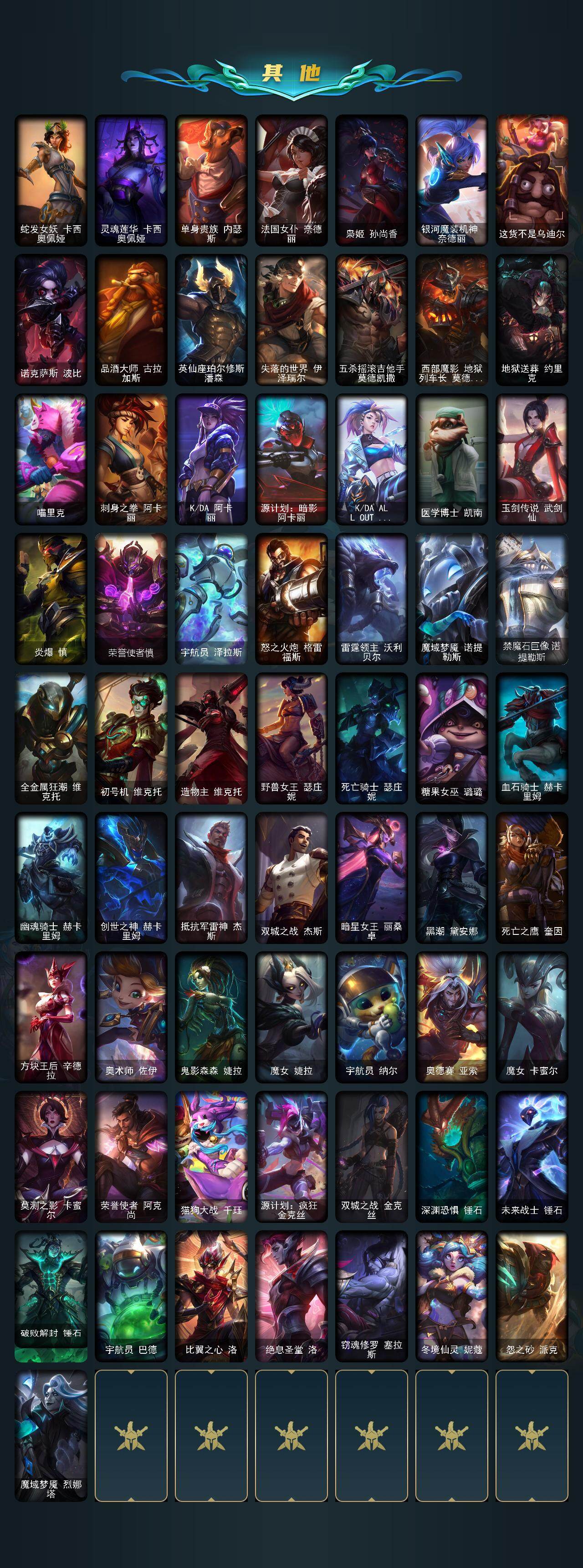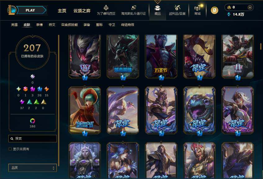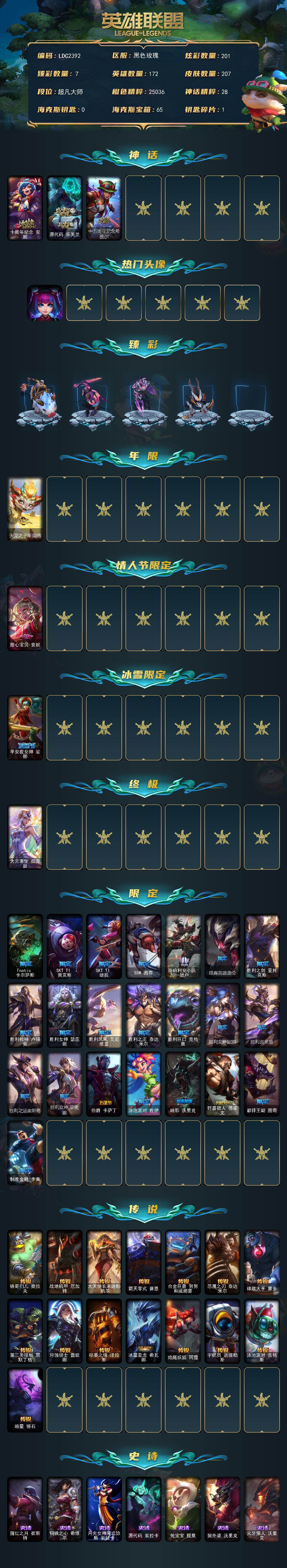172英雄/207皮肤/1终极/3神话/26限定/7臻彩/201炫彩/15传说/37史诗/大师/十周年纪念安妮/