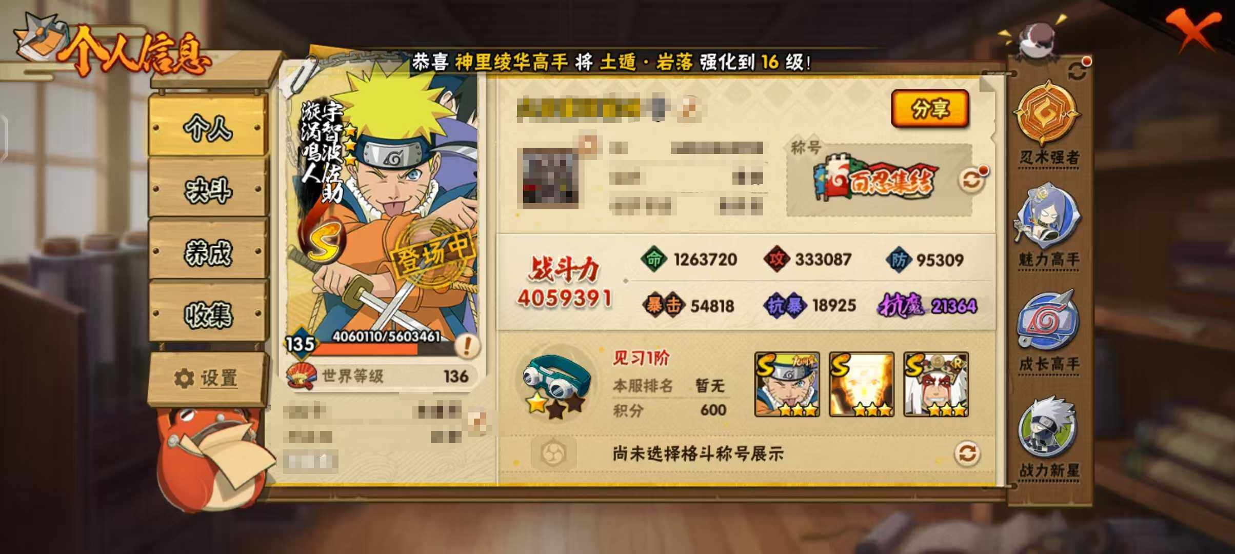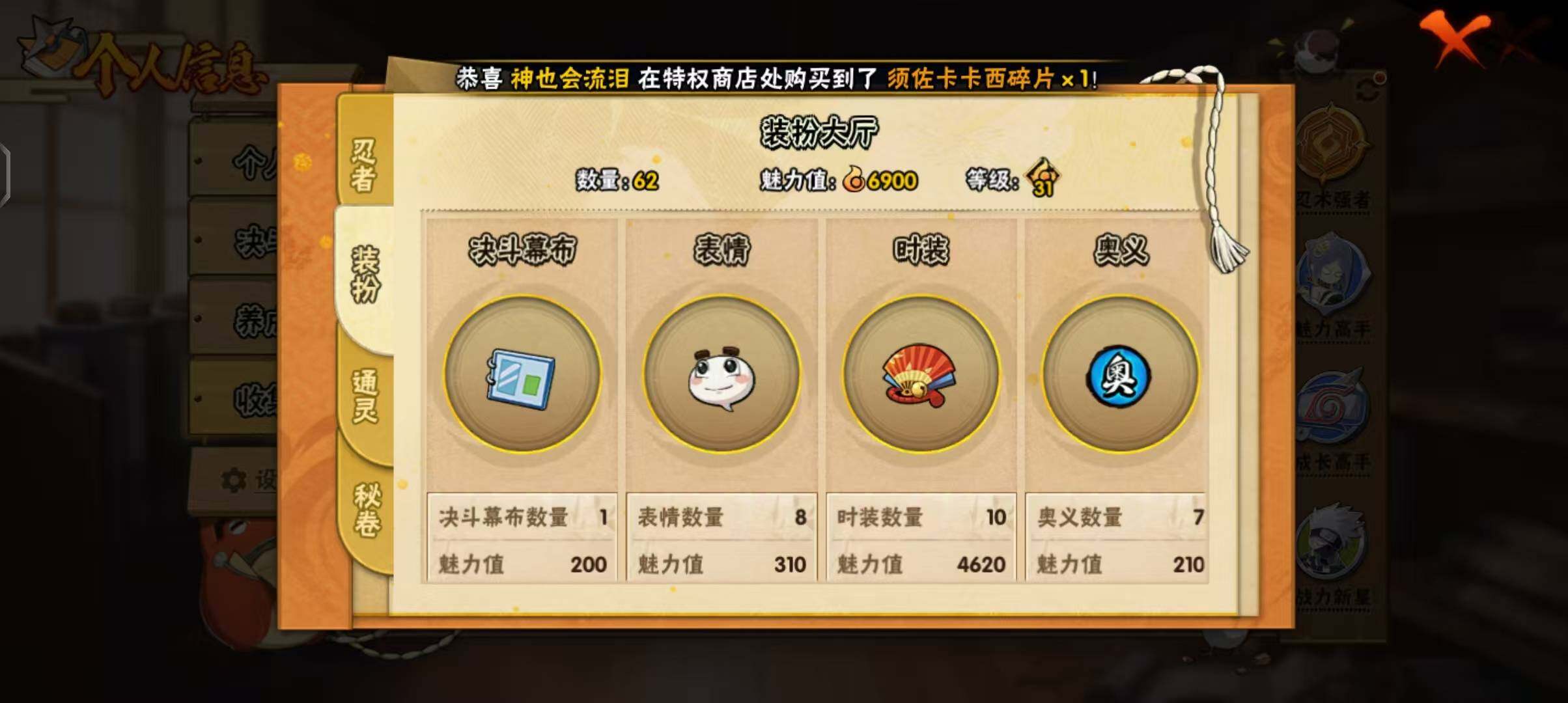 【HYSA1115】V4/战力405W/S忍7/A忍20/通灵兽13/疾风传-我爱罗/死司凭血-飞段/宇智波鼬/青年-长门/忍界大战-宇智波带土/蝎/天道-佩恩/3星漩涡鸣人·宇智波佐助/波风水门/九喇嘛连结-漩涡鸣人/桃式显现-漩涡博人/青年-波风水门/舞之豪杰-自来也/四代目土影-黑土/2星神农「羁绊」/夏日限定-宇智波鼬/万花筒写轮眼-宇智波佐助/2星宇智波泉奈/迪达拉/干柿鬼鲛/3星迈特凯/九尾查克拉-漩涡鸣人/3星猿飞阿斯玛/2星迈特凯「青春爆炸」/须佐能乎-宇智波佐助/近松十人卫-千