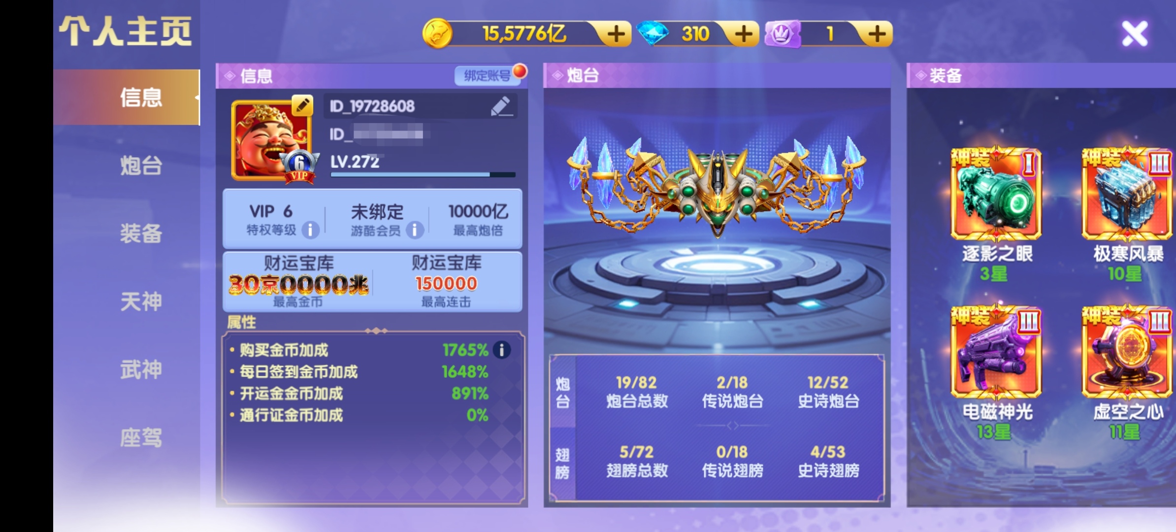 精品v6:全神电13星+天神觉醒黑白双龙特效+16个武神1500连斩+座驾3阶,低价出新q安全换绑。