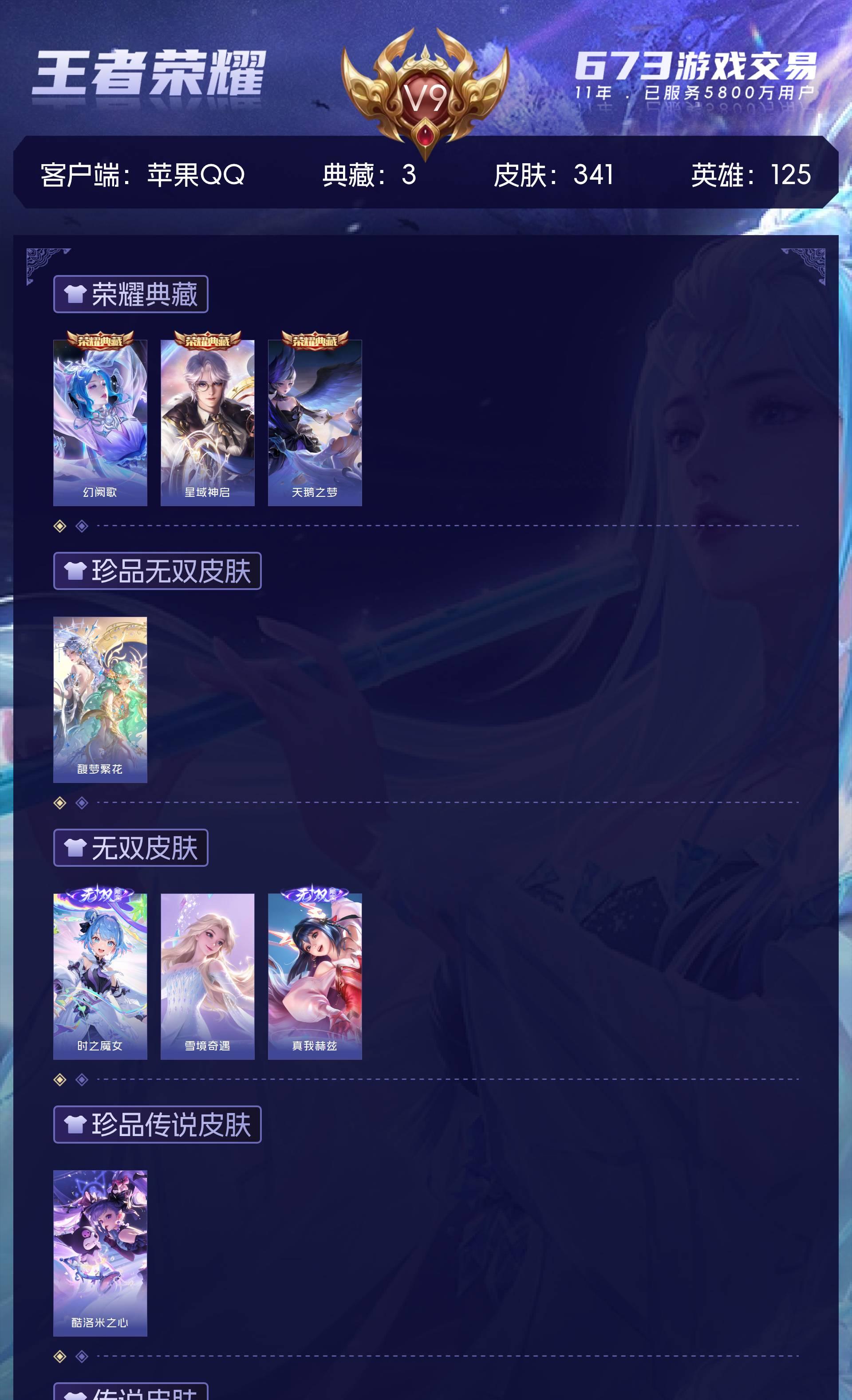 苹果QQ/绝世王者/341皮肤/125英雄/3典藏/1珍品无双/3无双/1珍品传说/22传说/117