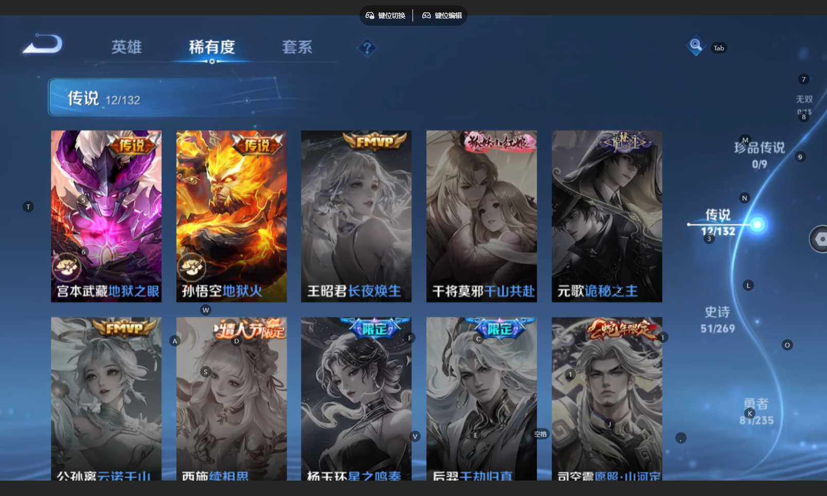 【传说皮肤】:杨戬纵目迁山,后羿神树通天,曹操万灵伏威,大司命死亡执政官,司马懿九山相柳,夏侯惇霜北刀,马超琥珀纪元,露娜启示之音,李信一念神魔,达摩黄金狮子座,宫本武藏地狱之眼,孙悟空地狱火