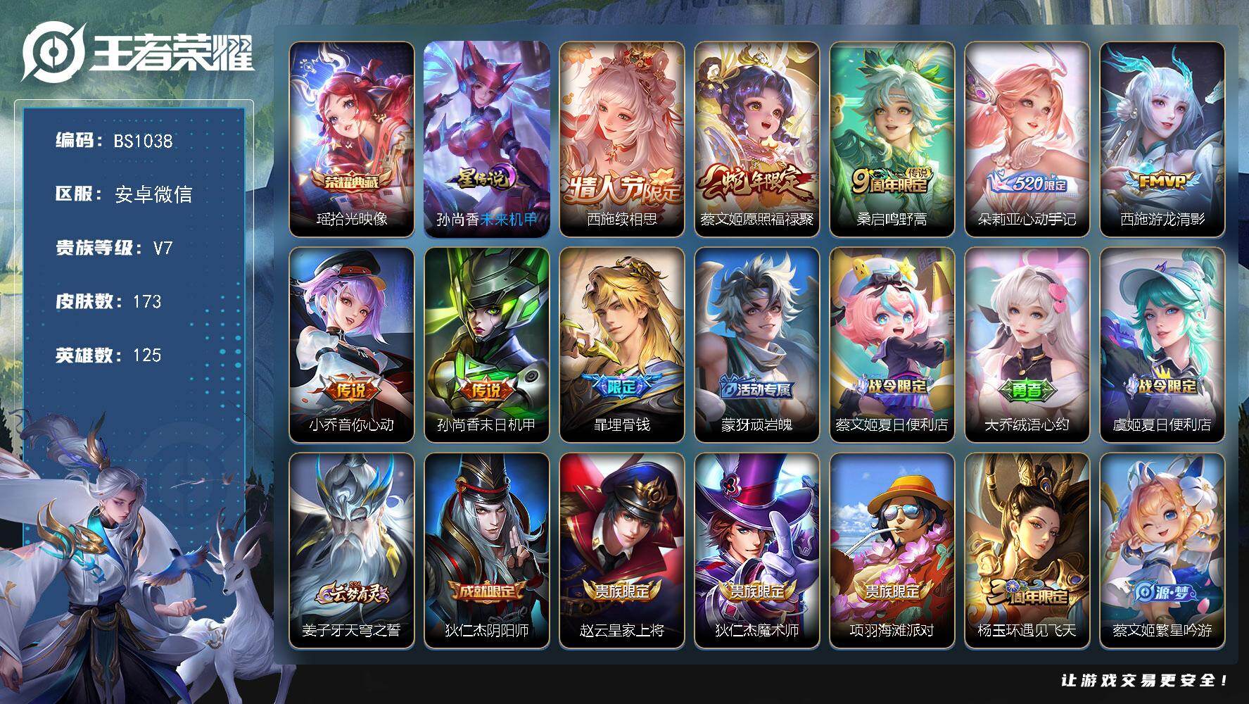 西施全皮!极品小女号!安卓WX-V7-至尊星耀IV段位-125英雄-173皮肤-1典藏皮肤-7传说-53史诗