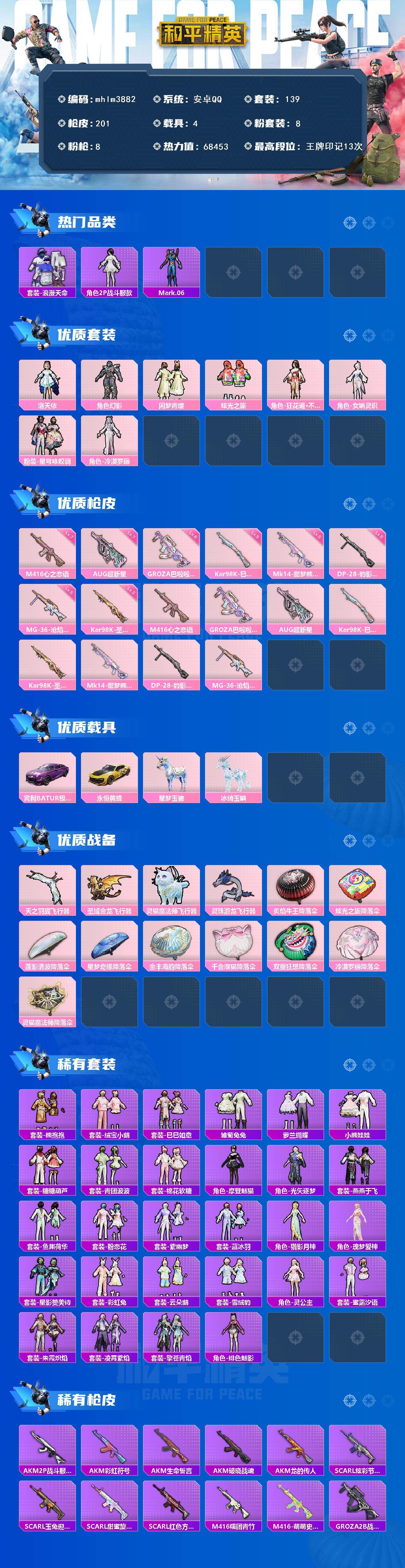 【mhlm3882】安卓 手Q-8粉装-8特效枪-4载具-6粉色飞行器-68453热力值-13王牌印记-139套装-201枪皮