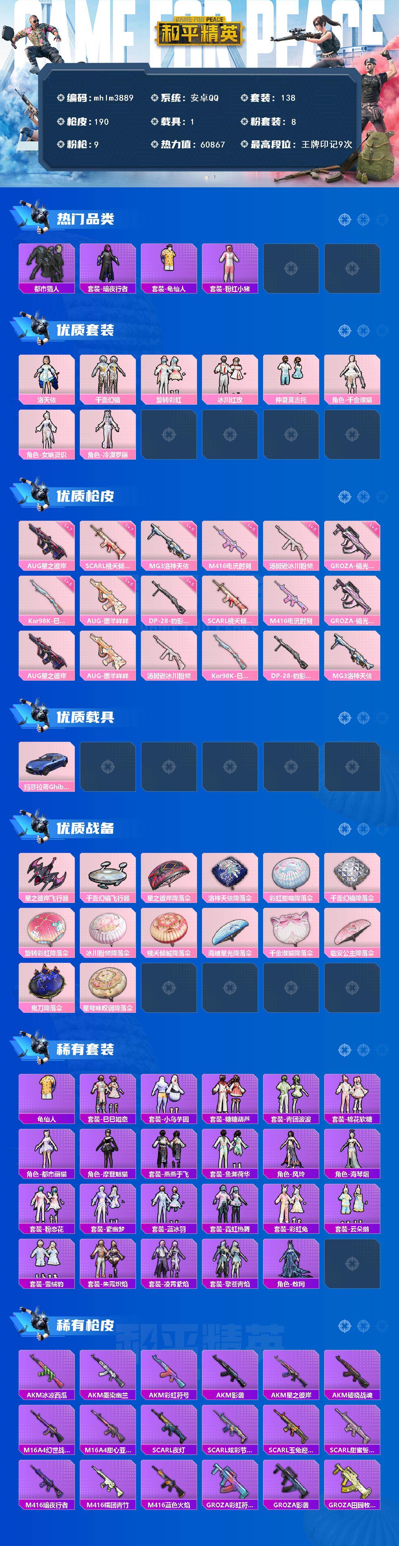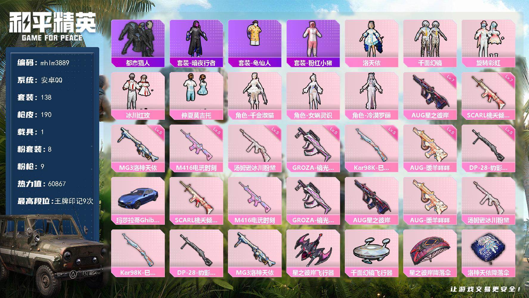 【mhlm3889】安卓 手Q-8粉装-9特效枪-1载具-2粉色飞行器-60867热力值-9王牌印记-138套装-190枪皮