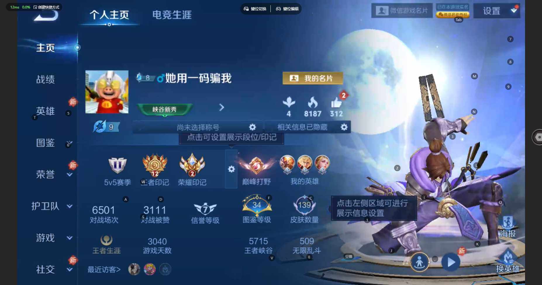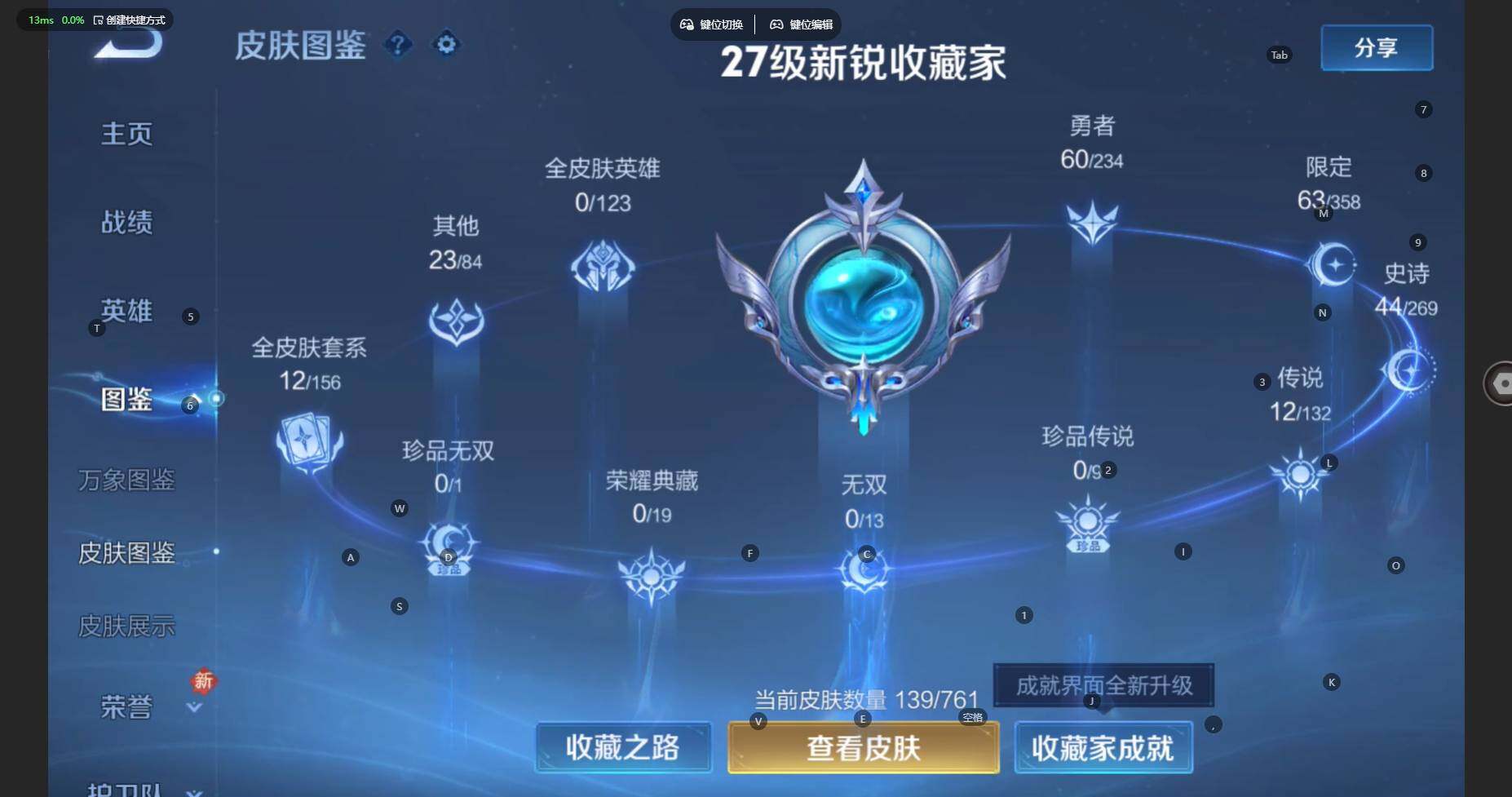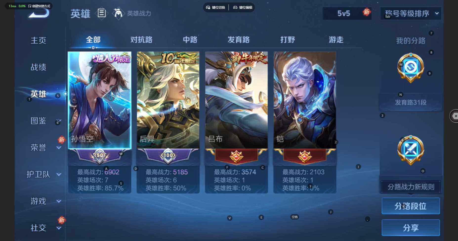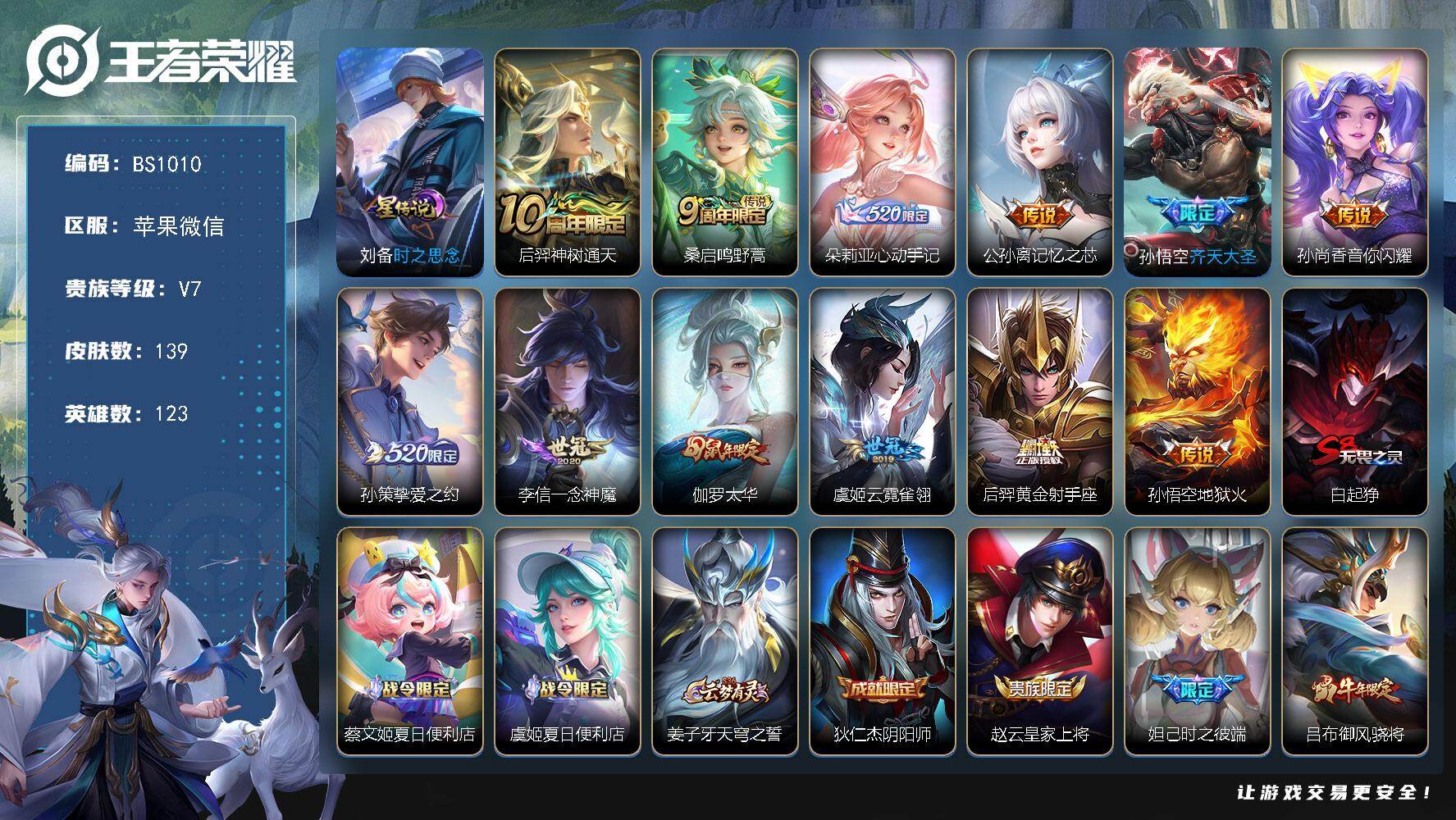 /射手号!发育路31段-对抗路26段 苹果WX-V7-永恒钻石II段位-123英雄-139皮肤-12传说-63限定-12印记-6按键