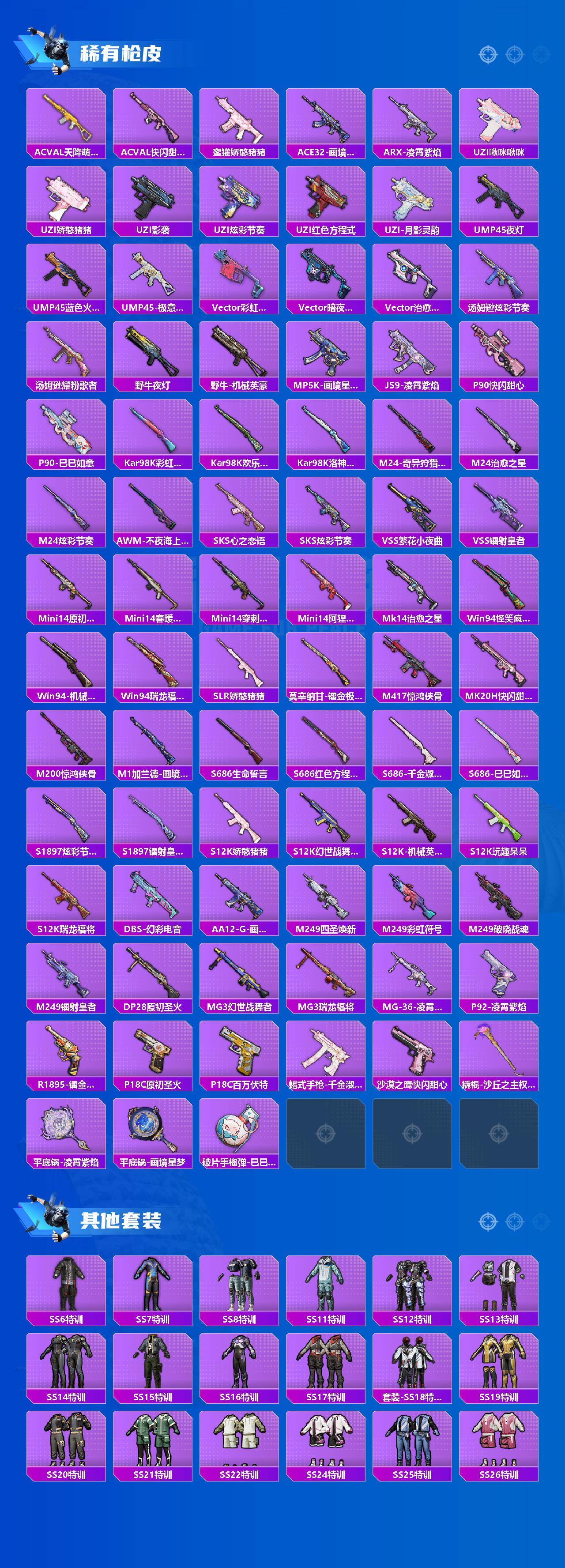 【粉色枪皮等级】:AKM-绿萝繁花(五级),SCAR-L-锦绣绵绵(五级),M416-五爪金龙(四级),GROZA-镜光银凌(五级),AUG-暖羊咩咩(五级),M762-青锋波束(五级),AKS-74U-森灵之