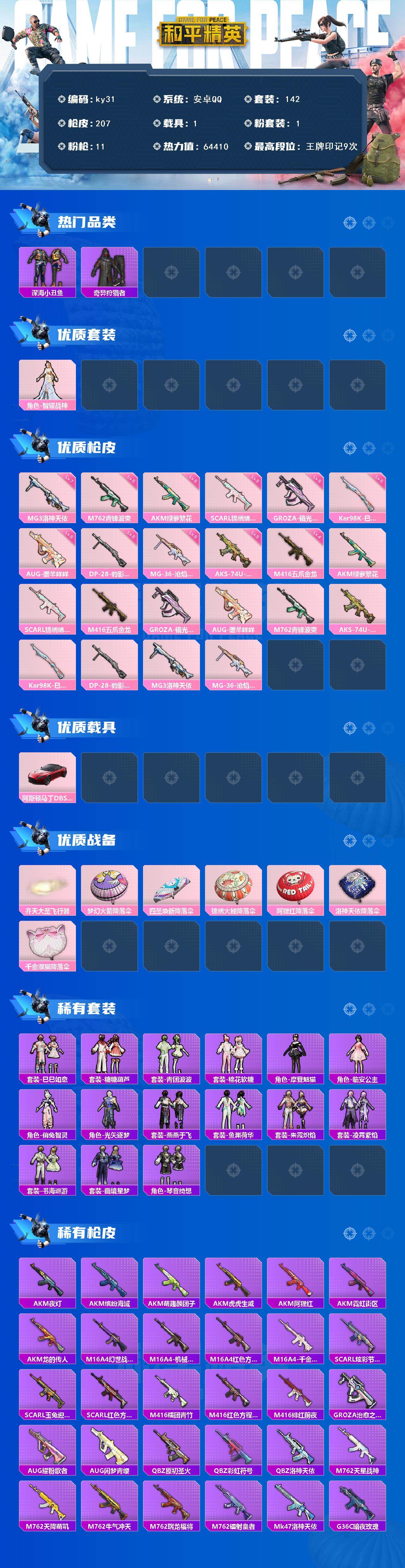 安卓 手Q-1粉装-11特效枪-1载具-2粉色飞行器-64410热力值-9王牌印记-142套装-207枪皮
