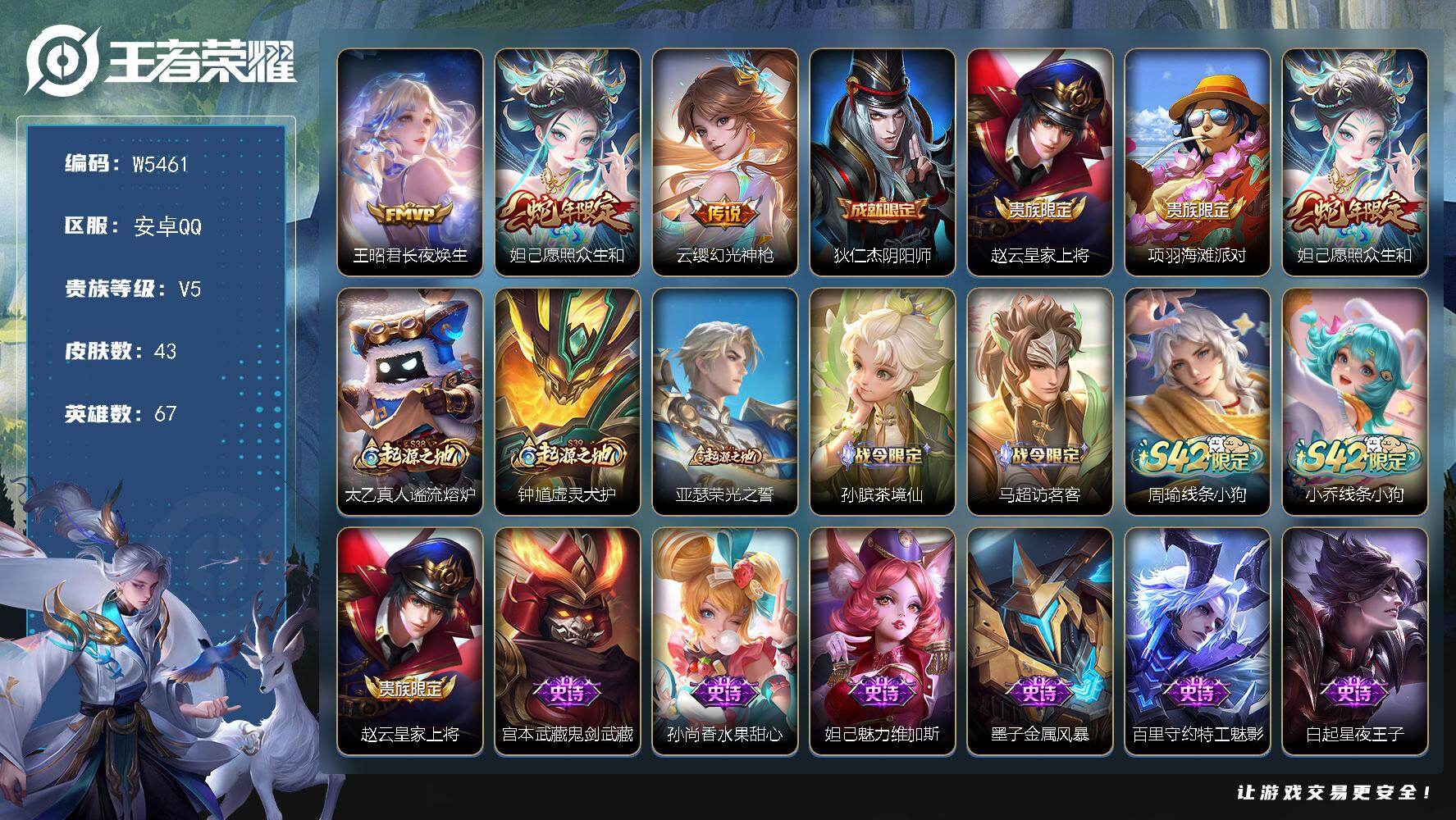 【W5461】QQ功能限制-安卓Q区-无二次-贵5-67英雄-43皮肤-3传说