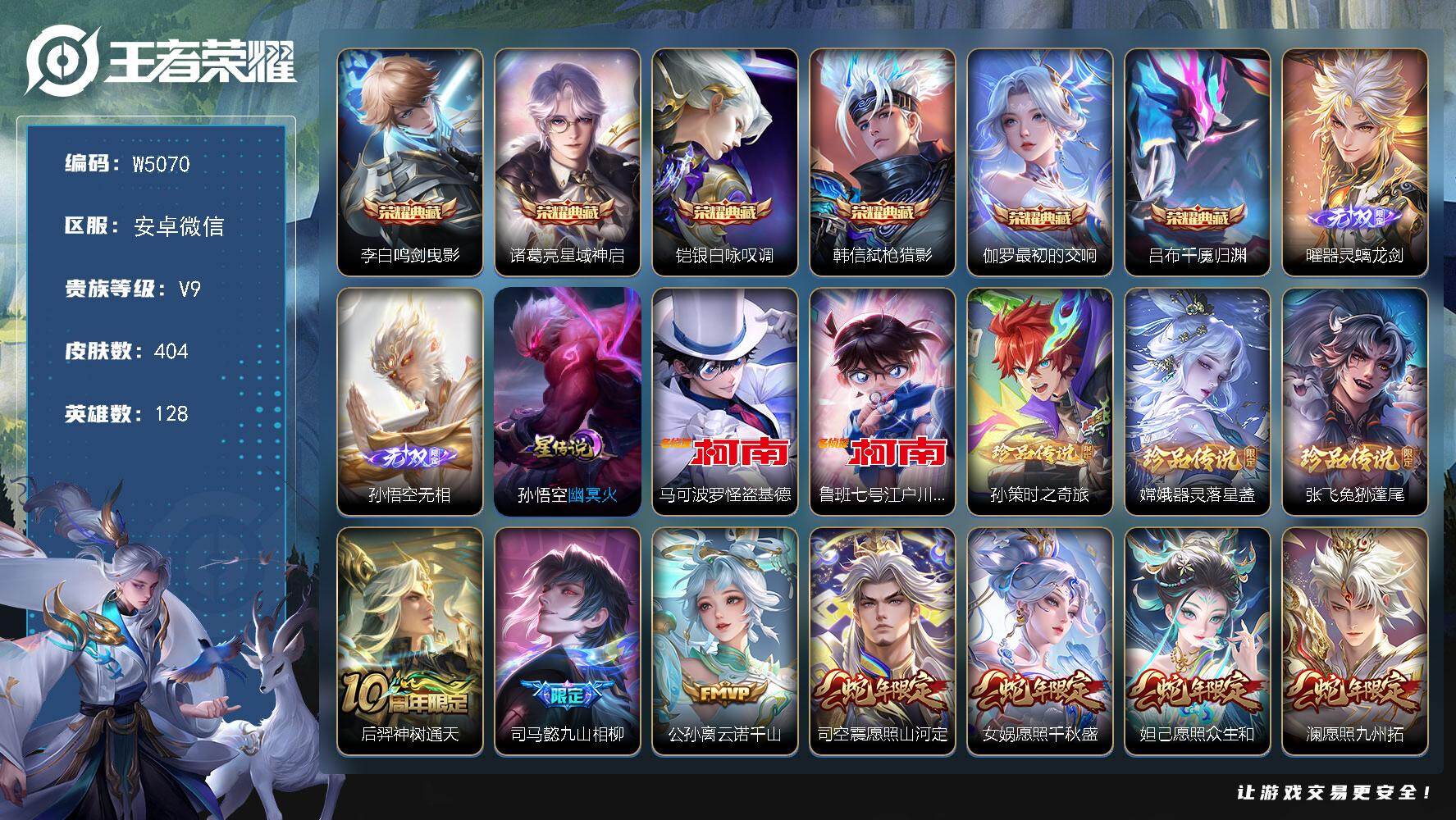 【W5070】精品质量号.满龙.蛇年限-猴子无相.曜器灵·螭龙剑新无双-兔狲·蓬尾.器灵·落星盏.时之奇旅.怪盗基德.江户川柯南珍品-幽冥火星元-安卓微信-无二次-贵9-128英雄-404皮肤-6典藏-27传说-2无双-5珍品-131限定-122史诗-1星元-28按键-满铭文精品号-18印记-贵族积分122625-