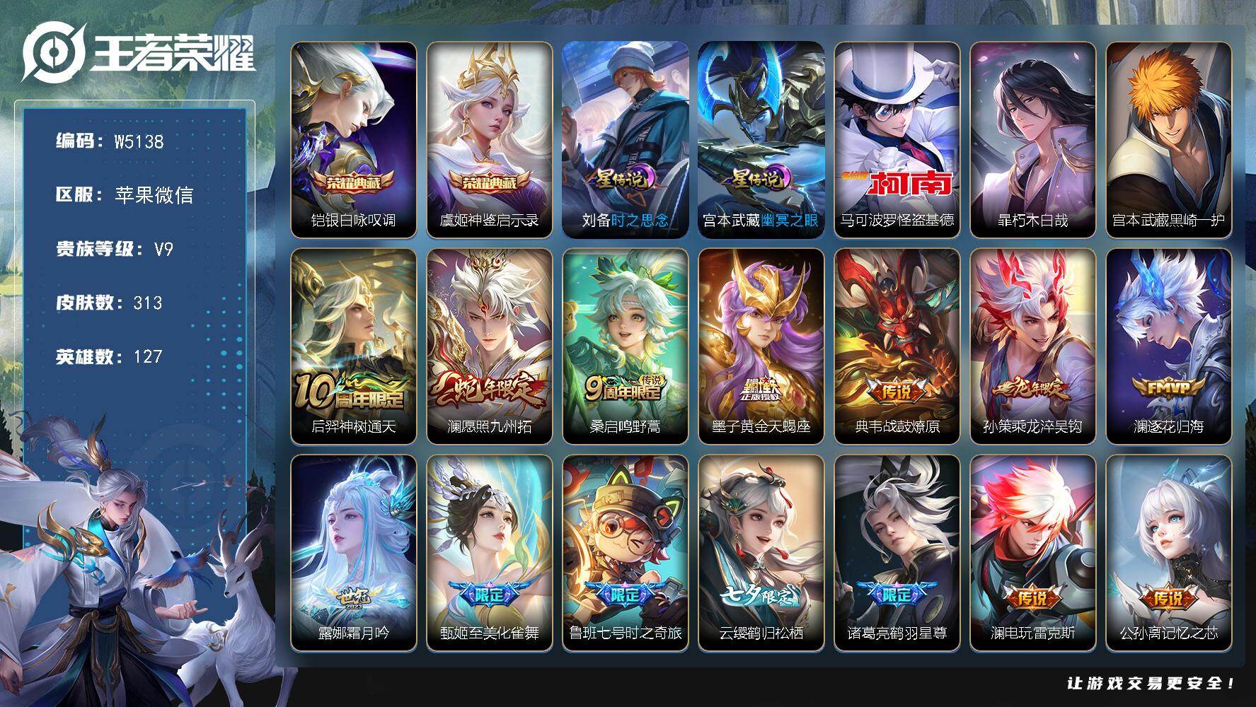 【W5138】棉花糖聚会天幕-时之思念.幽冥之眼星元-黑崎一护.尾朽木白哉.怪盗基德珍品-神威.龙胆.青龙志.引擎之心.至尊宝-苹果微信-无二次-贵9-127英雄-313皮肤-2典藏-34传说-3珍品-115限定-99史诗-2星元-26按键-1天幕-百朵花花-163打标幸运值-品质号-11印记-贵族积分115032-