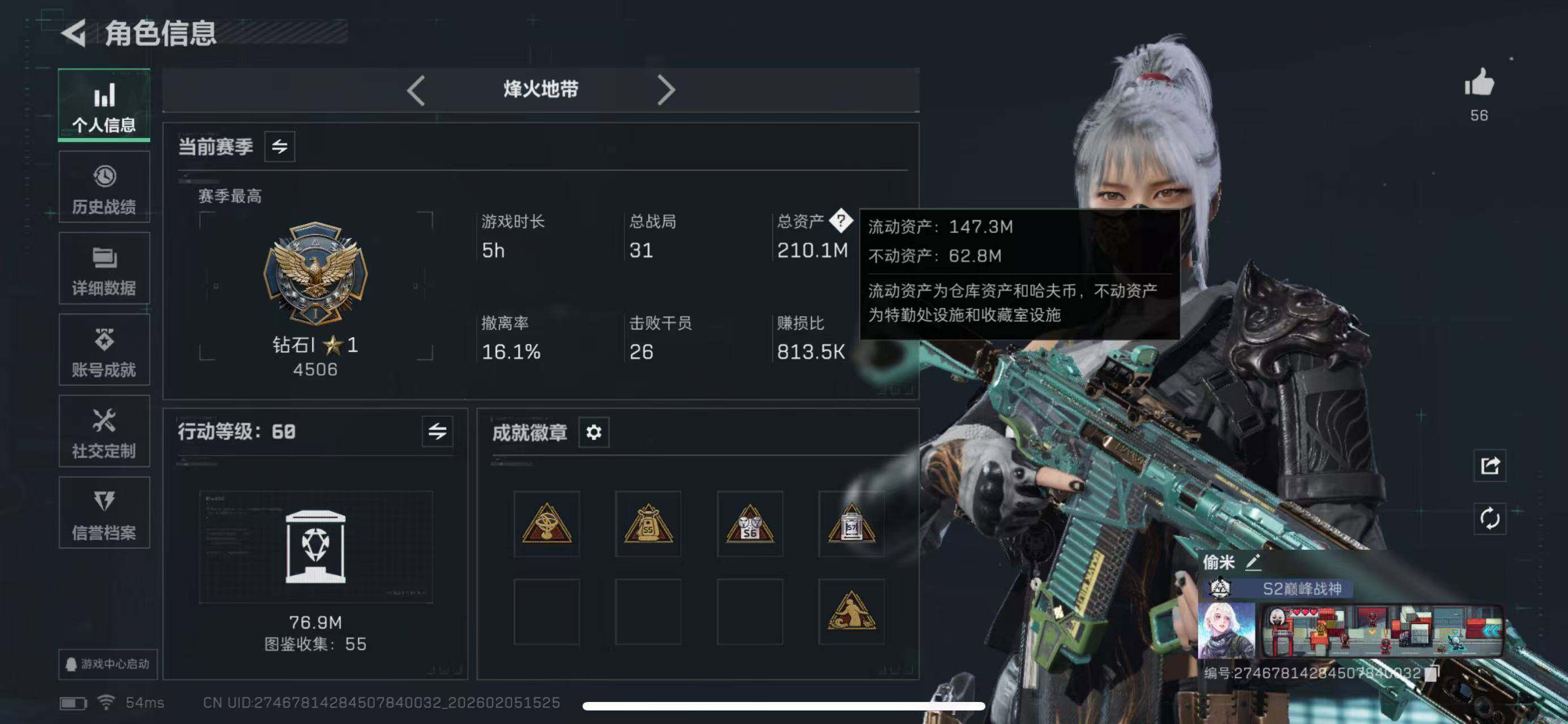 【SJ1075】212m总资产-12100k哈伏币-60烽火等级-钻石-18战场等级-列兵