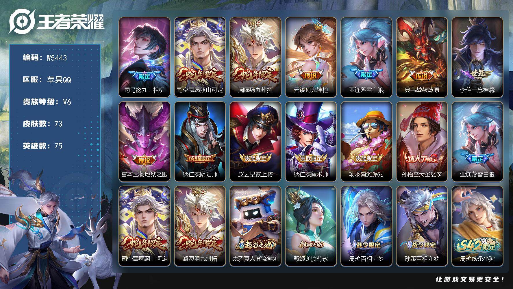 【W5443】苹果QQ-有二次-贵6-75英雄-73皮肤-8传说-22限定-5按键-灵宝-1印记-1.4万贵族积分-营地1605347909-热门皮肤-司马懿九山相柳,司空震愿照·山河定,澜愿照-九州拓,云缨幻光神枪,亚连落雪白狼,典韦战鼓燎原,李信一念神魔,宫本武藏地狱之眼,孙悟空大圣娶亲