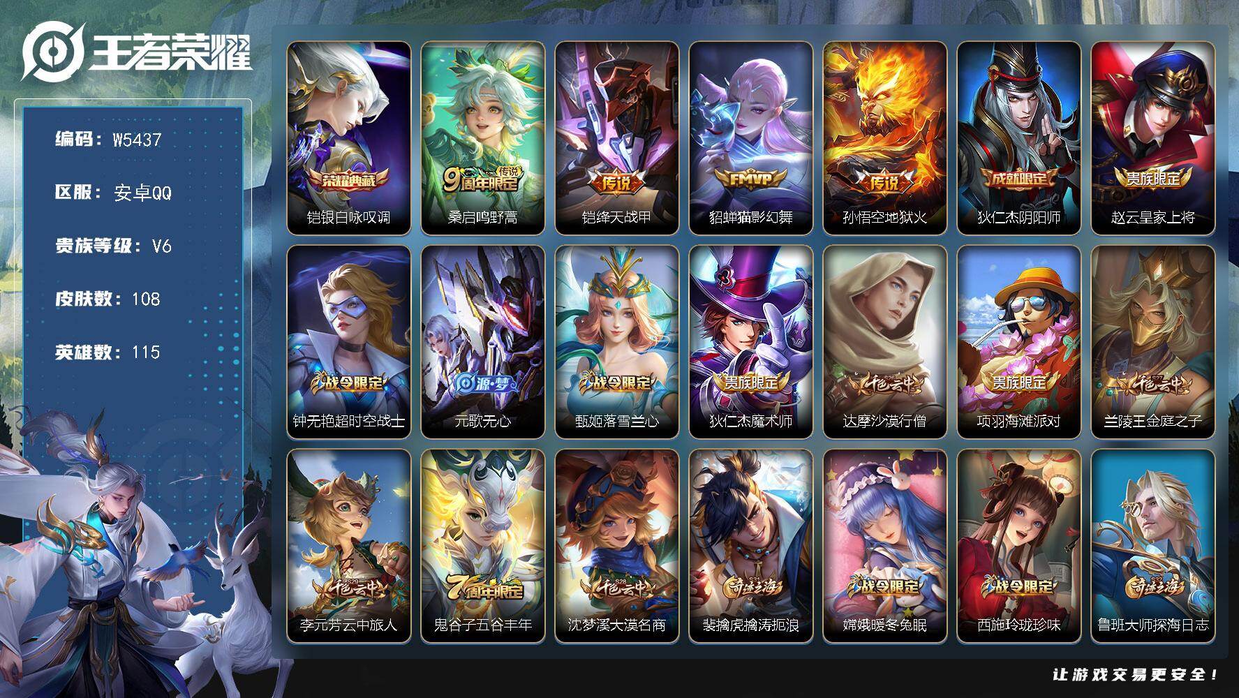 【W5437】安卓Q-有二次-贵6-115英雄-108皮肤-1典藏-4传说-29限定-25史诗-2按键-百朵花花-质量小号.铠银白咏叹调典藏.绛天战甲.地狱火.FMVP猫影幻舞.无心.电玩暴力旋风.曙光守护者.黄金分割率.金属风暴-1印记-贵族积分11009-营地ID:1815686086