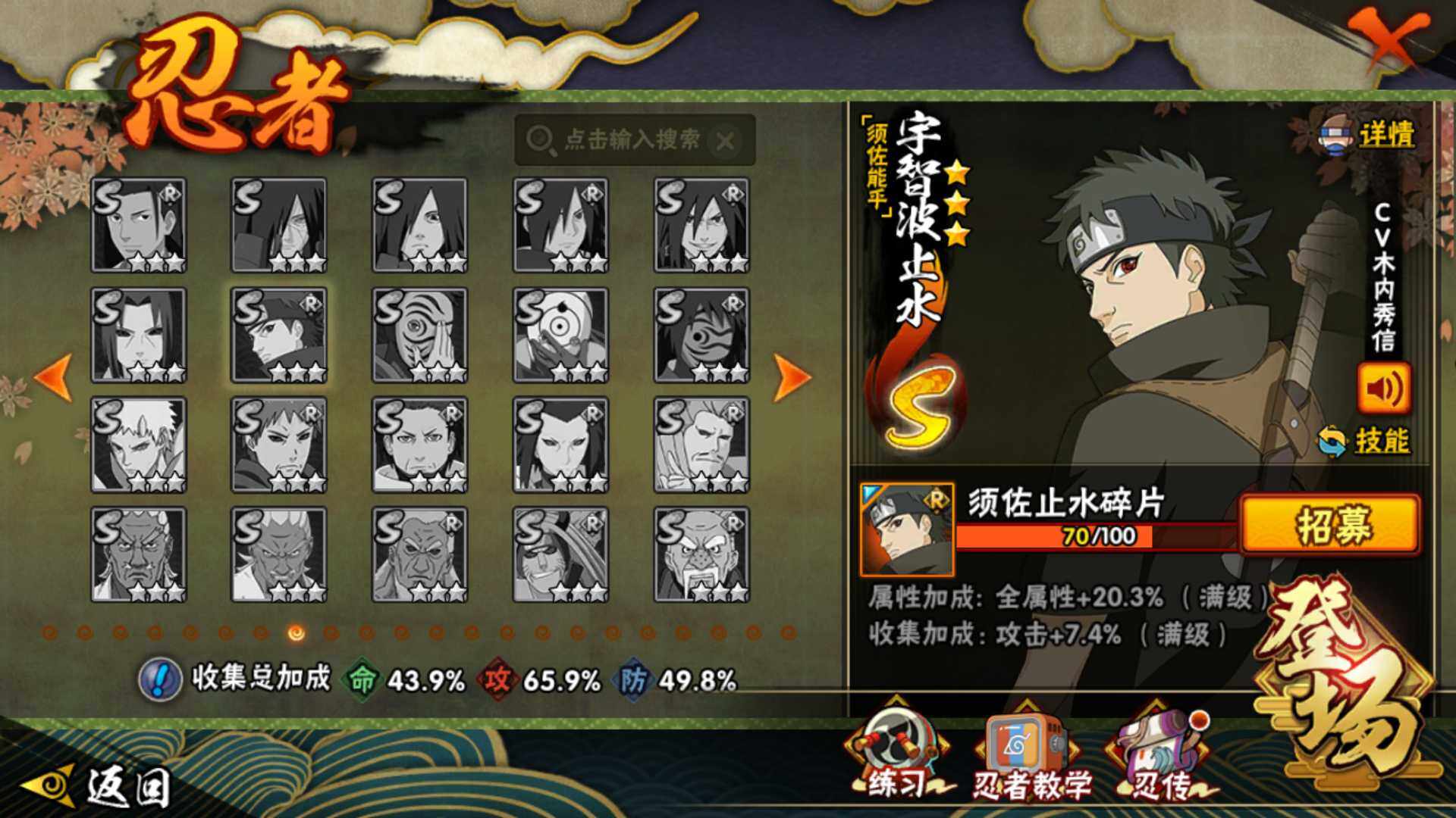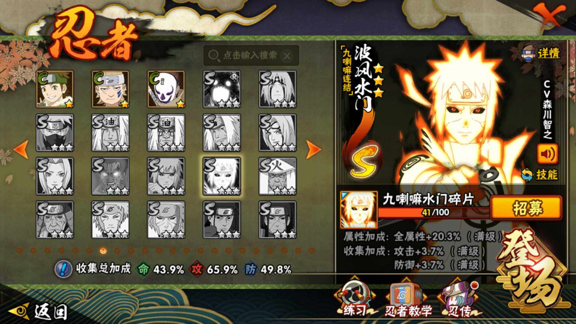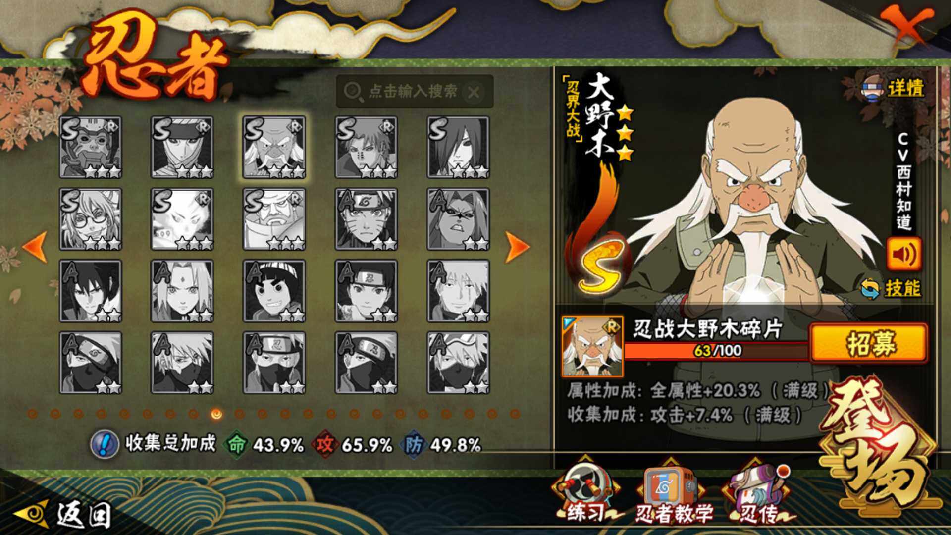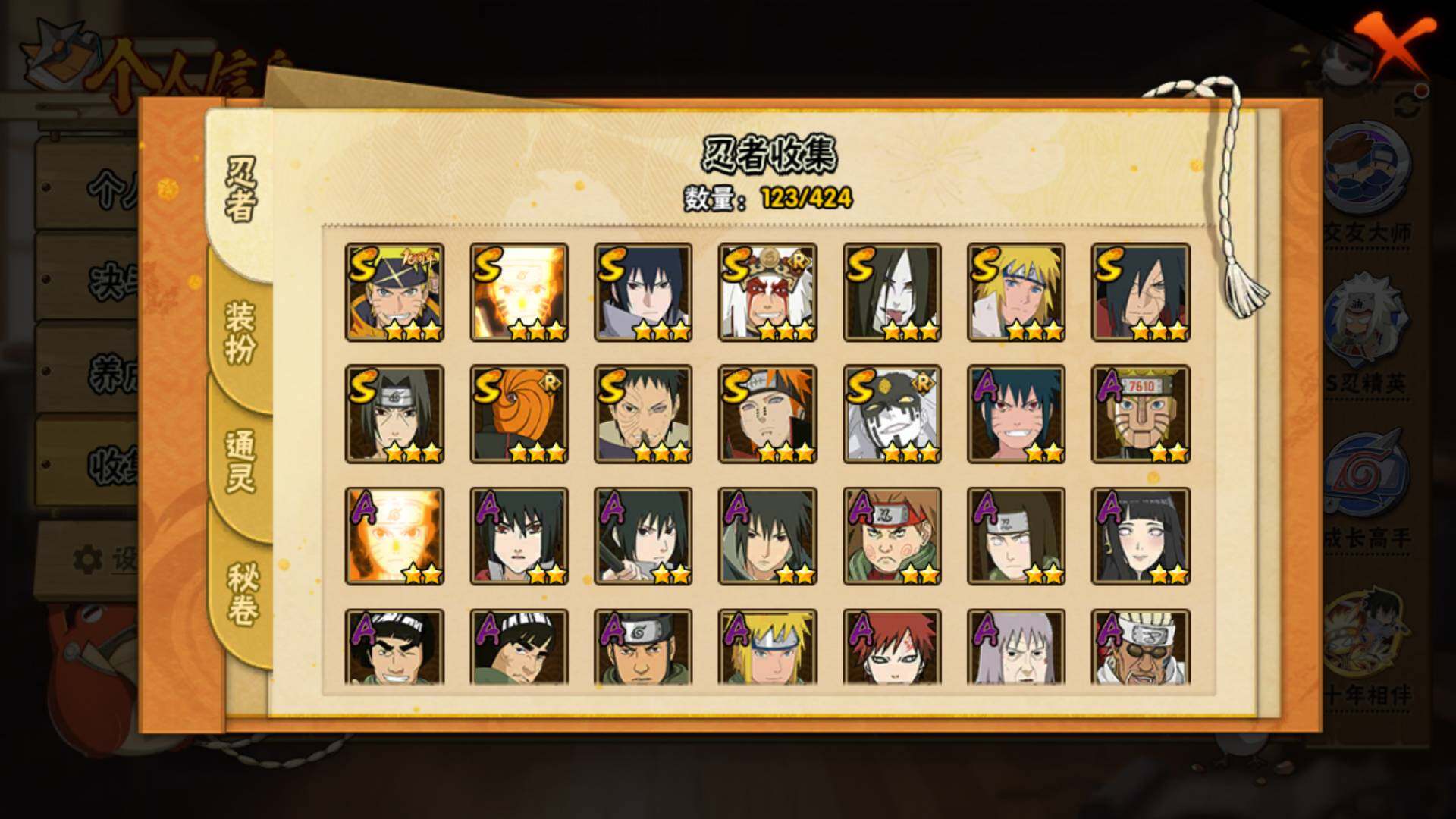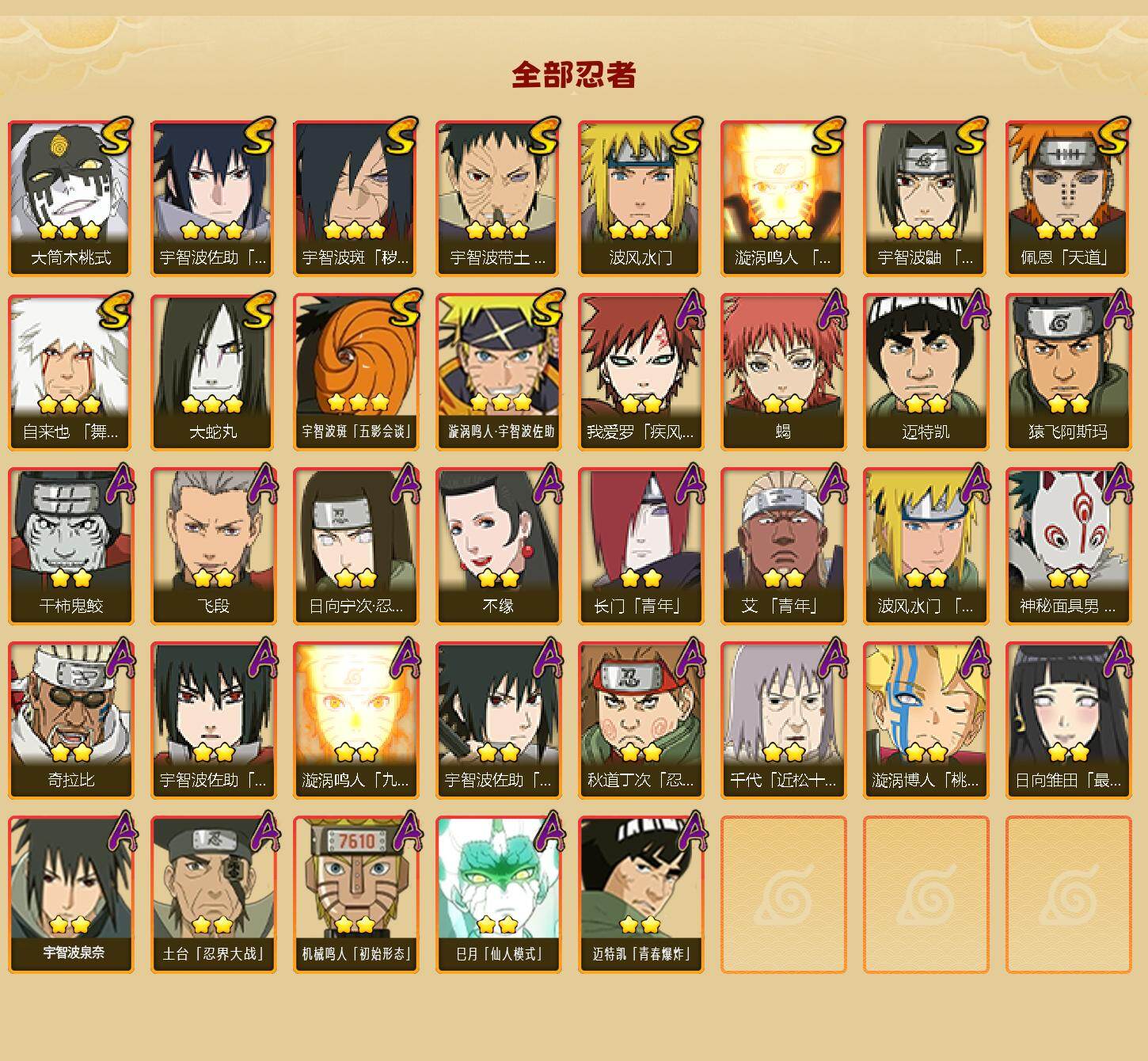 【S级忍者】:宇智波斑「秽土转生·解」(3星),宇智波带土「忍界大战」(3星),宇智波鼬「须佐能乎」(3星),自来也「舞之豪杰」(3星),大蛇丸(3星),波风水门(3星),漩涡鸣人「九喇嘛连结」(3星),佩恩「天道」(3星),宇智波佐助「永恒万花筒」(3星)