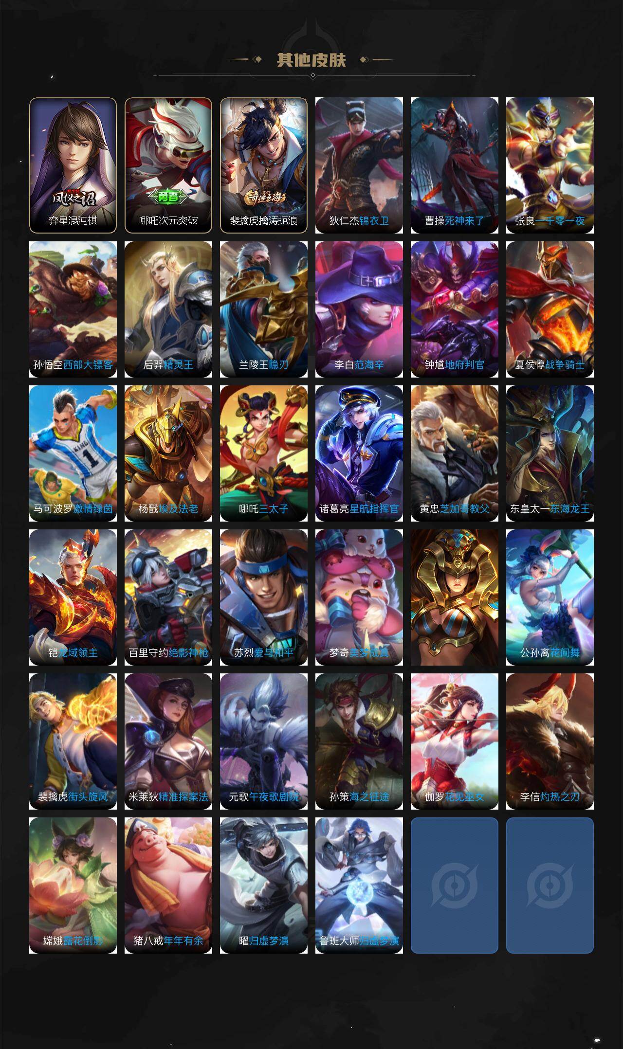 【限定皮肤】:白起狰,狄仁杰阴阳师,虞姬凯尔特女王,赵云皇家上将,高渐离死亡摇滚,孙膑妖精王,周瑜赤莲之焰,夏侯惇朔风刀,曹操烛龙,狄仁杰魔术师,项羽海滩派对,兰陵王驯魔猎人,孙悟空至尊宝,李元芳银河之约,太乙真人饕餮,弈星混沌