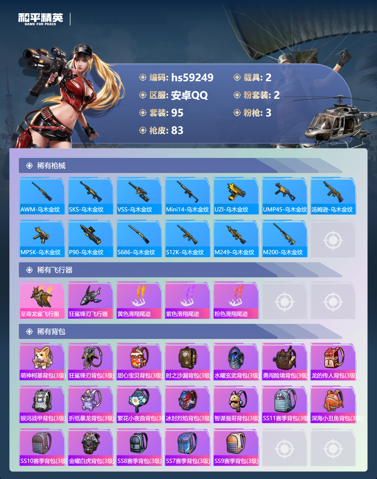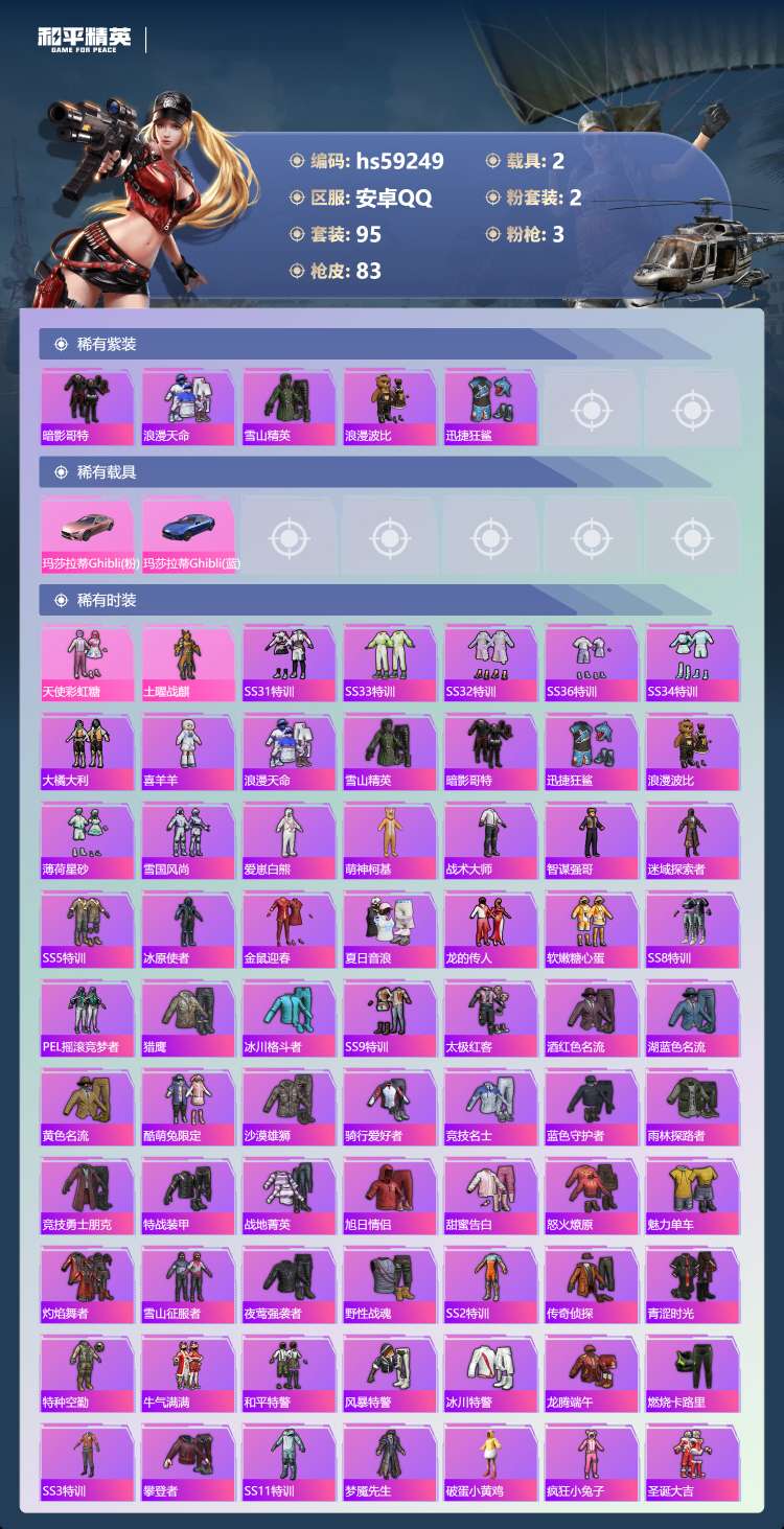 hs59249 安卓手Q-1王牌印记-2粉装-3特效枪-2载具-30199热力值-95套装-83枪皮