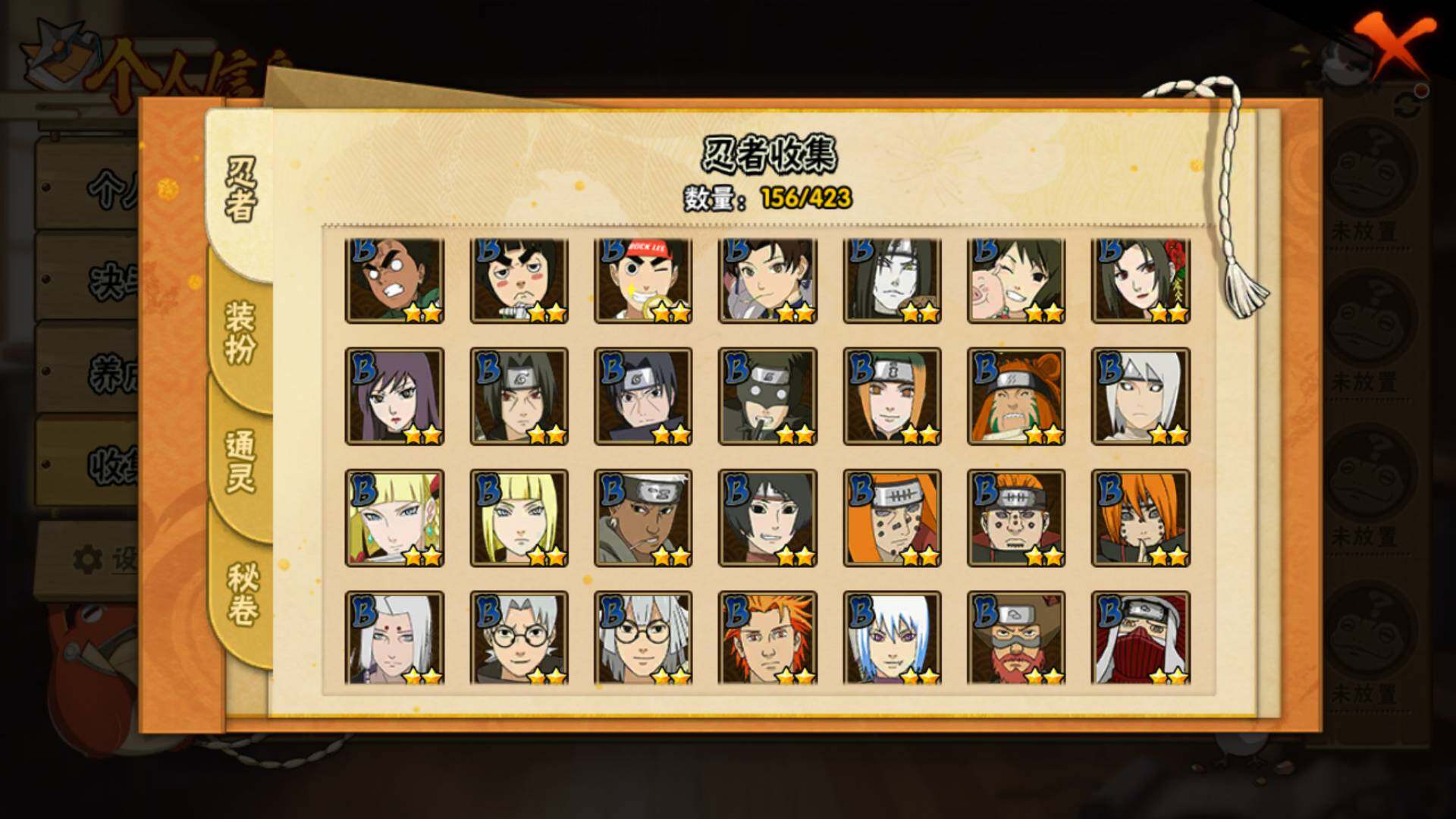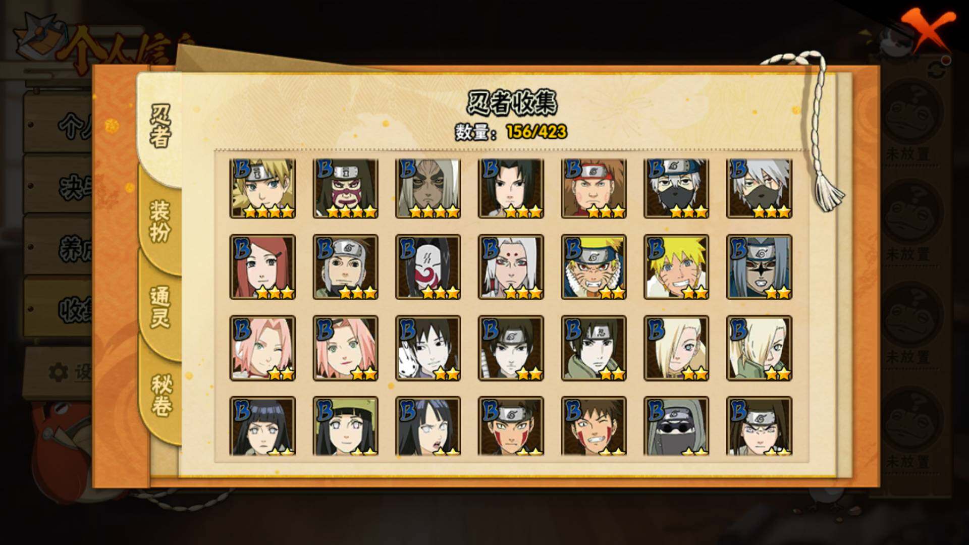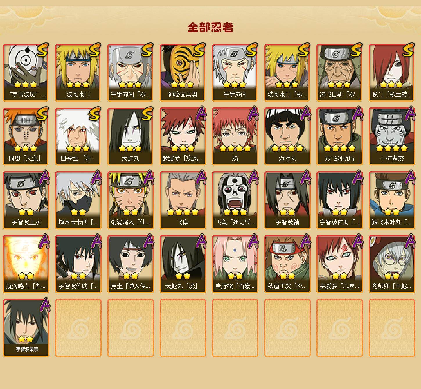 【S级忍者】:长门「秽土转生」(3星),猿飞日斩「秽土转生」(3星),波风水门「秽土转生」(3星),千手扉间「秽土转生」(3星),自来也「舞之豪杰」(3星),大蛇丸(3星),千手扉间(3星),波风水门(3星),神秘面具男(3星),佩恩「天道」(3星),宇智波斑 「白面具」(3