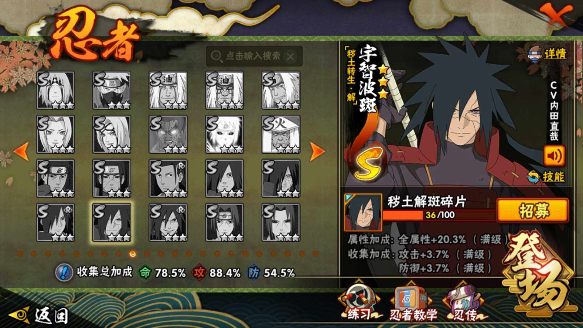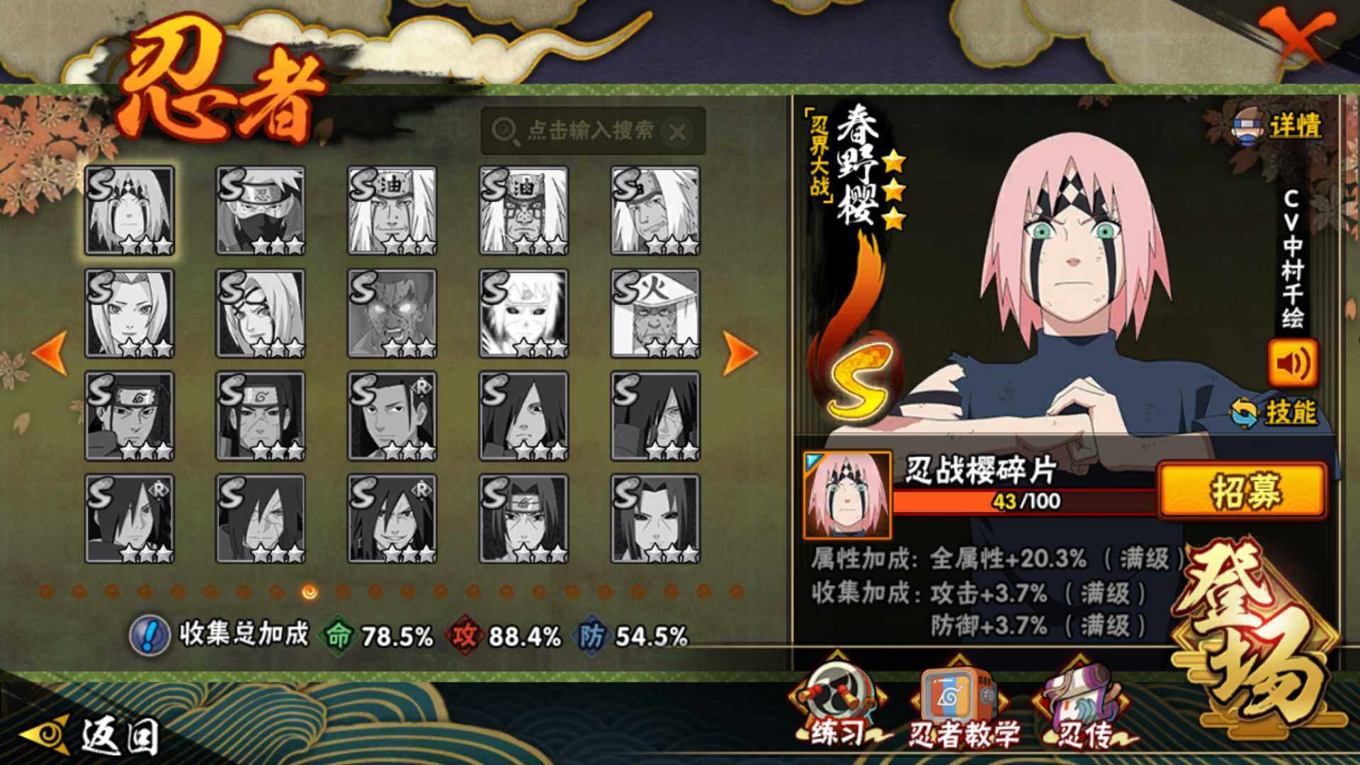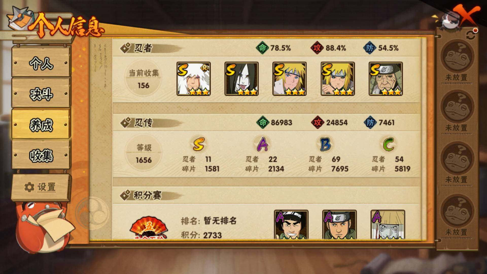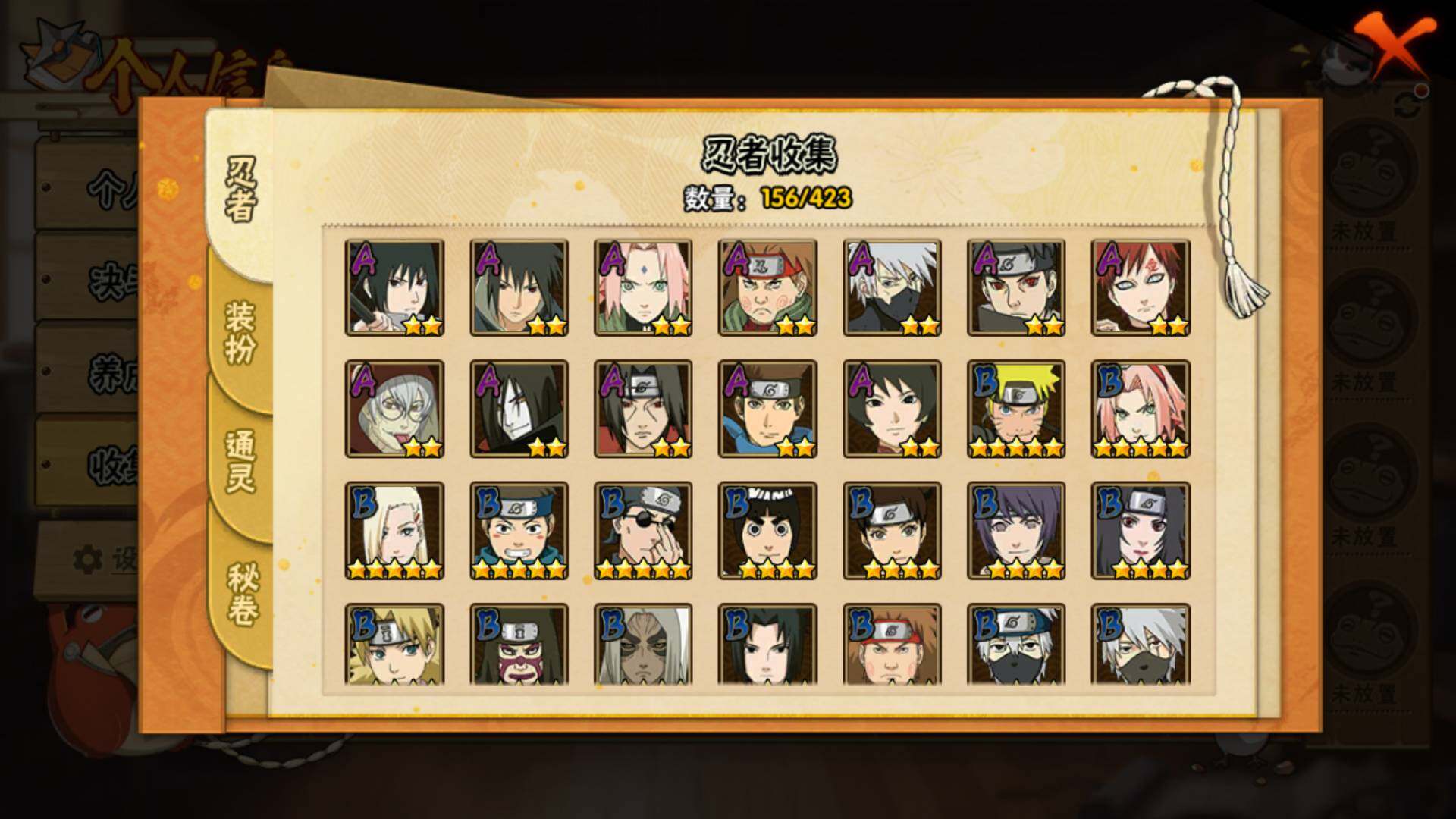 【S级忍者】:长门「秽土转生」(3星),猿飞日斩「秽土转生」(3星),波风水门「秽土转生」(3星),千手扉间「秽土转生」(3星),自来也「舞之豪杰」(3星),大蛇丸(3星),千手扉间(3星),波风水门(3星),神秘面具男(3星),佩恩「天道」(3星),宇智波斑 「白面具」(3