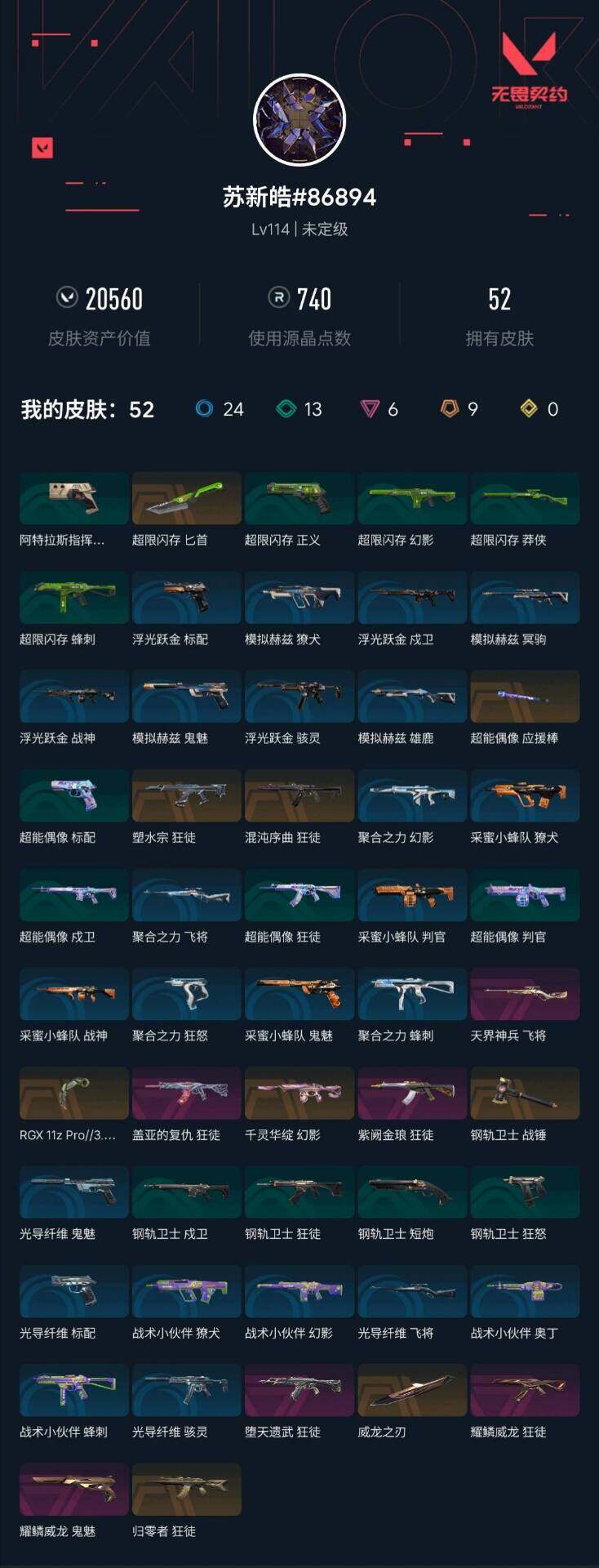 【WWQH264】终极*9/卓越*6/皮肤*52/等级*114/段位:未定级/耀鳞威龙套装/幻棱/炼狱/维斯/暮蝶/钛狐/壹决/铁臂/捷风/雷兹/幽影/不死鸟/贤者/猎枭/蝰蛇/零/芮娜/奇乐/尚勃勒/霓虹/斯凯/夜露/星礈/K/O/海神/盖可/黑梦/钢锁/近战武器-RGX 11z Pro//3.0 爪刀/近战武器-威龙之刃/近战武器-超能偶像 应援棒/近战武器-超限闪存 匕首/近战武器-钢轨卫士 战锤/狂徒-归零者/狂徒-混沌序曲/狂徒-塑水宗/狂徒-堕天遗武/狂徒-盖亚的复仇/狂徒-耀鳞威龙