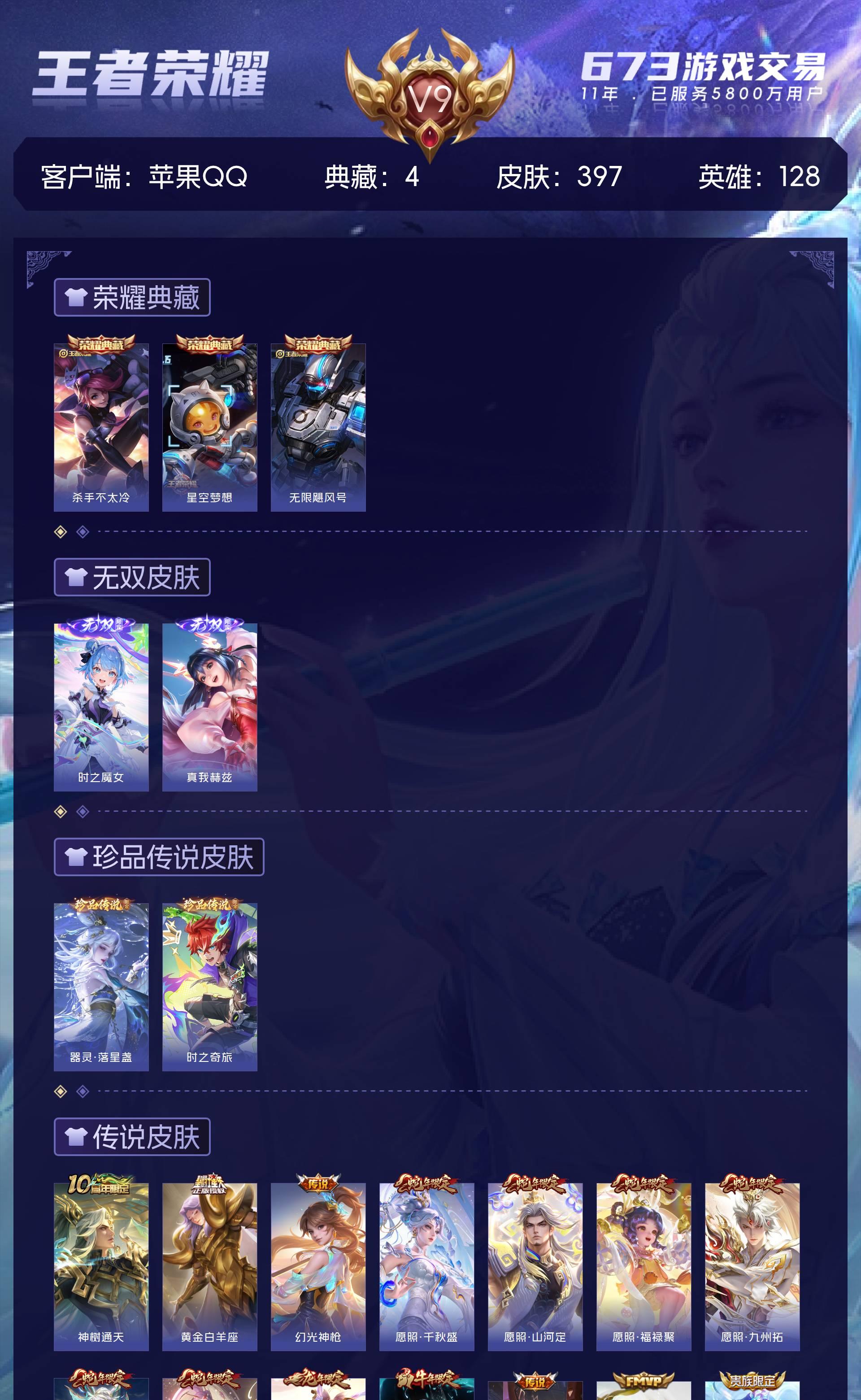 苹果QQ/永恒钻石/397皮肤/128英雄/3典藏/0珍品无双/2无双/2珍品传说/28传说/108