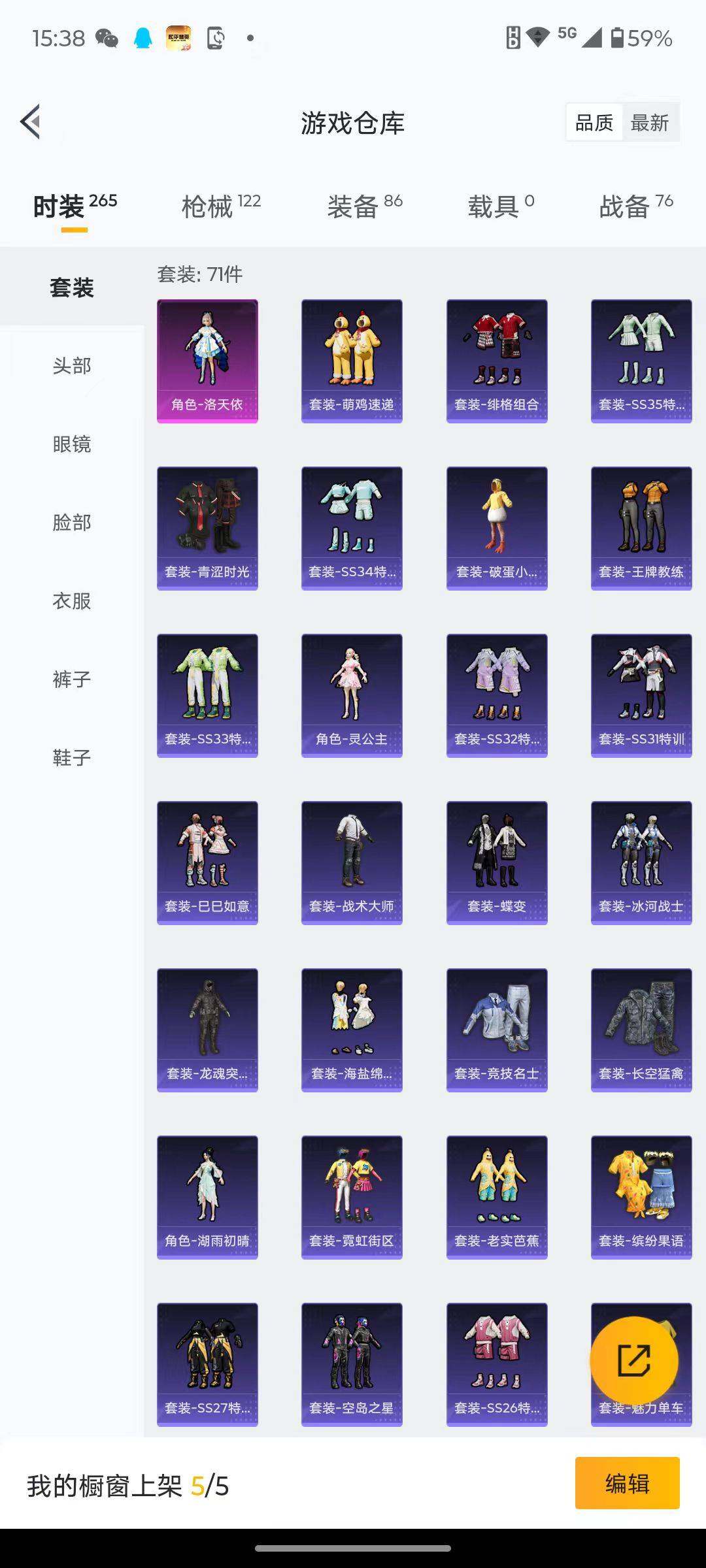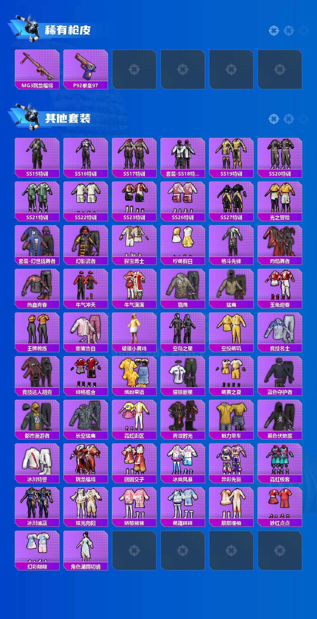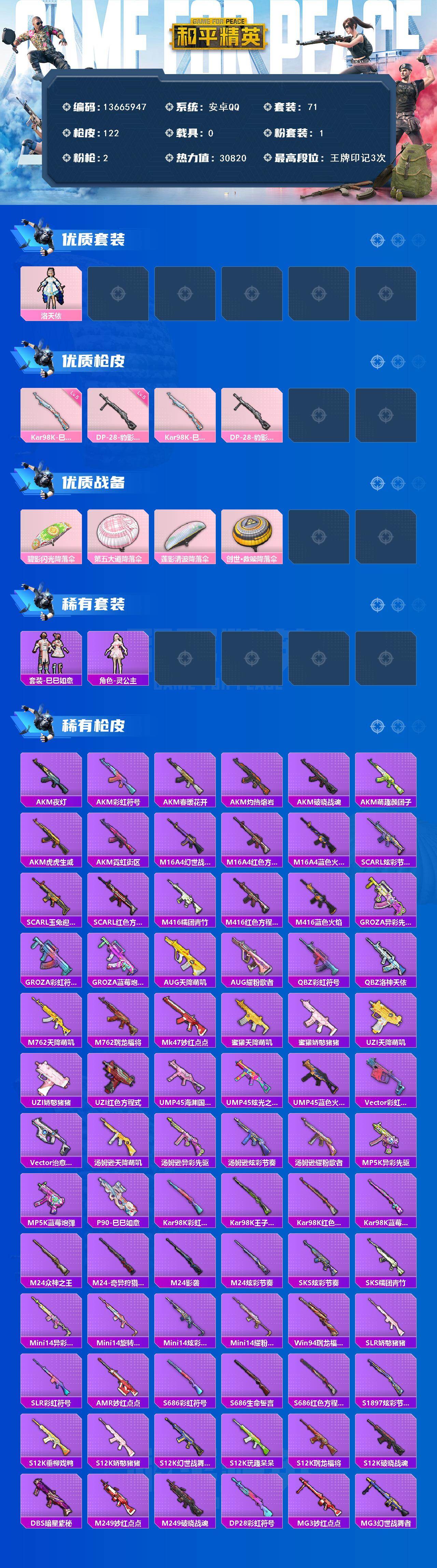71套装/枪械2/装备86/战备76/王牌印记3/热力值30820/五级Kar98K-巳巳如意/五级DP-28-豹影疾电/洛天依/Kar98K-巳巳如意/DP-28-豹影疾电/碧影闪光降落伞/第五大道降落伞/莲影清波降落伞/创世·救赎降落伞/炫彩糖果降落伞/巳巳如意/角色-灵公主/AKM-夜灯/AKM-彩虹符号/AKM-春暖花开/AKM-灼热熔岩/AKM-破晓战魂/AKM-萌趣颜团子/AKM-虎