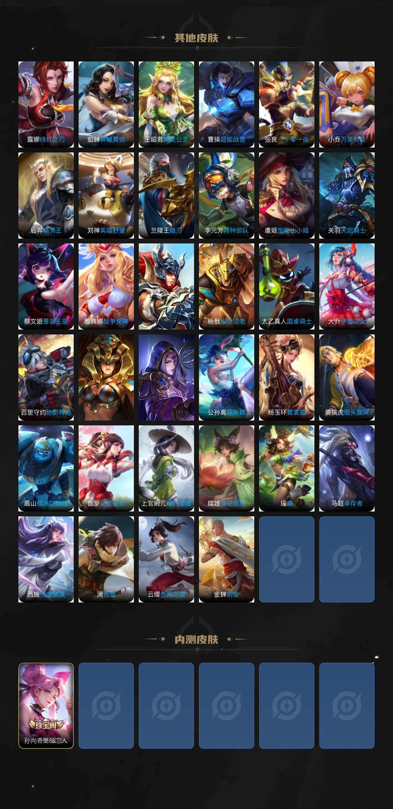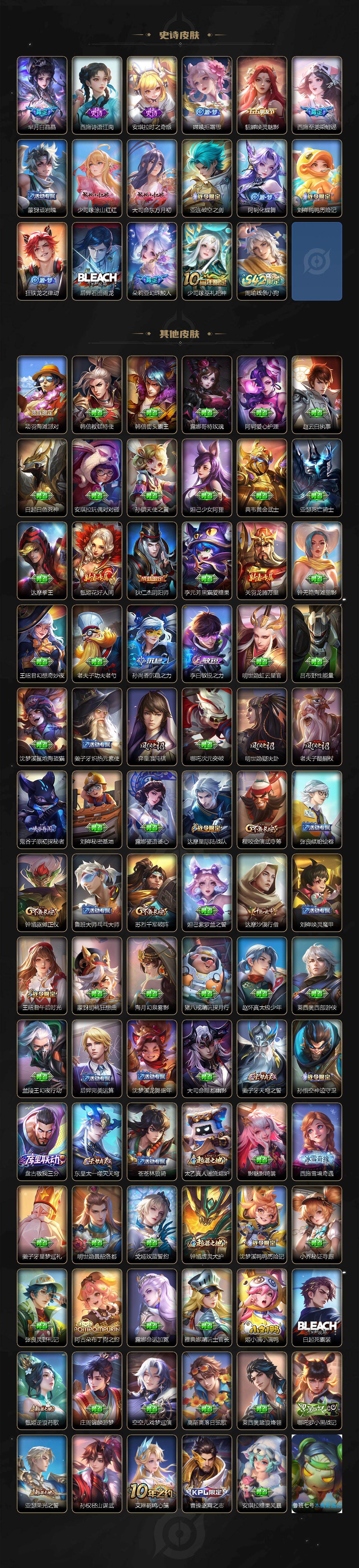 【限定皮肤】:蒙犽顽岩魄,姜子牙天穹之誓,狄仁杰阴阳师,赵云皇家上将,孙尚香蔷薇恋人,芈月白晶晶