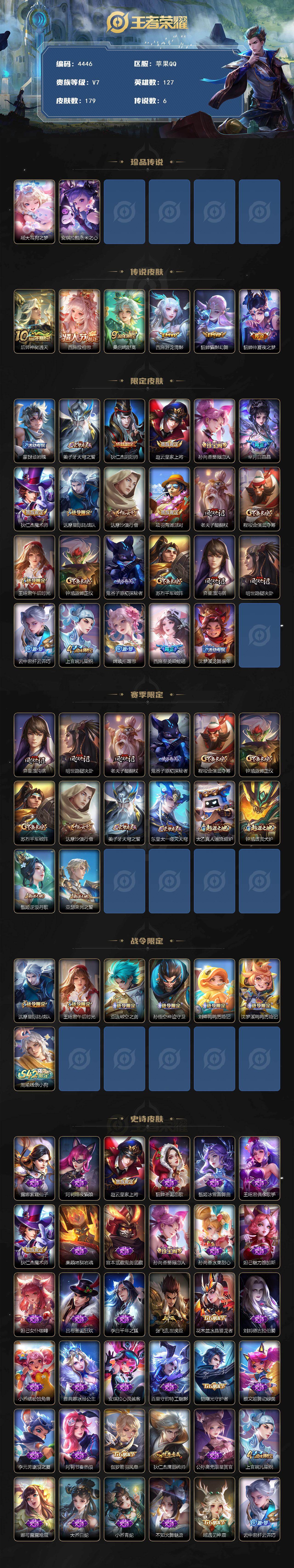 苹果Q-V7-尊贵铂金I段位-127英雄-179皮肤-2珍品传说-6传说-52史诗