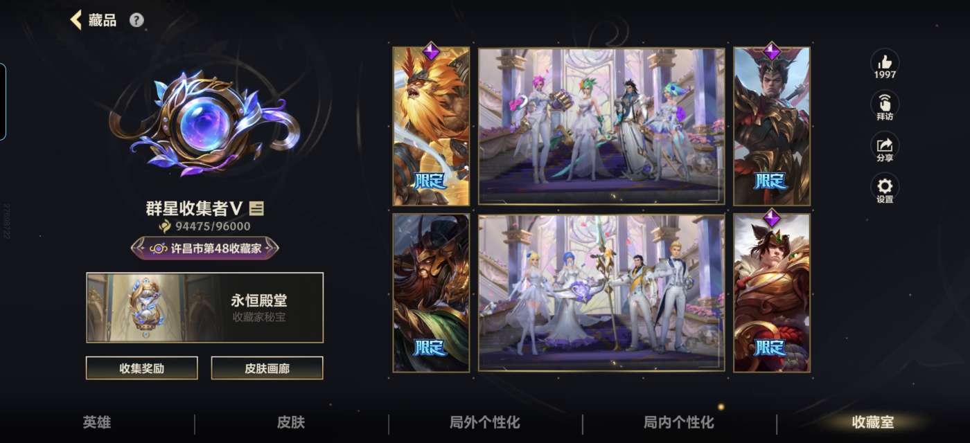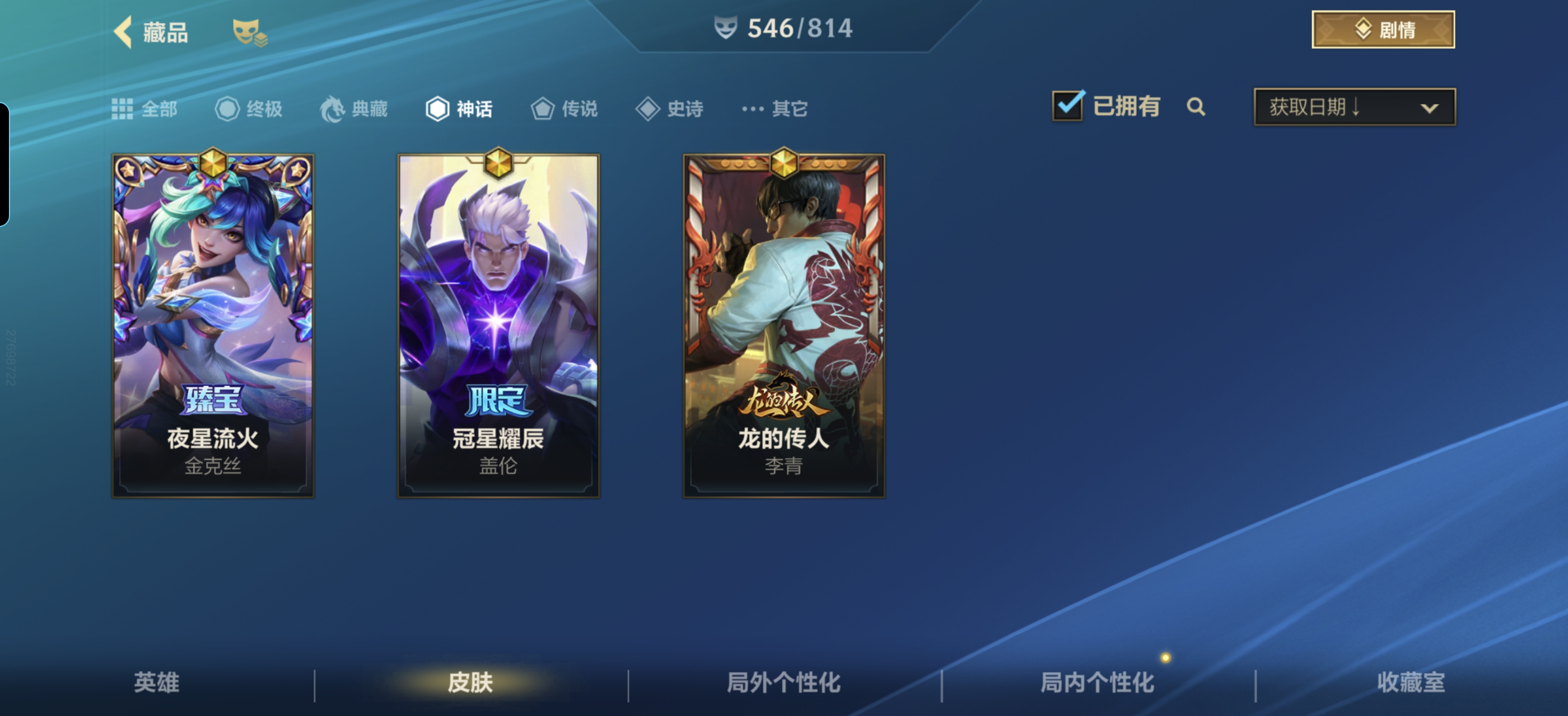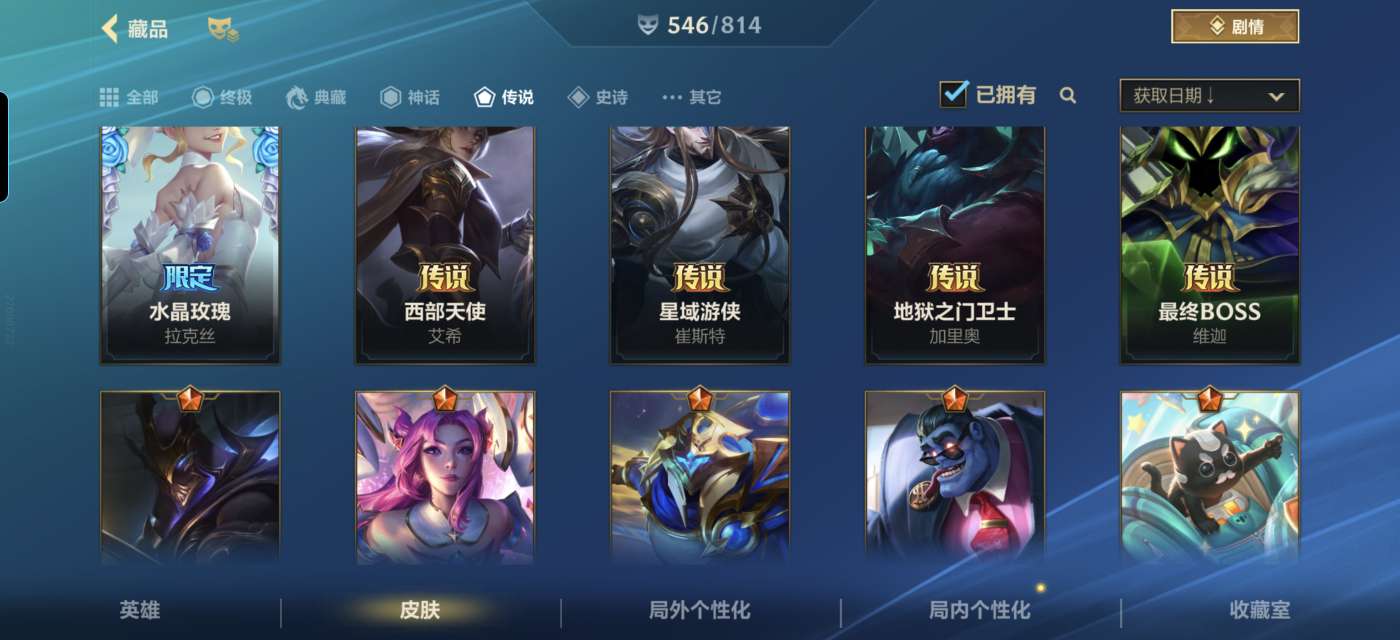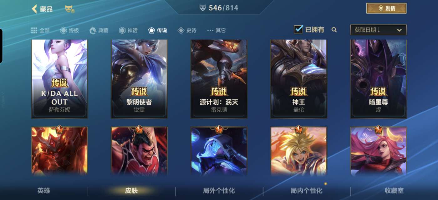 安卓V,可换绑,546皮肤,1093原石,9.5收藏积分,全英雄,各种限定皮肤,一手号保信誉。
