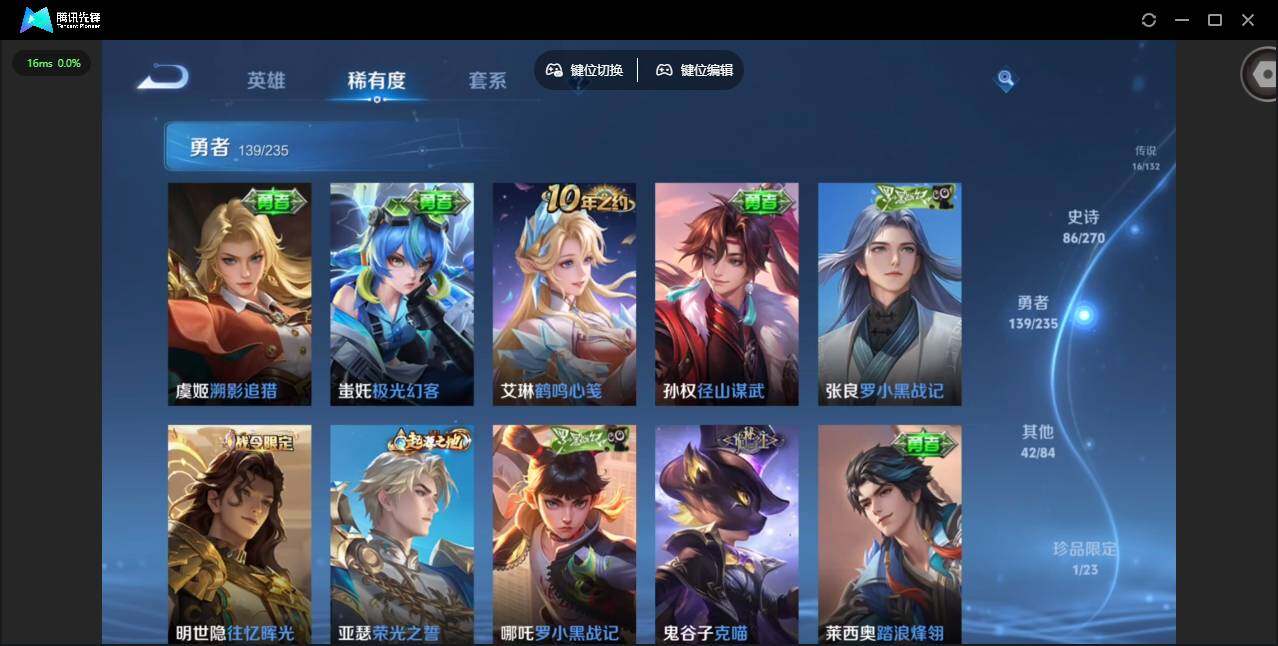 贵族等级: V7 英雄数: 128 皮肤数: 285 荣耀水晶: 星域神启 珍品传说: 怪盗基德 传说皮: 黄金狮子座,云鹰飞将,胖达荣荣,时之恋人-刘备,游龙清影,淬星耀世,山海·炽霜斩,琥珀纪元马超,乘龙·铭钟鼎,乘龙·淬吴钩,幻光神枪,神树通天 限定皮: 冰锋战神,李小龙,梁祝,乒乒小将,逐梦之影,至尊宝,五谷丰年,山海·玄木吟,齐天大圣,鸣野蒿,逐霄战戟,