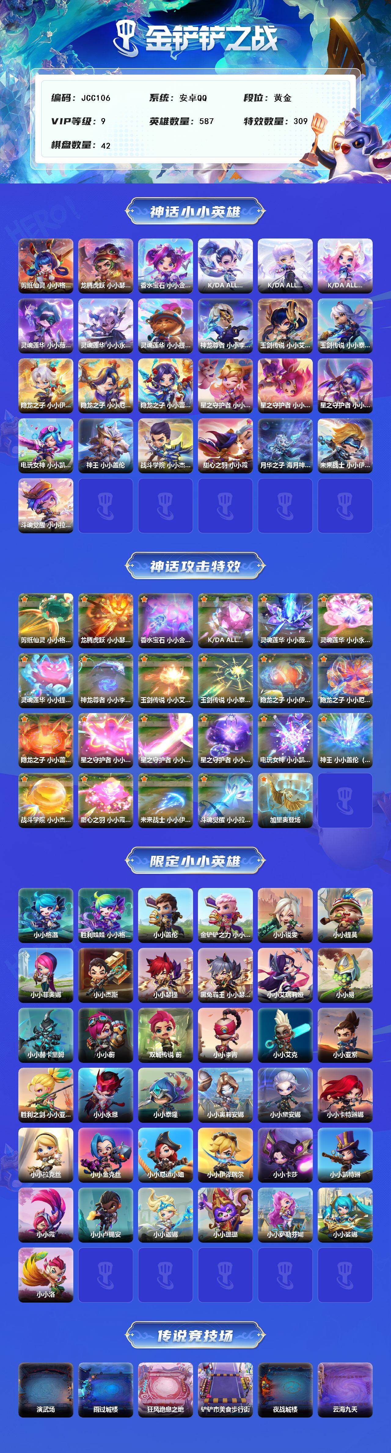 【JCC106】25神话/587小小英雄/42棋盘/剪纸仙灵 小小格温/龙腾虎跃 小小瑟提/香水宝石 小小金克丝/K/DA ALL OUT 小小卡莎/K/DA ALL OUT 小小伊芙琳/K/DA ALL OUT 小小阿狸/灵魂莲华 小小薇恩 Uzi纪念限定/灵魂莲华 小小永恩/灵魂莲华 小小提莫/神龙尊者 小小李青/玉剑传说 小小艾瑞莉娅/玉剑传说 小小泰隆/隐龙之子 小小伊泽瑞尔/隐龙之子 小小厄运小姐/隐龙之子 小小蕾欧娜/星之守护者 小小阿狸/星之守护者 小小拉克丝/星之守护者 小小阿卡
