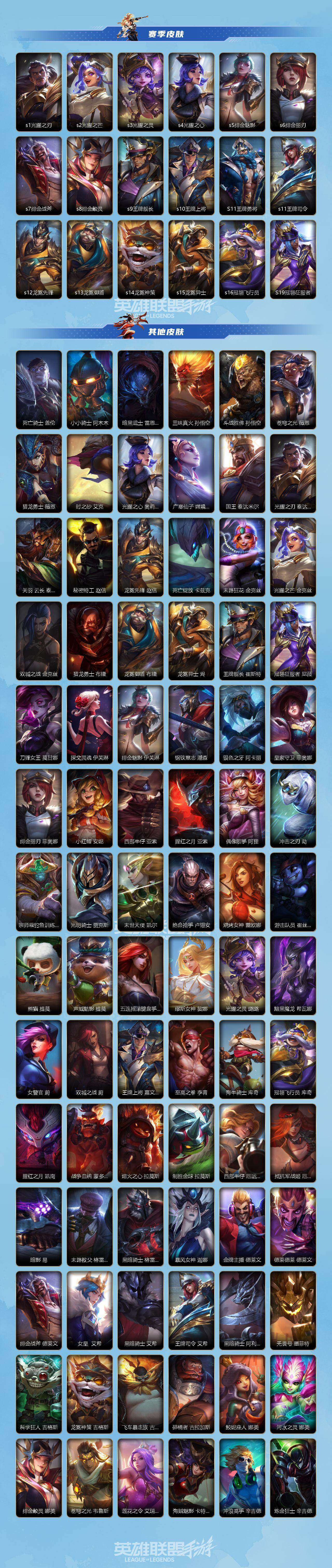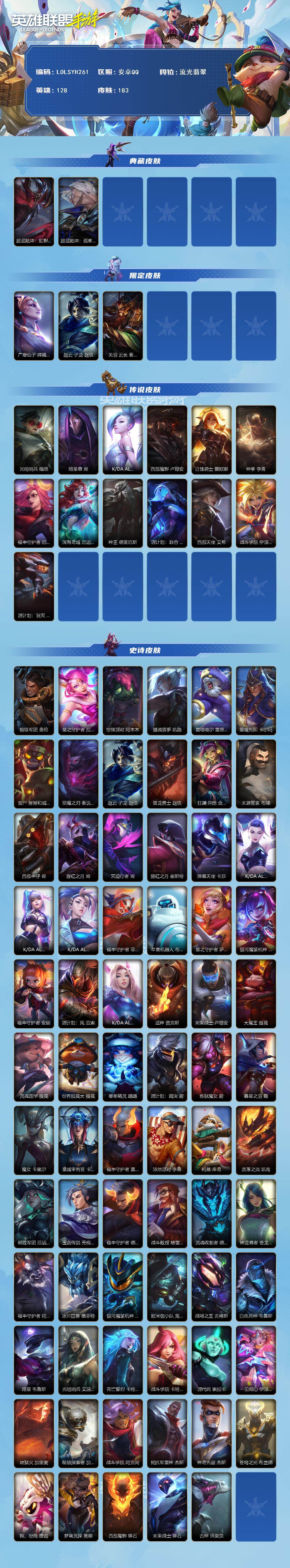 【LOLSYH261】128英雄/183皮肤/2典藏/13传说/流光翡翠/超武乾坤劫/超武乾坤瑟提/广寒仙子 嫦娥 黛安娜/赵云 子龙 赵信/关羽 云长 泰达米尔/光明哨兵 薇恩/暗星尊 烬/K/DA ALL OUT 萨勒芬妮/西部魔影 卢锡安/日蚀骑士 蕾欧娜/神拳 李青/福牛守护者 厄运小姐/深海奇域 厄运小姐/神王 德莱厄斯/源计划:联合 艾希/西部天使 艾希/战斗学院 伊泽瑞尔/源计划:泯灭 雷克顿/钢铁军团 盖伦/星之守护者 拉克丝/惊悚派对 阿木木/摄魂猎手 凯隐/雷喵喵尔 雷恩加尔