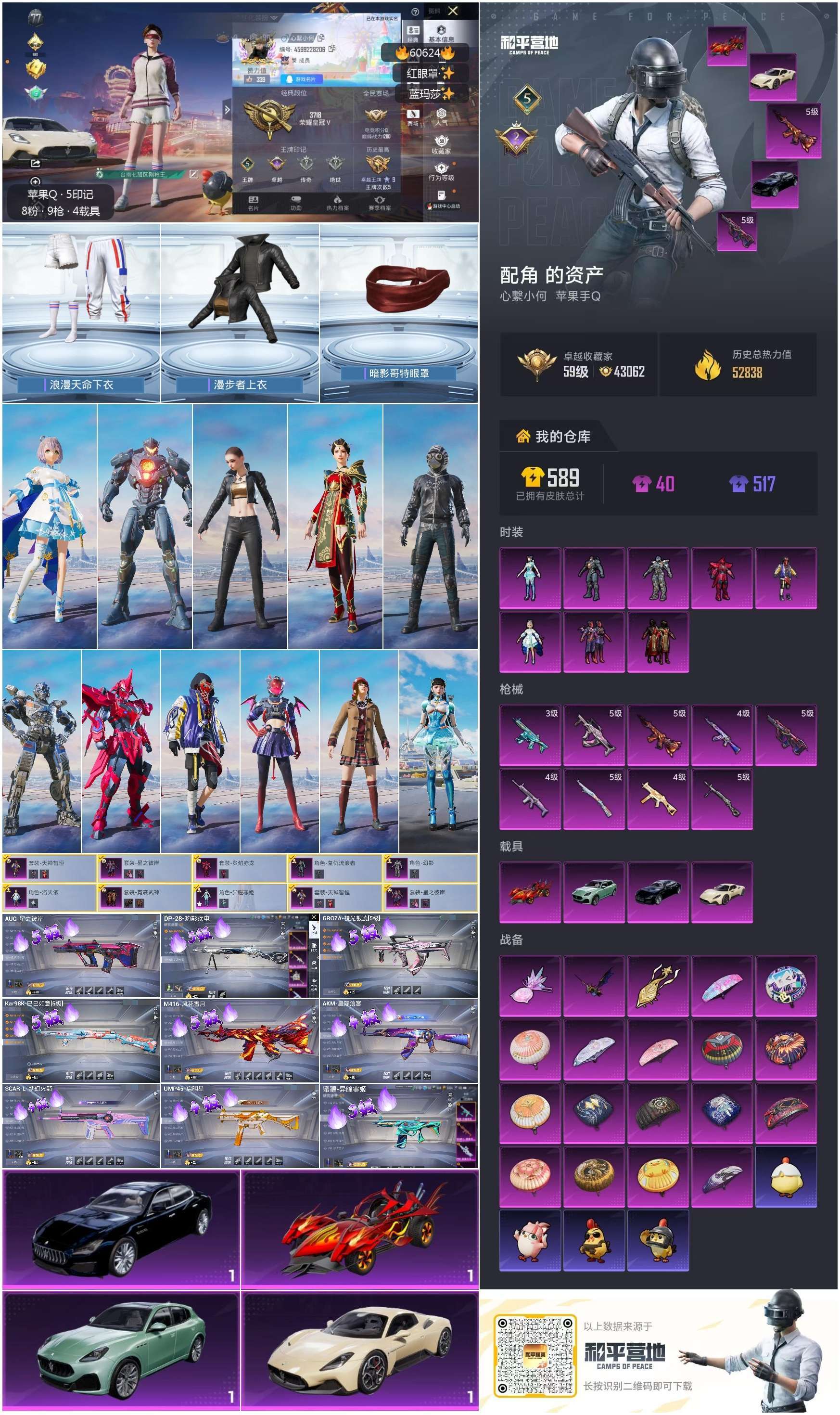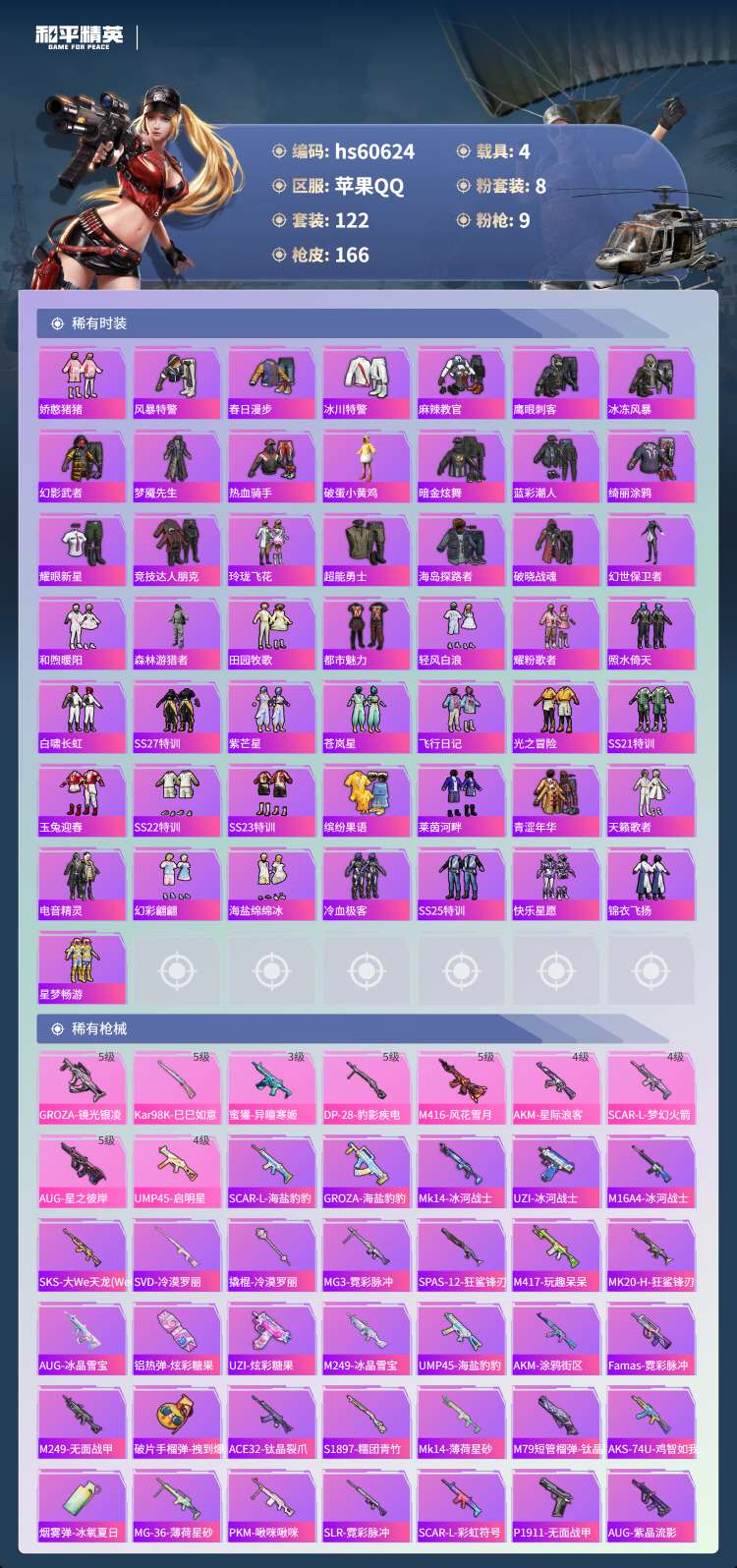 hs60624 苹果手Q-5王牌印记-8粉装-9特效枪-4载具-52838热力值-122套装-166