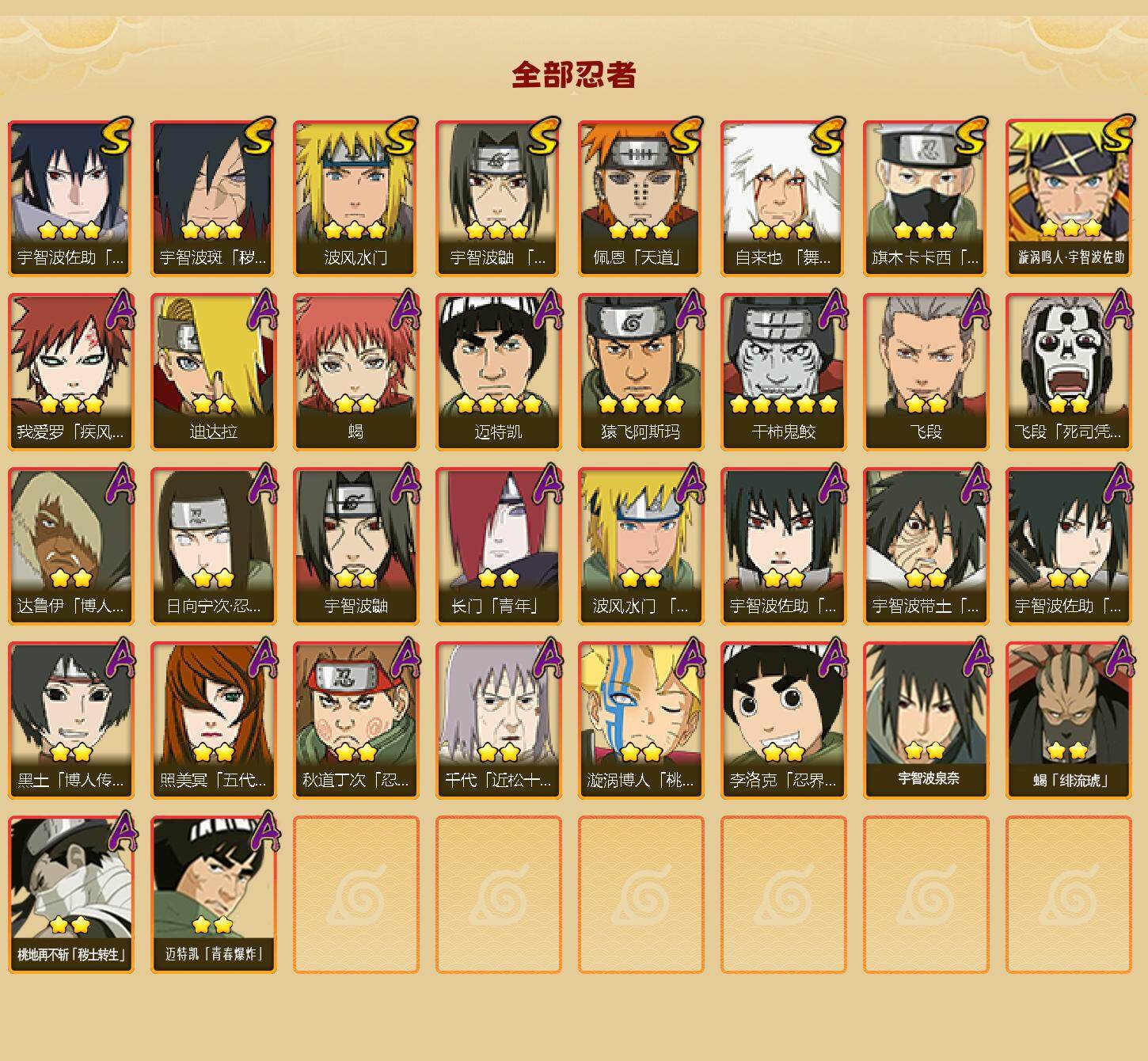 【S级忍者】:宇智波斑「秽土转生·解」(3星),宇智波鼬「须佐能乎」(3星),旗木卡卡西「须佐能乎」(3星),自来也「舞之豪杰」(3星),波风水门(3星),佩恩「天道」(3星),宇智波佐助「永恒万花筒」(3星),漩涡鸣人·宇智波佐助(3星)