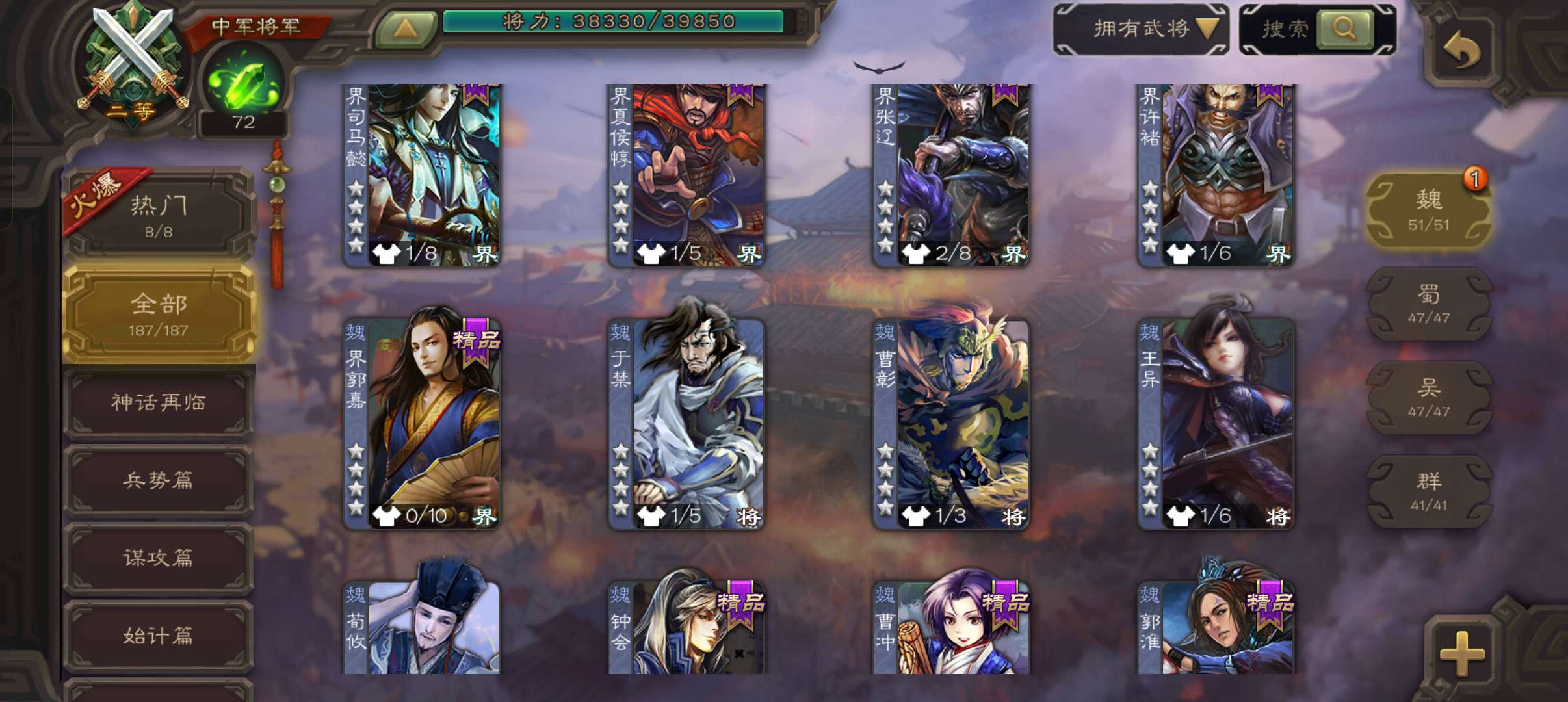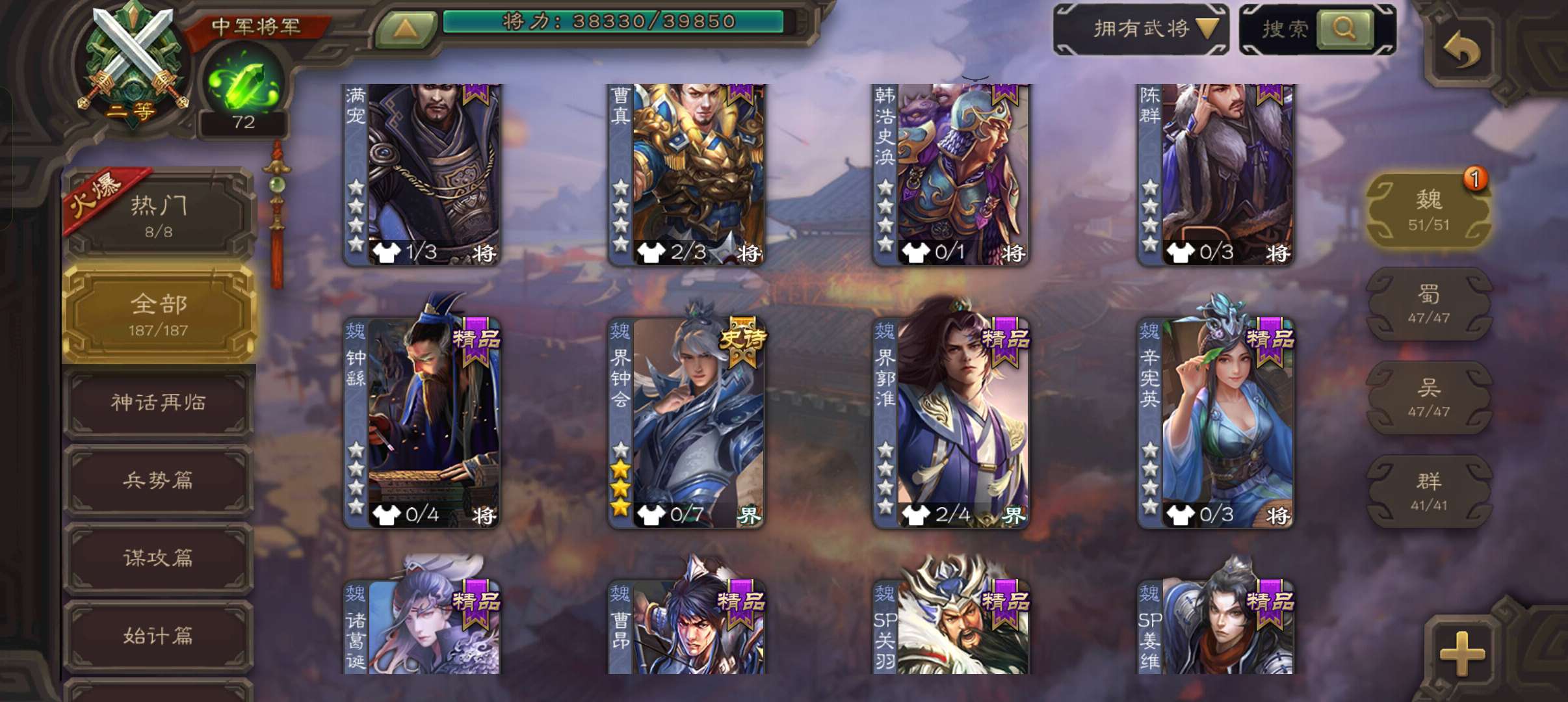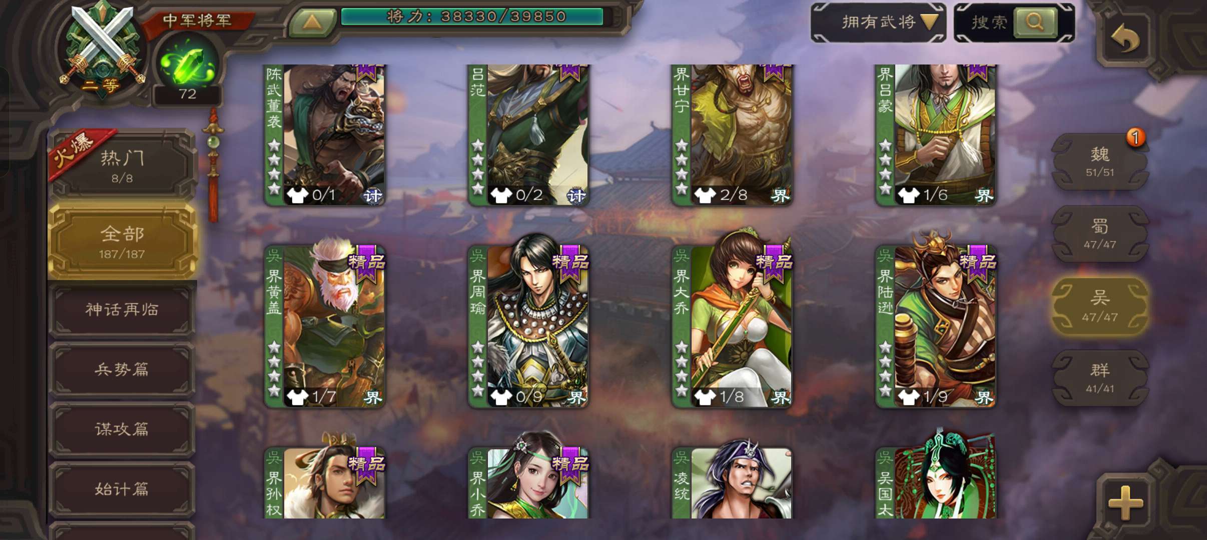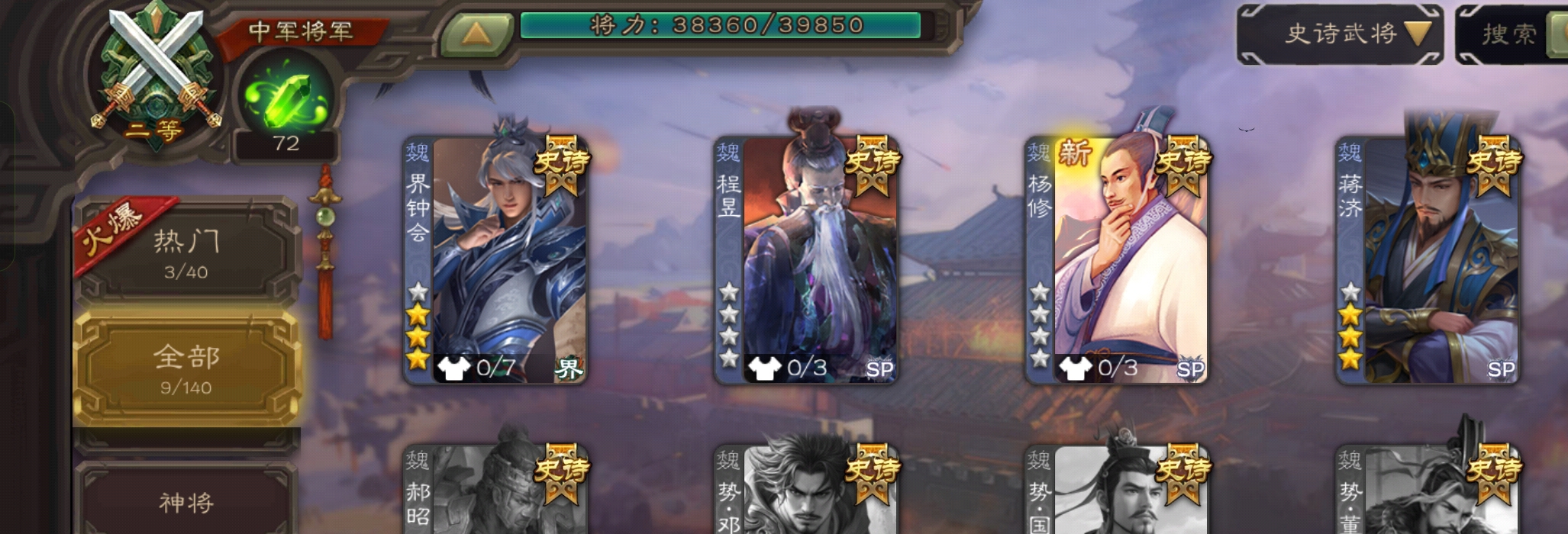 9史诗中军,蒋济界钟会神刘备谯周花鬘界黄忠沮授杨修程昱,神吕蒙真动界吕布动诸葛果动界陆逊187将