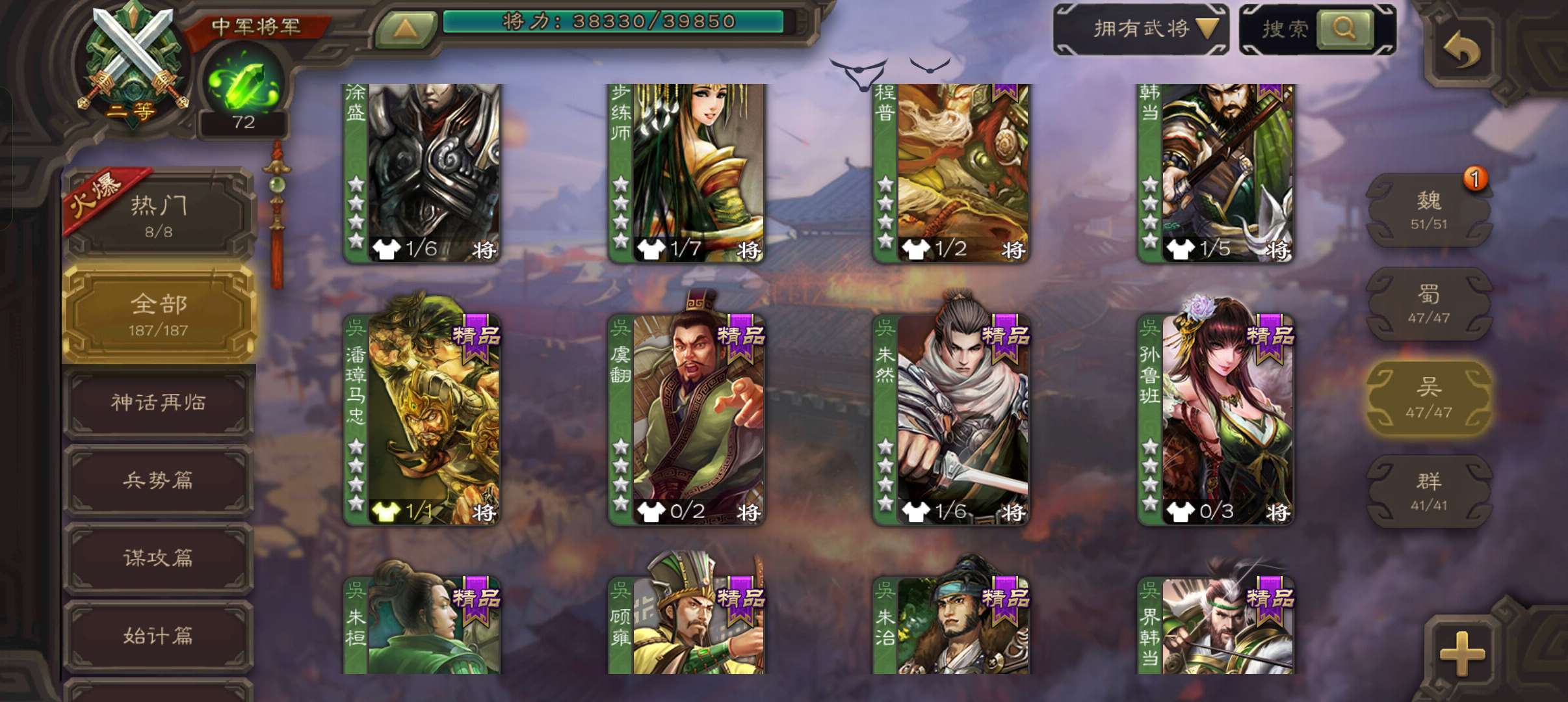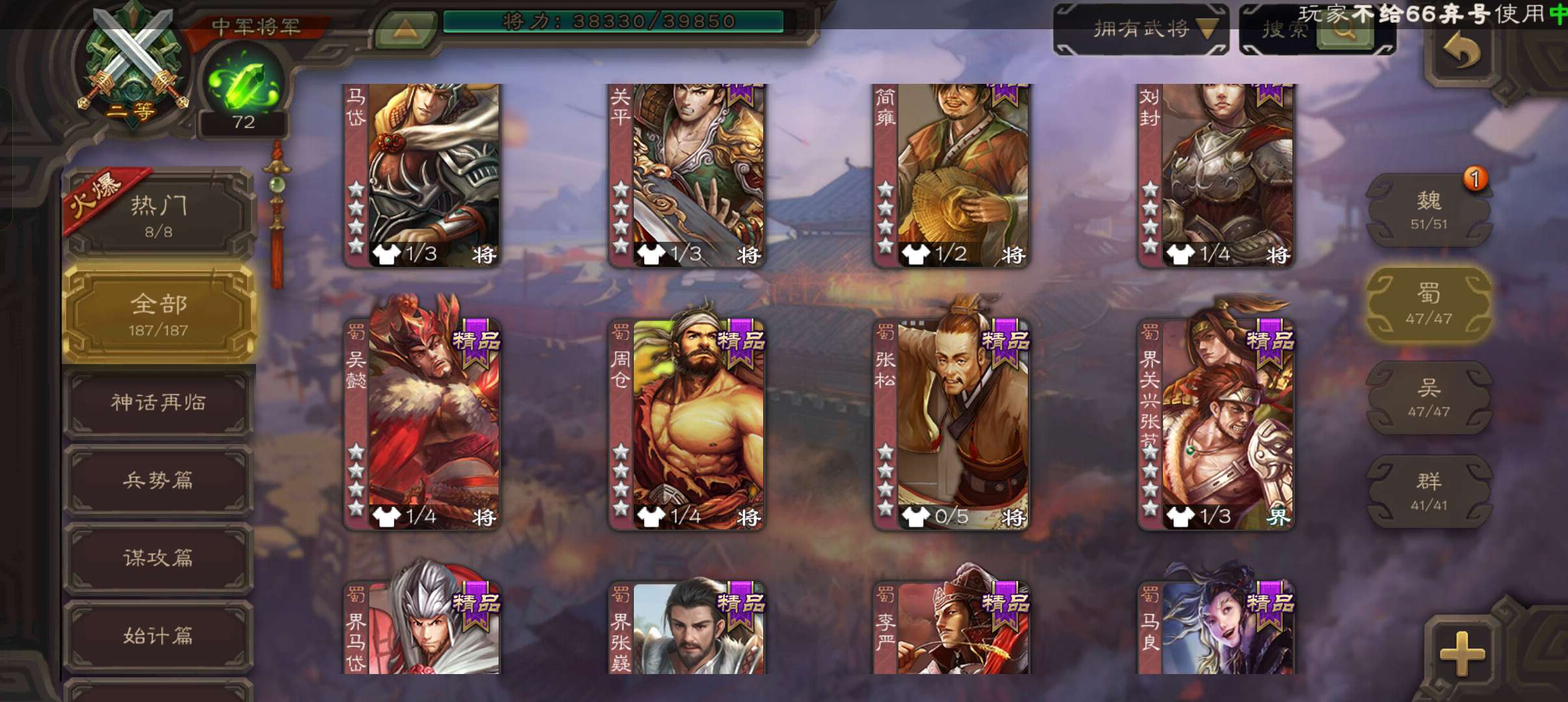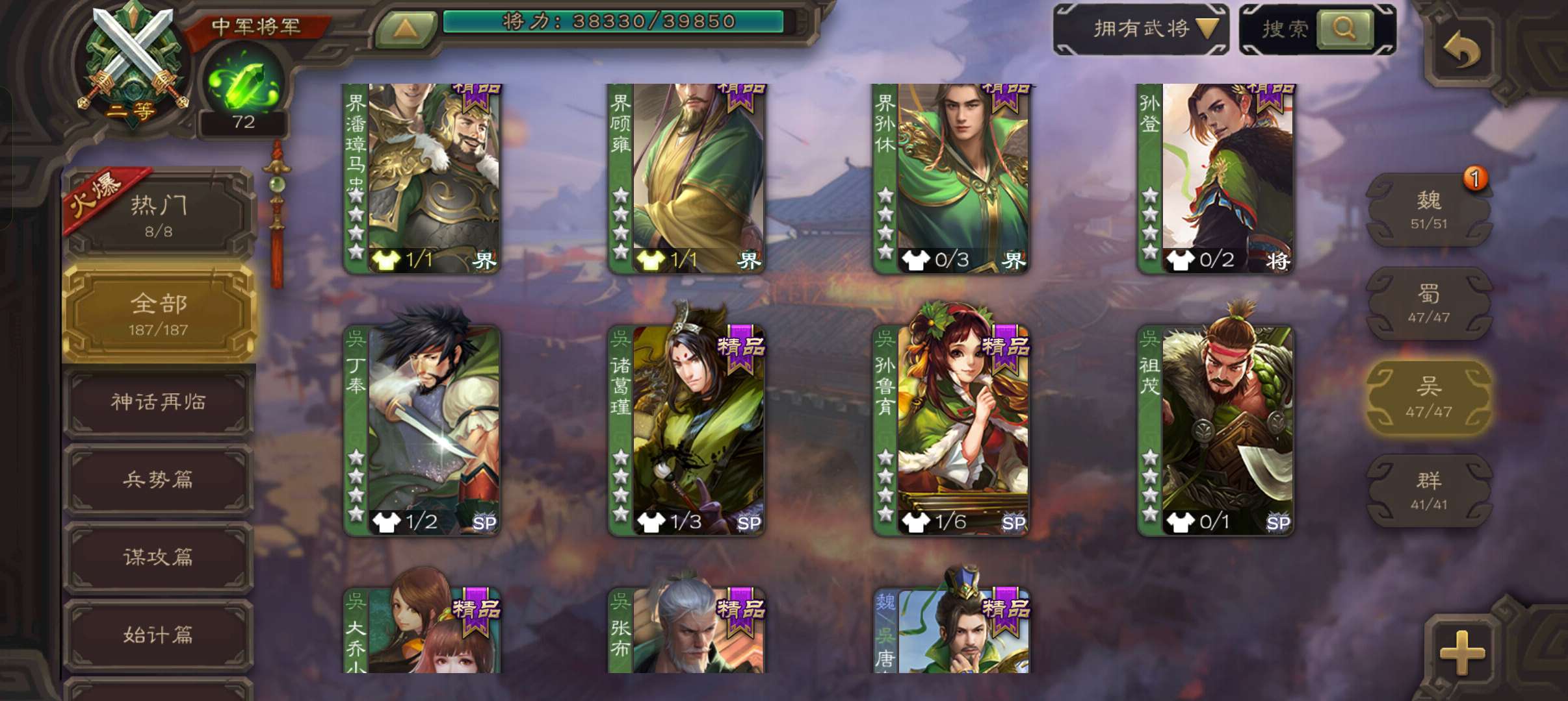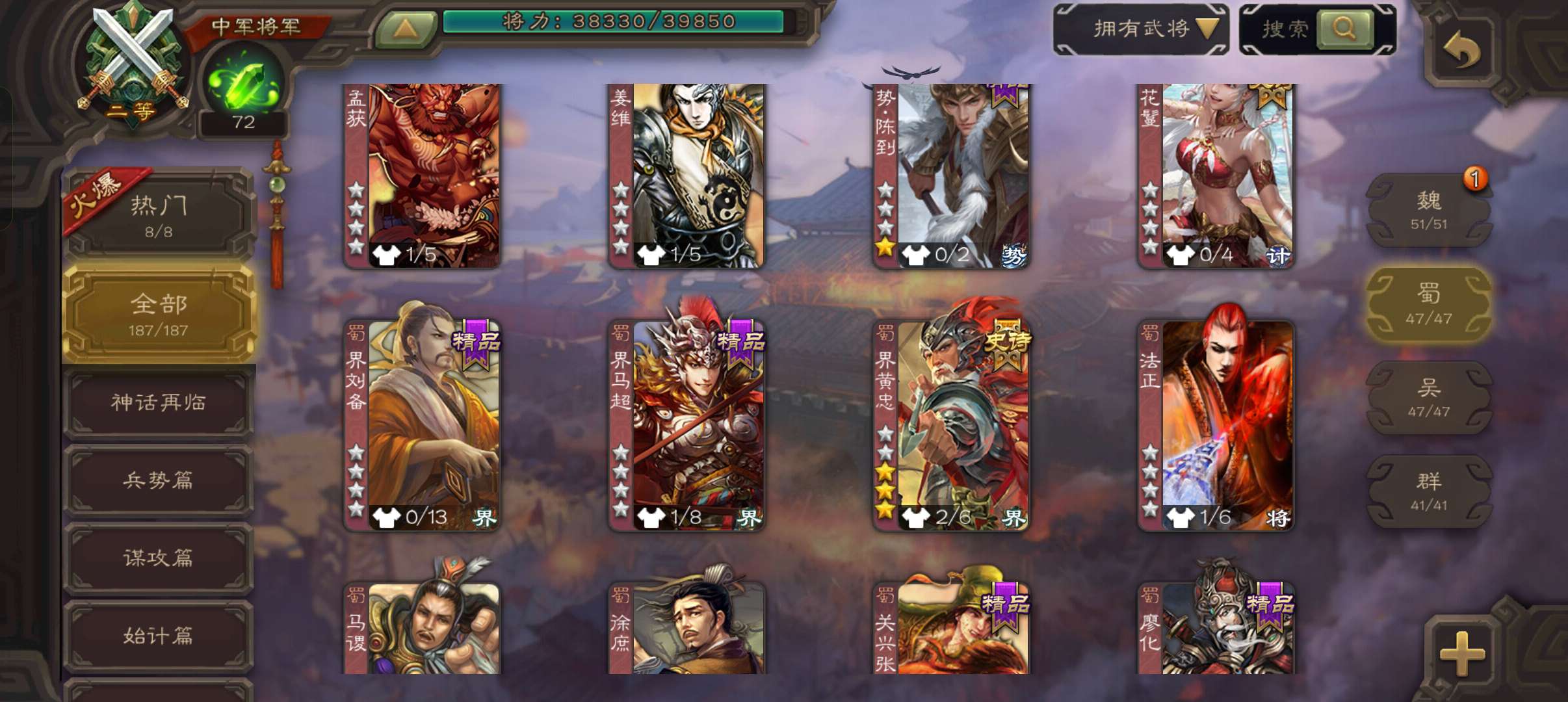 9史诗中军,蒋济界钟会神刘备谯周花鬘界黄忠沮授杨修程昱,神吕蒙真动界吕布动诸葛果动界陆逊187将