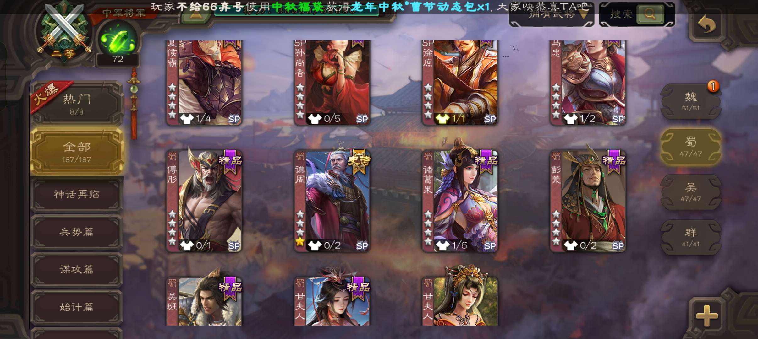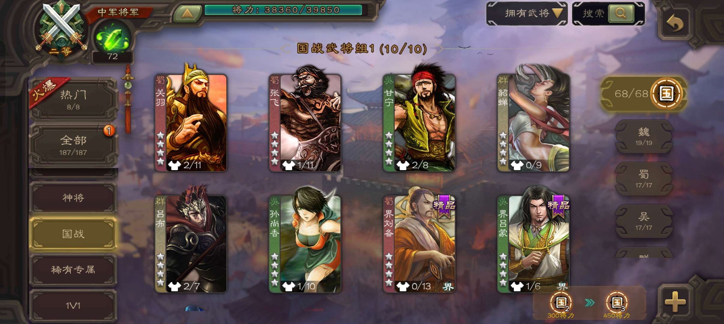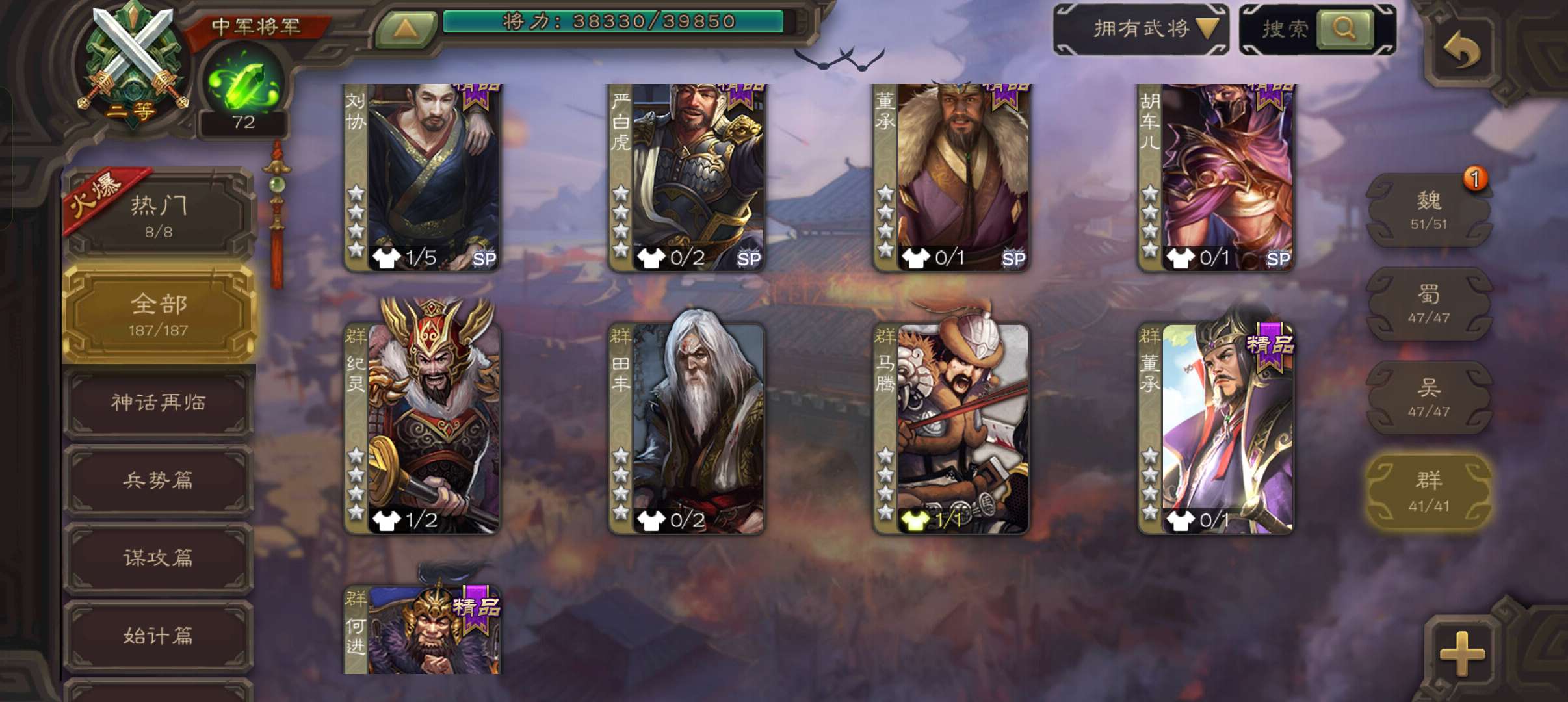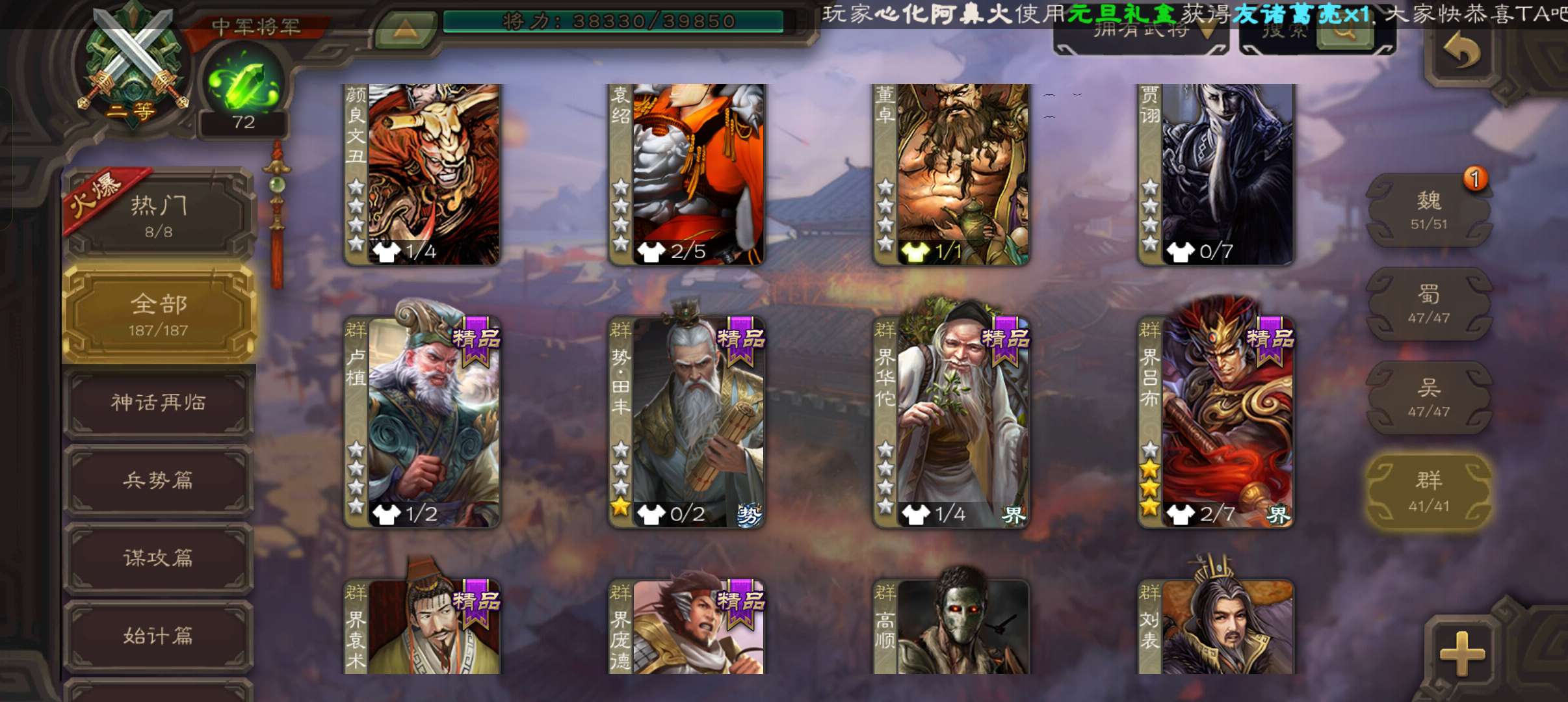 9史诗中军,蒋济界钟会神刘备谯周花鬘界黄忠沮授杨修程昱,神吕蒙真动界吕布动诸葛果动界陆逊187将