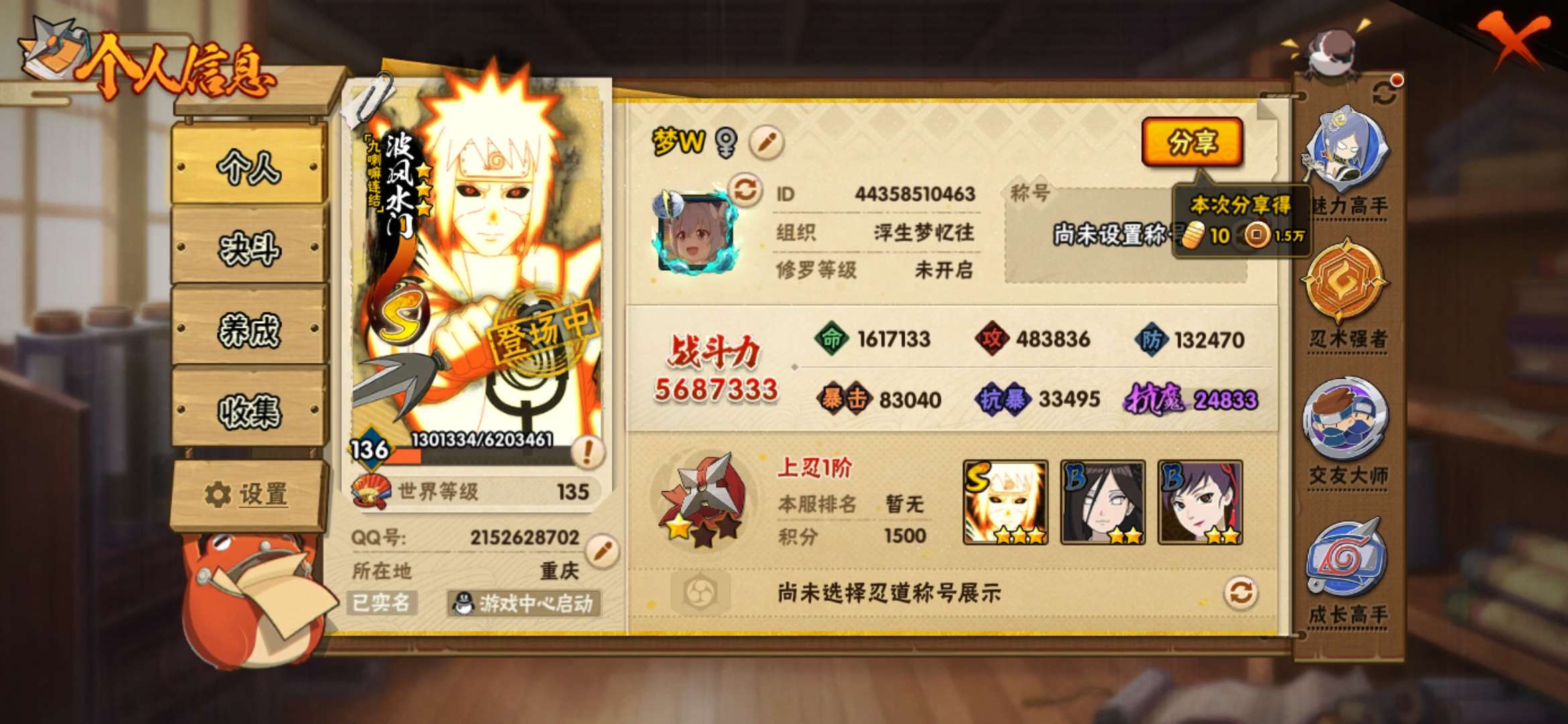 v5,9s准11s,30A,530w战力,大筒木舍人60片,白面具40片,卡卡西,解斑,九喇嘛波风水
