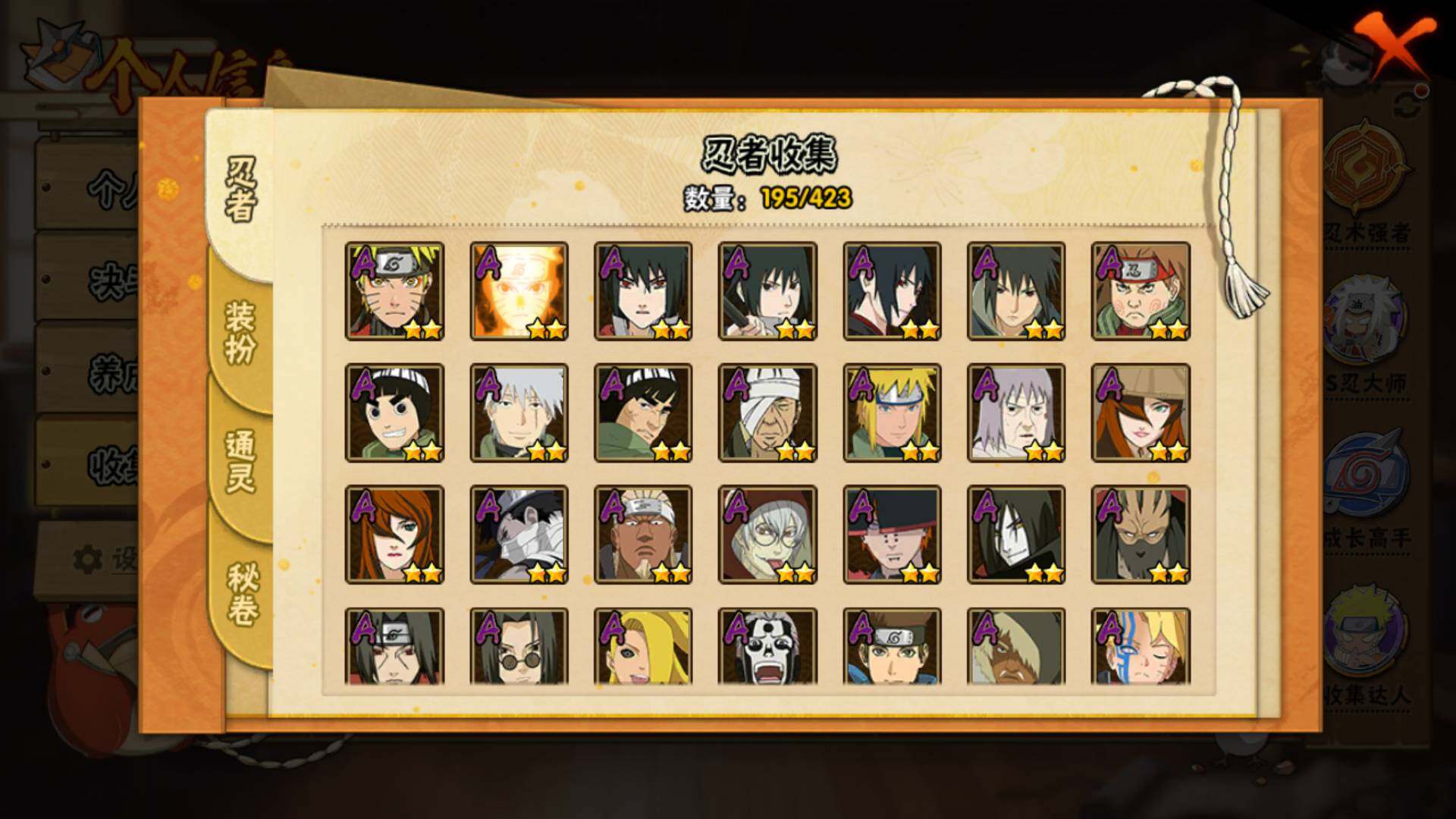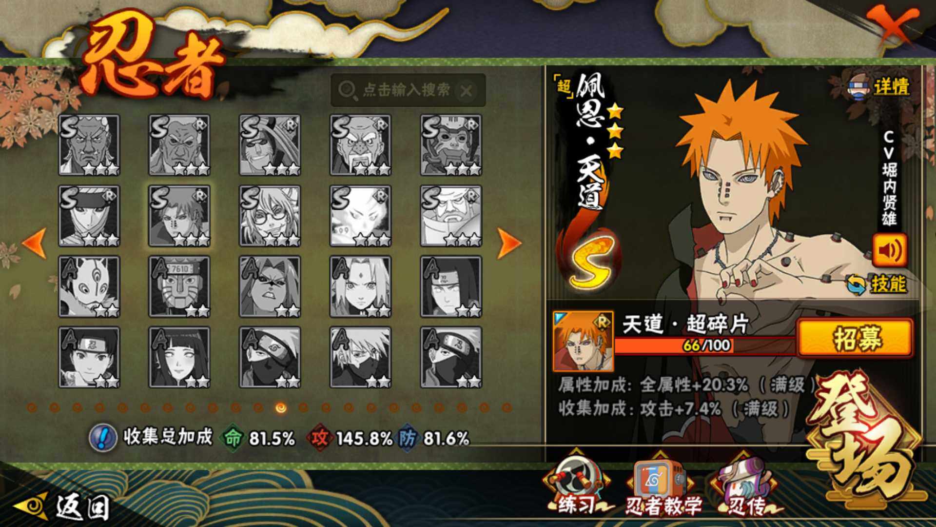 【S级忍者】:长门「秽土转生」(3星),猿飞日斩「秽土转生」(3星),波风水门「秽土转生」(3星),千手扉间「秽土转生」(3星),宇智波斑「秽土转生」(3星),大野木「忍界大战」(3星),宇智波带土「忍界大战」(3星),艾「忍界大战」(3星),宇智波鼬「须佐能乎」(3星),旗木卡卡西「须佐能
