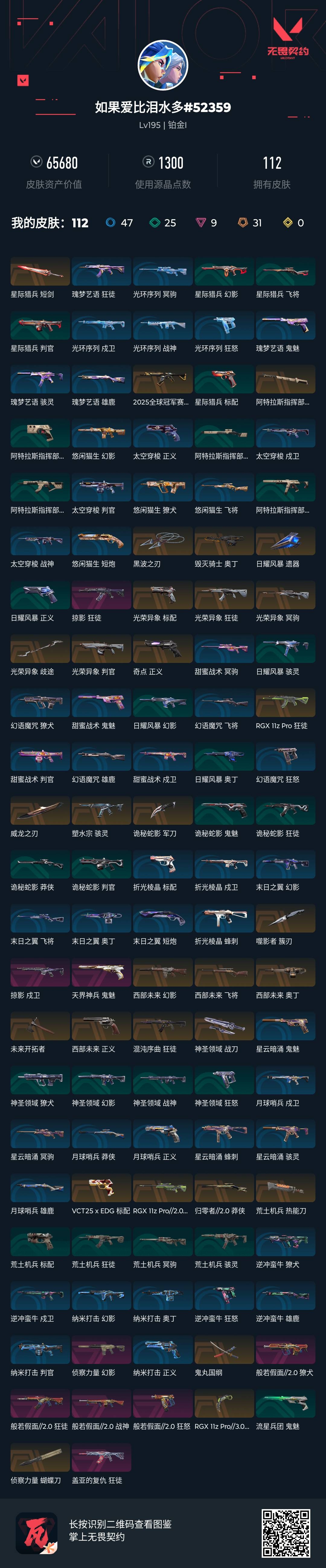 ZMWW583【25英雄 112皮肤 资产65680 掌瓦005379631 西部未来套装 光荣异象套装 般若套装 25冠军枪皮 奥丁 RGX狂徒 刀皮- 鬼丸 侦察蝴蝶刀 RGX 噬影者 威龙之刃 黑波之刃】游戏等级195-段位:铂金-皮肤价值65680-已用源晶点数1300-英雄25-武器皮肤112 星际猎兵-短剑 2025全球冠军赛-狂徒 阿特斯拉指挥部-甩棍 黑波之刃 毁灭骑士-奥丁 日耀风暴-遗器 掠影-狂徒 光荣异象-标配 光荣异象-狂徒 光荣异象-冥驹 光荣异象-歧途 光荣异