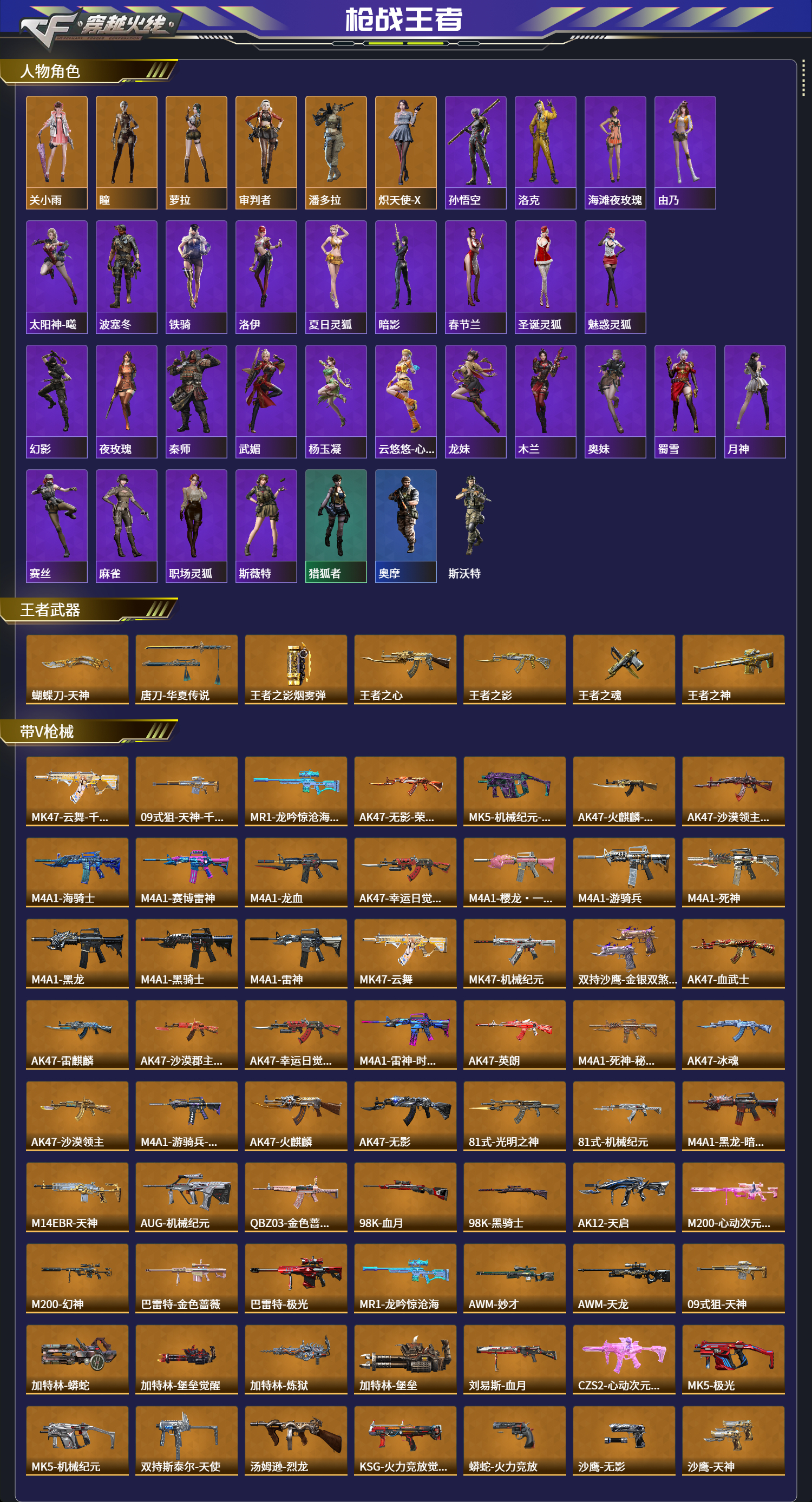 【人物角色】孙悟空,洛克,关小雨,海滩夜玫瑰,由乃,瞳,潜龙队,太阳神-曦,大老师,波塞冬,运动宝贝兰,铁骑,洛伊,洛伊,萝拉,夏日灵狐,暗影,春节兰,春节兰,春节兰,春节兰,春节兰,春节兰,圣诞灵狐,圣诞灵狐,圣诞灵狐,魅惑灵狐,审判者,幻影,夜玫瑰,潘多拉,猎狐者,猎狐者,猎狐者,奥摩,斯沃特,秦师,炽天使-X,武媚,杨玉凝,云悠悠-心