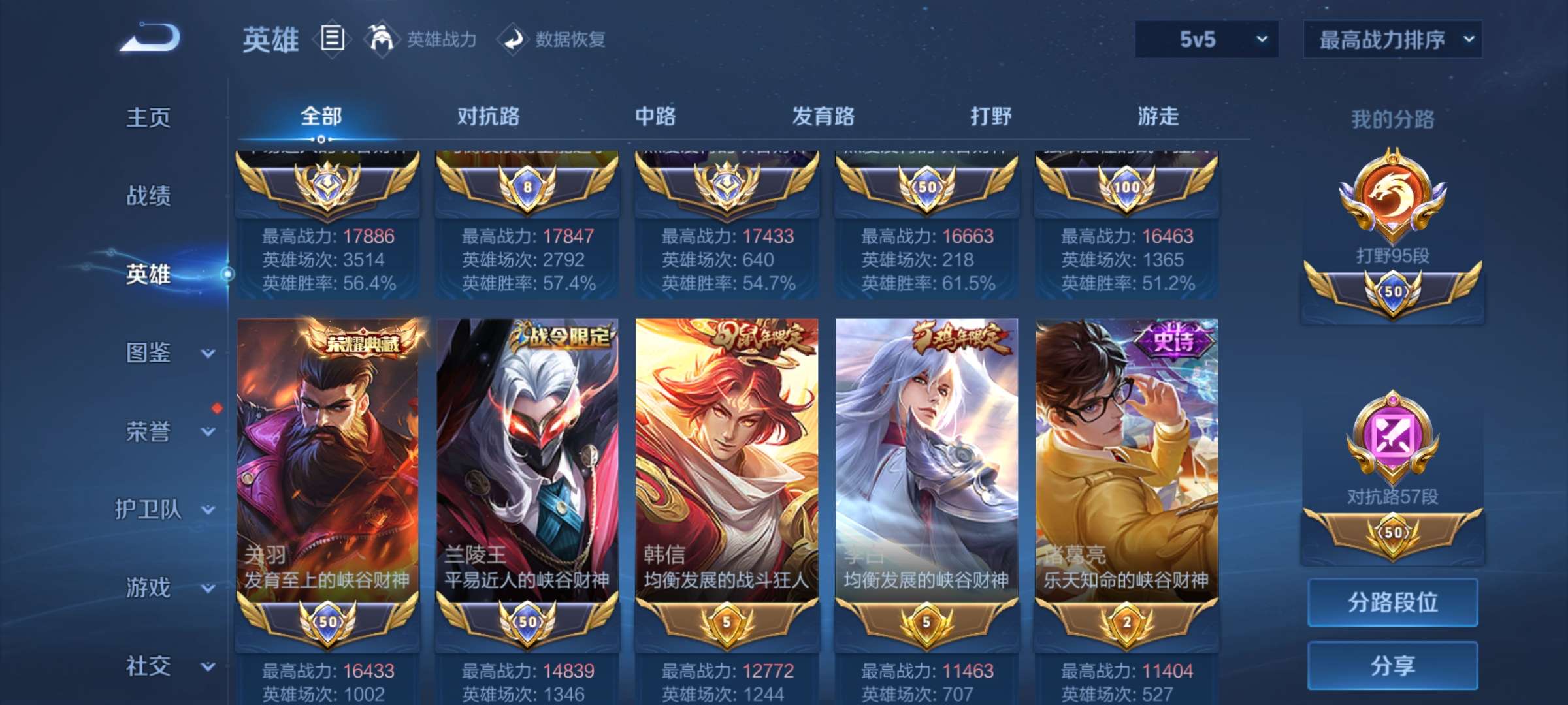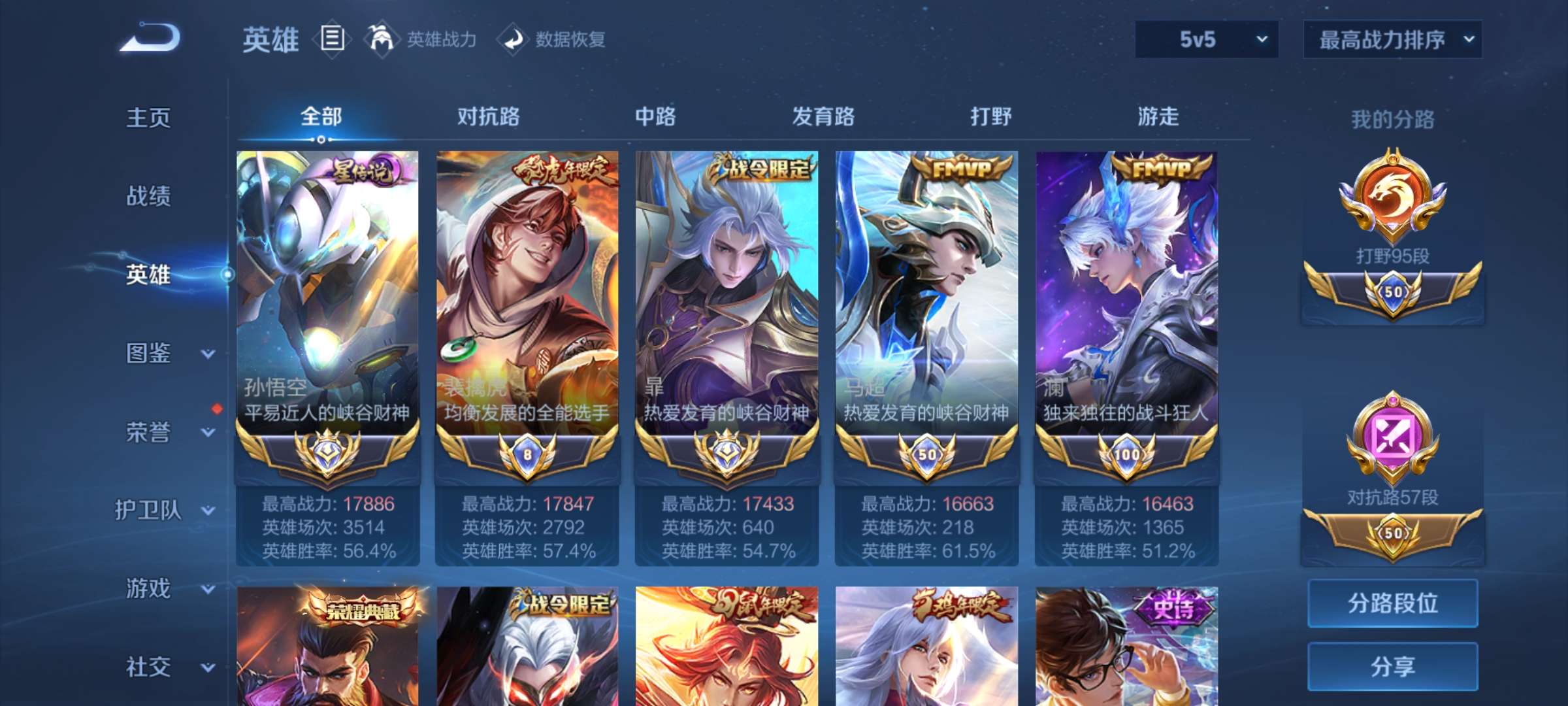 95国服打野,大国暃,大国孙悟空,国8裴擒虎,马超,澜,关羽。热门打野对抗