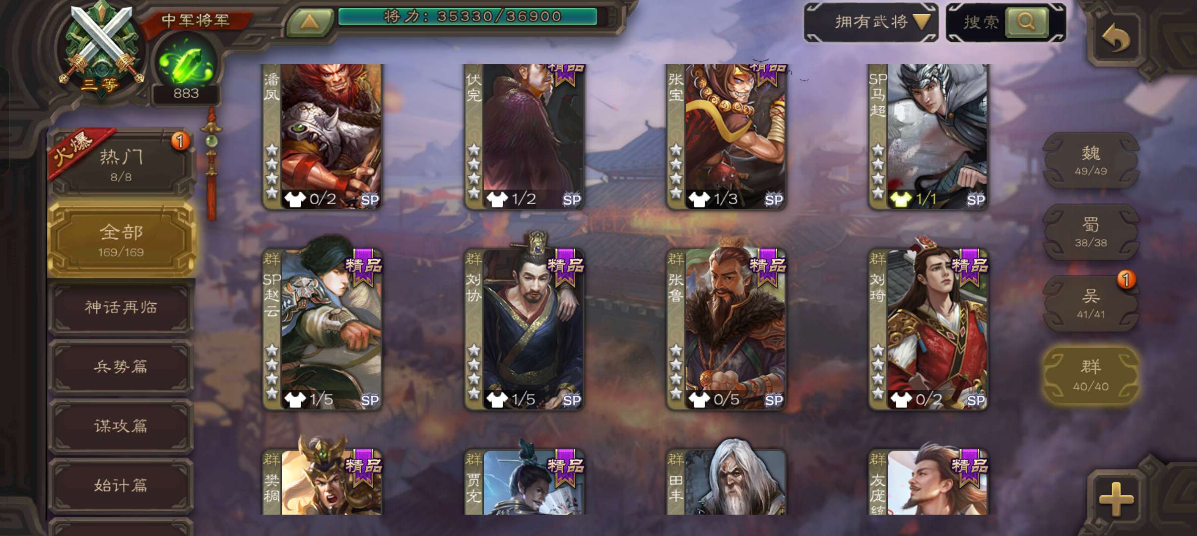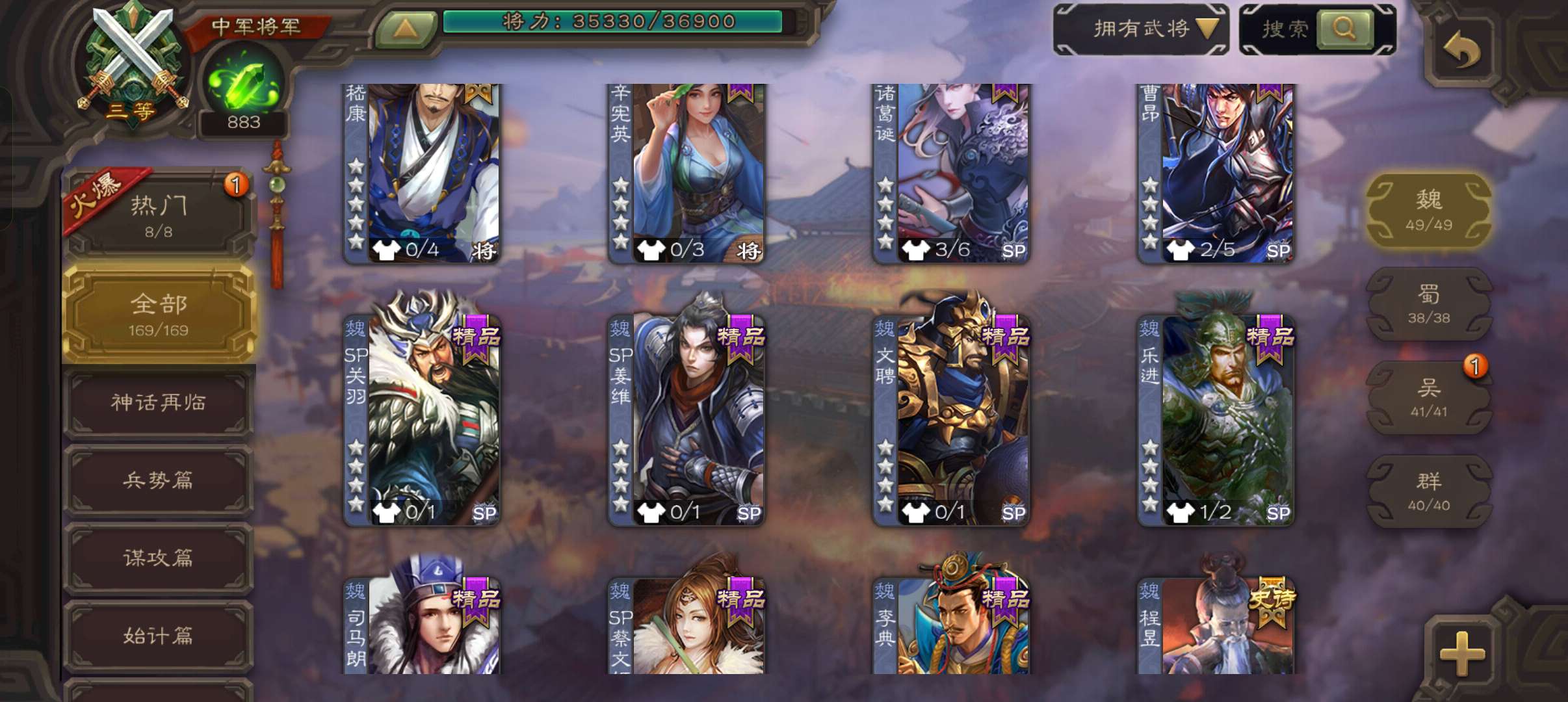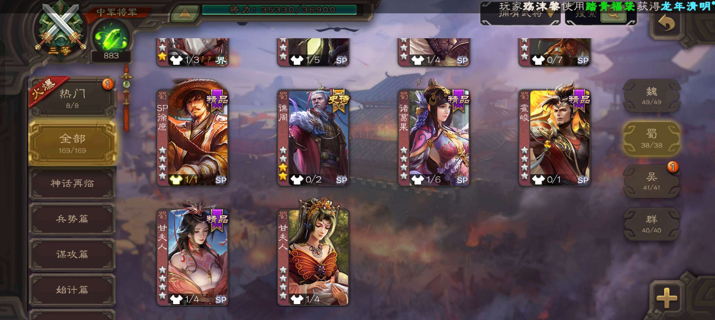 8史诗中军,真动许攸玉龙界李儒神吕布界钟会谯周嵇康左慈程昱,蔡贞姬sp赵云动诸葛果动界周瑜169将