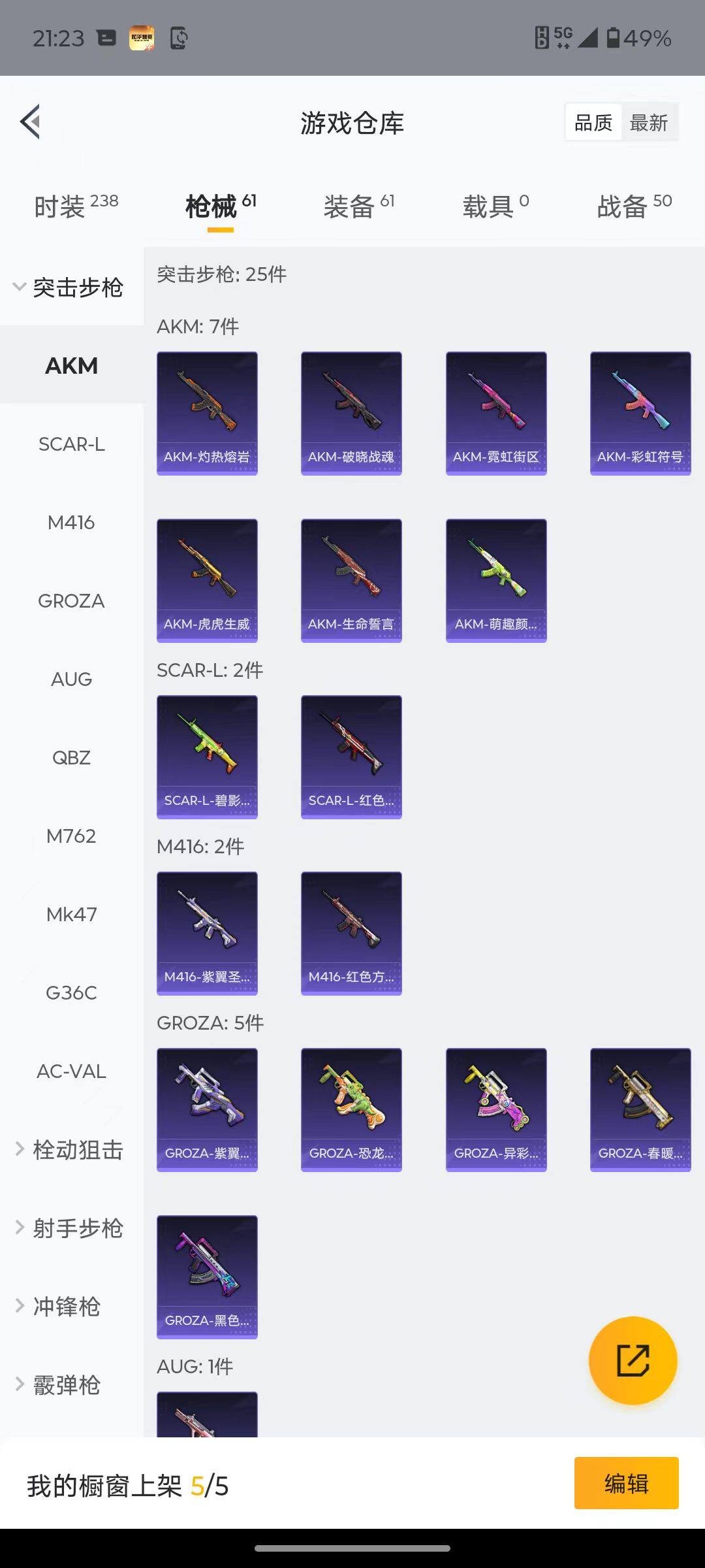 【稀有武器皮肤】:AKM-彩虹符号,AKM-灼热熔岩,AKM-生命誓言,AKM-破晓战魂,AKM-萌趣颜团子,AKM-虎虎生威,AKM-霓虹街区,SCAR-L-碧影闪光,SCAR-L-红色方程式,M416-紫翼圣骑,M416-红色方程式,GROZA-异彩