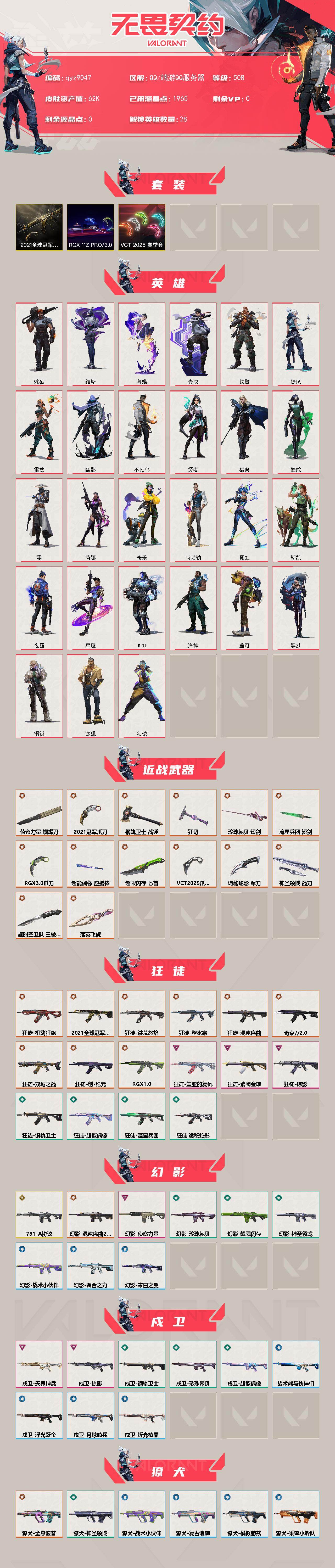 【近战武器】:近战武器-2021全球冠军赛 爪刀,近战武器-超时空卫队 三棱军刺,近战武器-侦察力量 蝴蝶刀,近战武器-VCT 2025 爪刀,近战武器-RGX 11z Pro//3.0 爪刀,近战武器-落英飞旋,近战武器-珍珠棘贝 短剑,近战武器-流星兵团 短剑,近战武器-超能偶像 应援棒,近战武器-超限闪存 匕首,近战武器-钢轨卫士 战锤,近战武器-狂切,近战武器-诡秘蛇影 军刀,近战武器-神圣领域 战刀