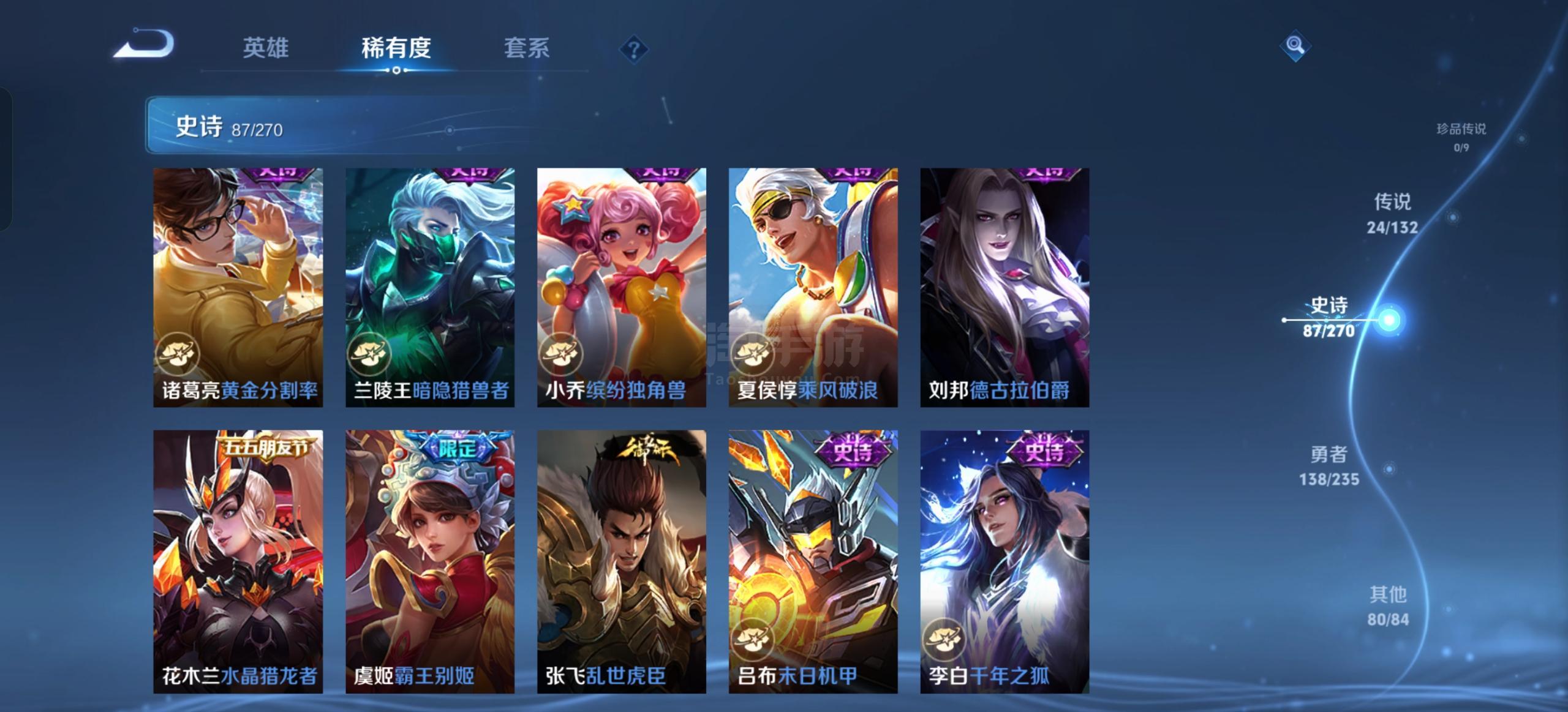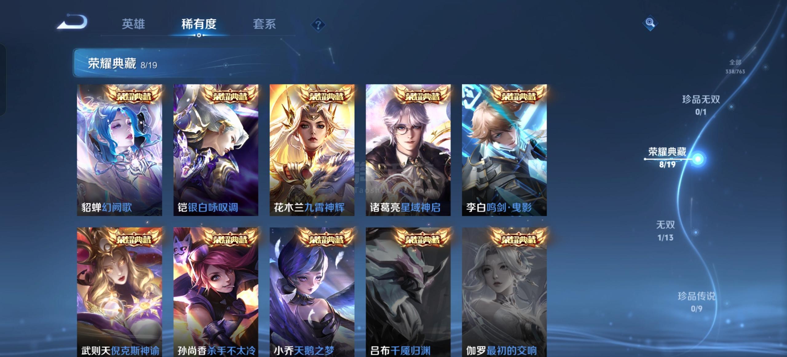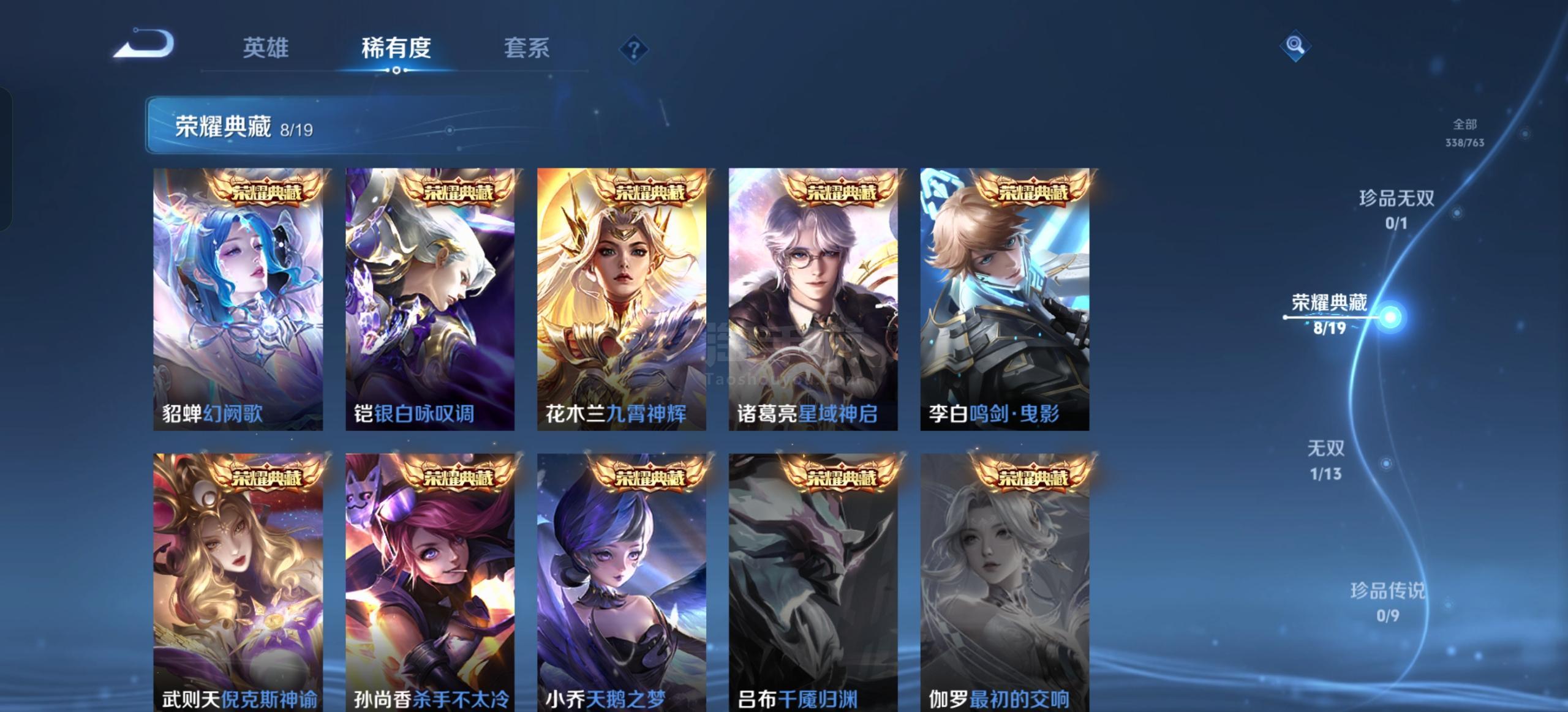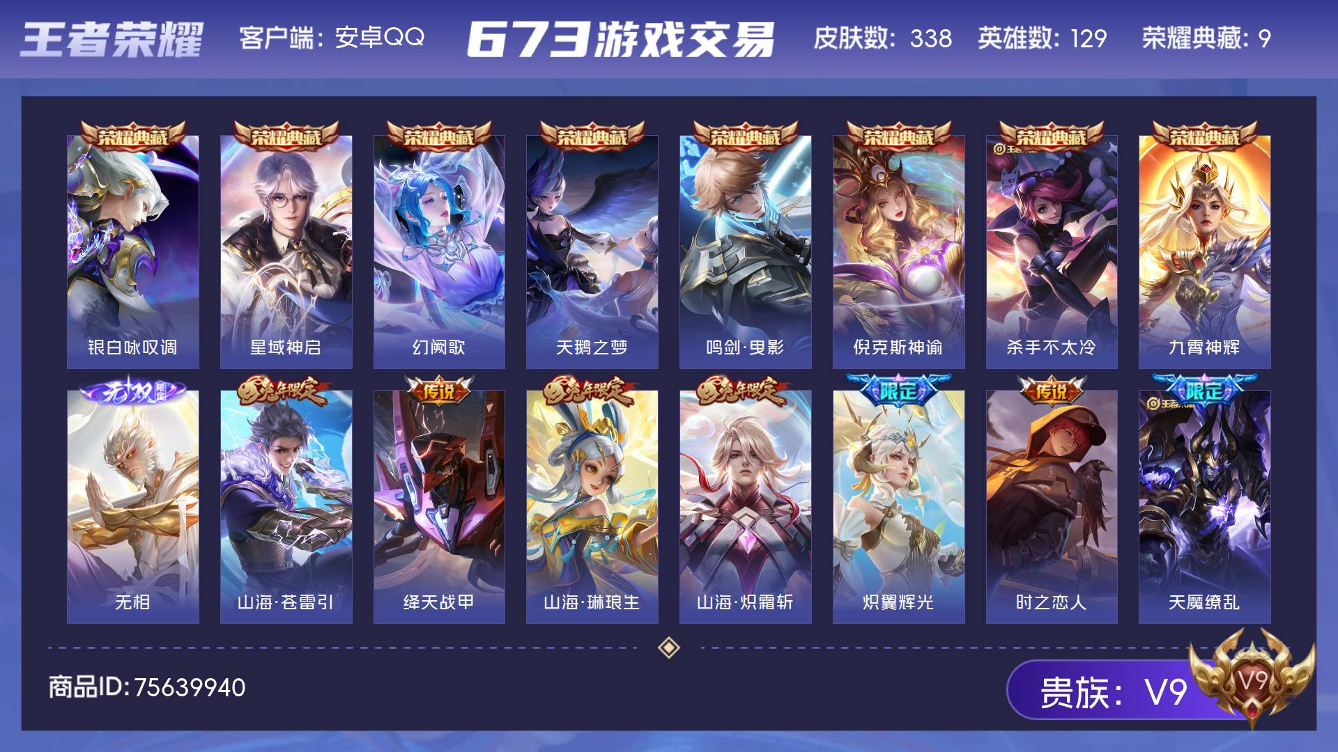安卓QQ-皮肤338 英雄129 永恒钻石 荣耀典藏9 无双皮肤1 传说24 星传说3 天幕1 史诗87