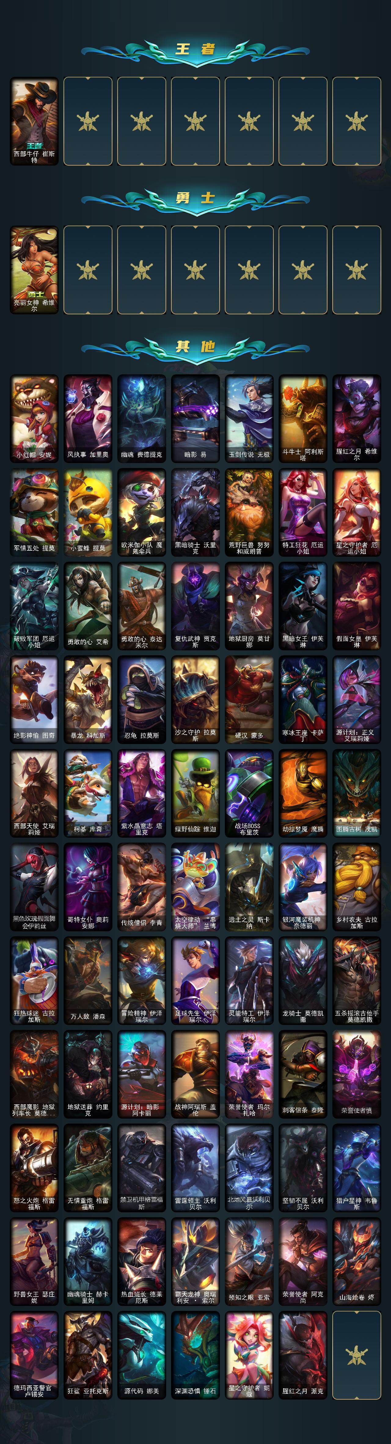 172英雄/154皮肤/3神话/13限定/4臻彩/23炫彩/16传说/44史诗/未定级/