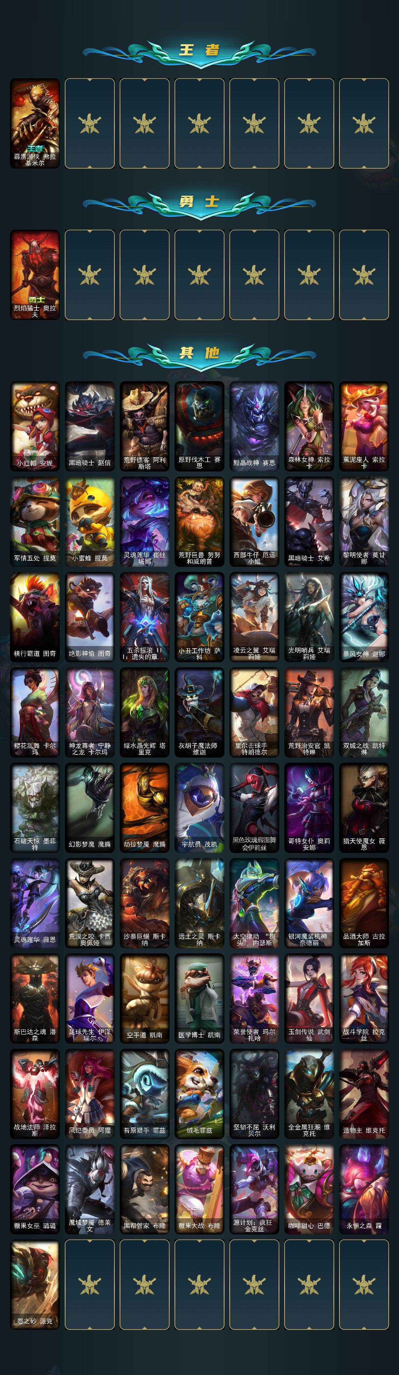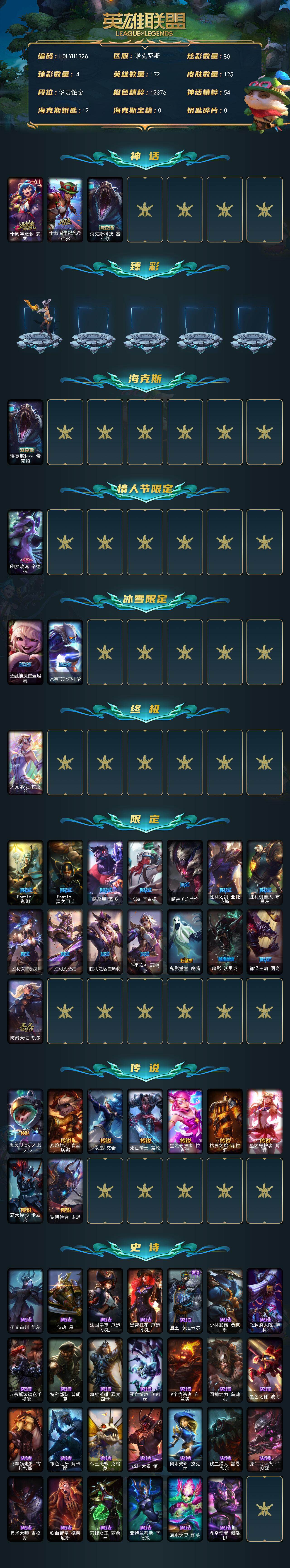 172英雄/125皮肤/1终极/3神话/19限定/4臻彩/80炫彩/9传说/27史诗/铂金/十周年纪念安妮/