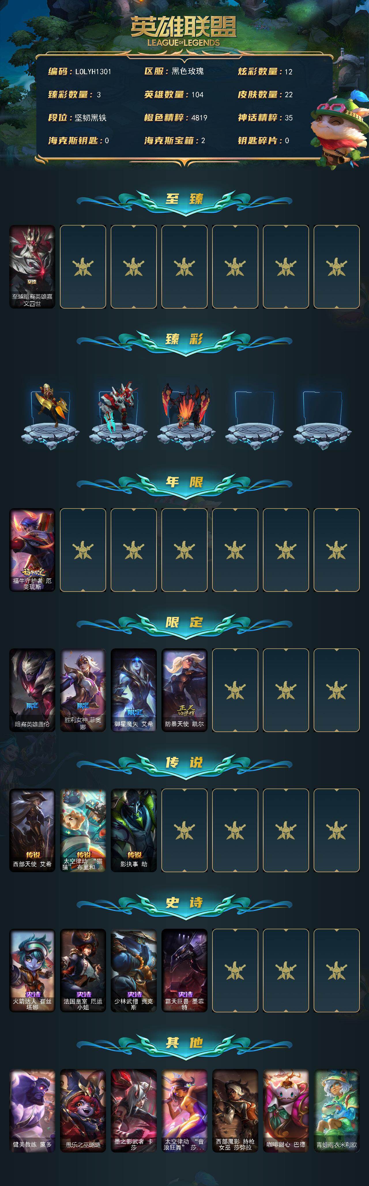 【LOLYH1301】104英雄/22皮肤/1神话/6限定/3臻彩/12炫彩/3传说/4史诗/未定级/至臻暗裔英雄嘉文四世/征服者韦鲁斯炫金/霸天战士雷恩加尔星啸天火/山海绘卷科加斯朱红/福牛守护者厄斐琉斯/暗裔英雄盖伦/胜利女神菲奥娜/御星魔矢艾希/防暴天使凯尔/西部天使艾希/太空律动猫猫布里和里茨/影执事劫/火箭达人崔丝塔娜/法国皇室厄运小姐/少林武僧贾克斯/霸天巨兽墨菲特/健美教练蒙多/愚乐之巫璐璐/墨之影武者卡莎/太空律动音浪狂舞莎弥拉/西部魔影持枪女巫莎弥拉/咖啡甜心巴德/青蛙雨衣米利