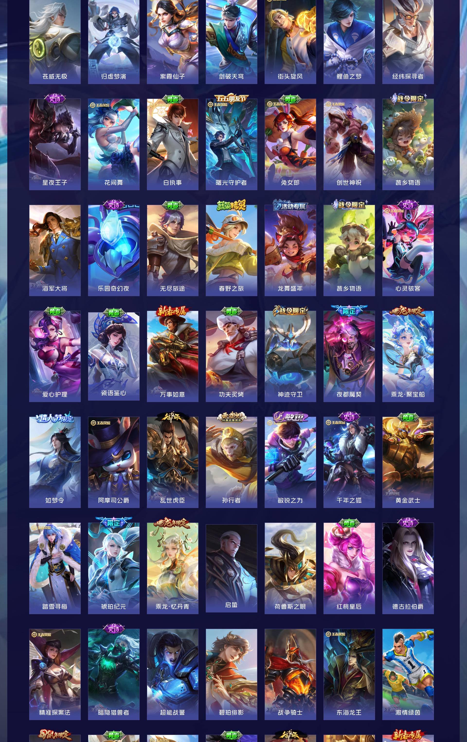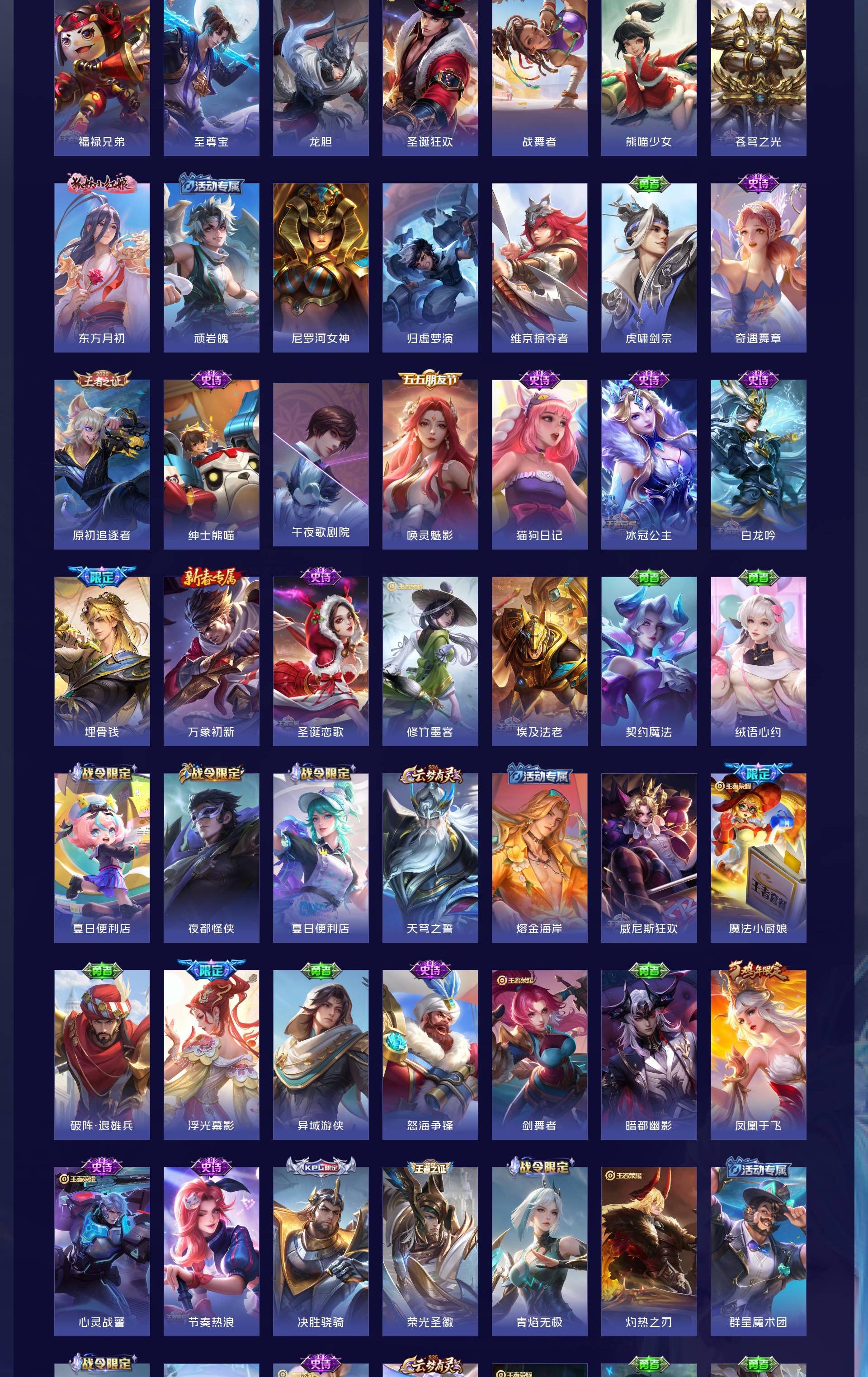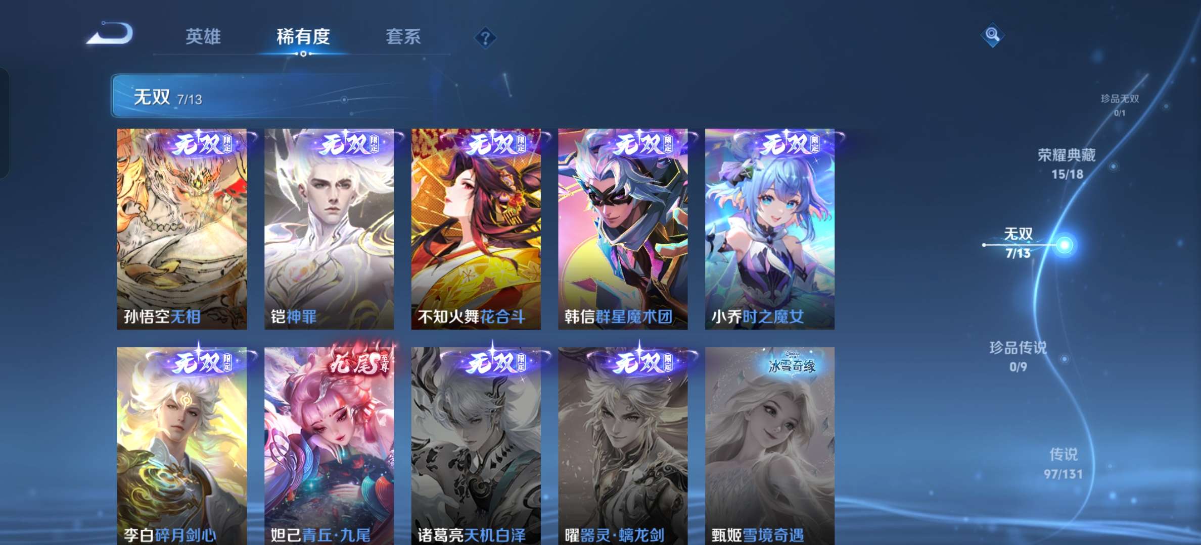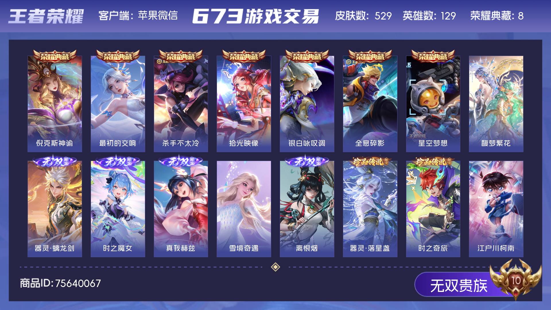 无双贵族 皮肤529 英雄129 至尊星耀 荣耀典藏8 珍品无双1 无双皮肤5 珍品传说3 传说68 其他皮肤449