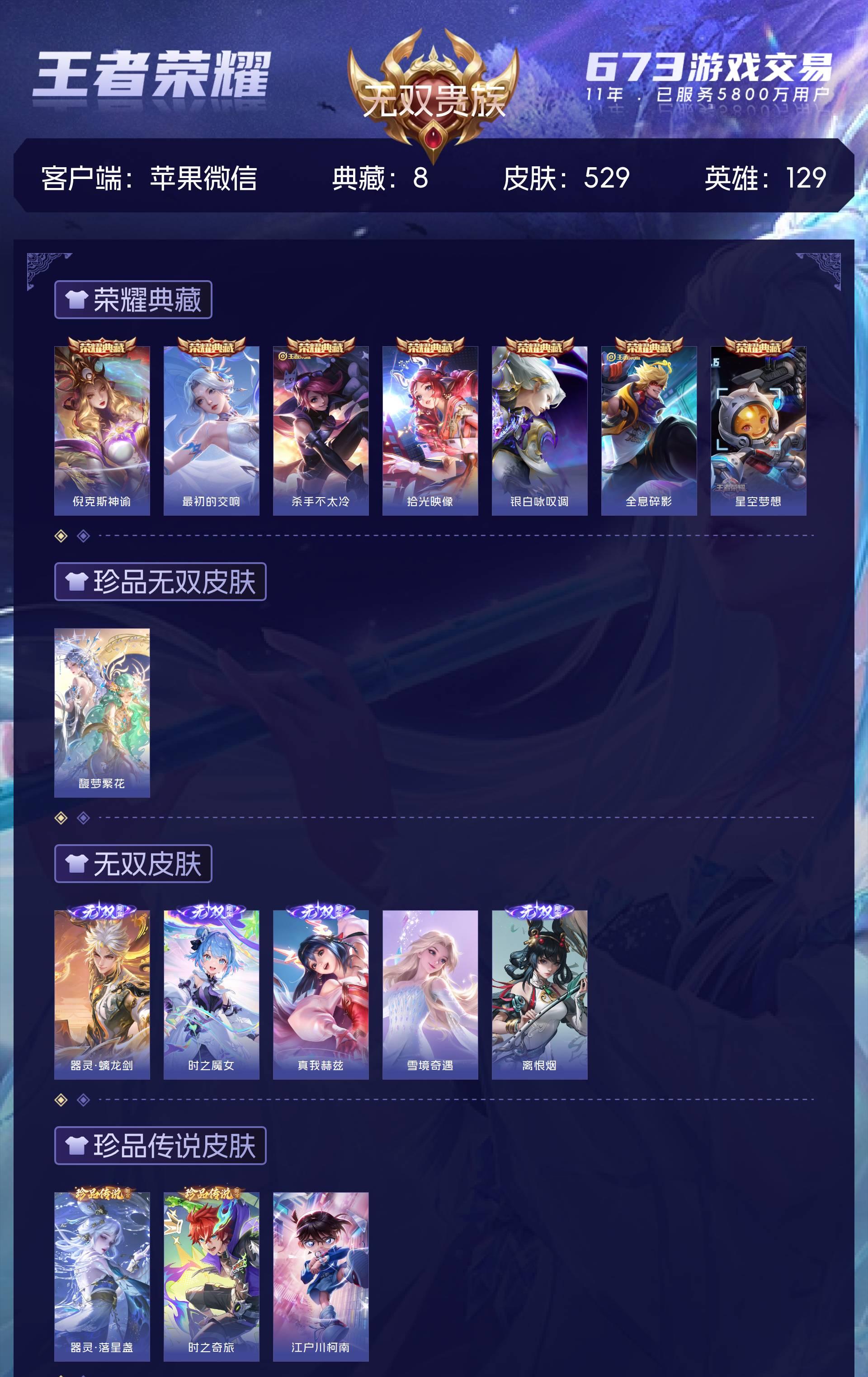 苹果微/至尊星耀/529皮肤/129英雄/7典藏/1珍品无双/5无双/3珍品传说/68传说/178